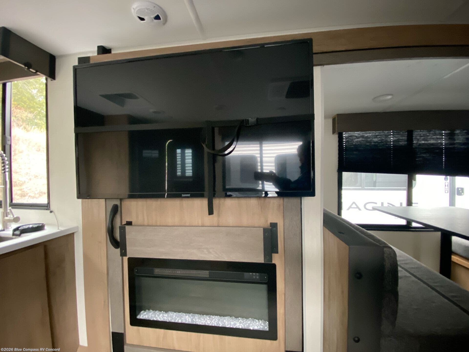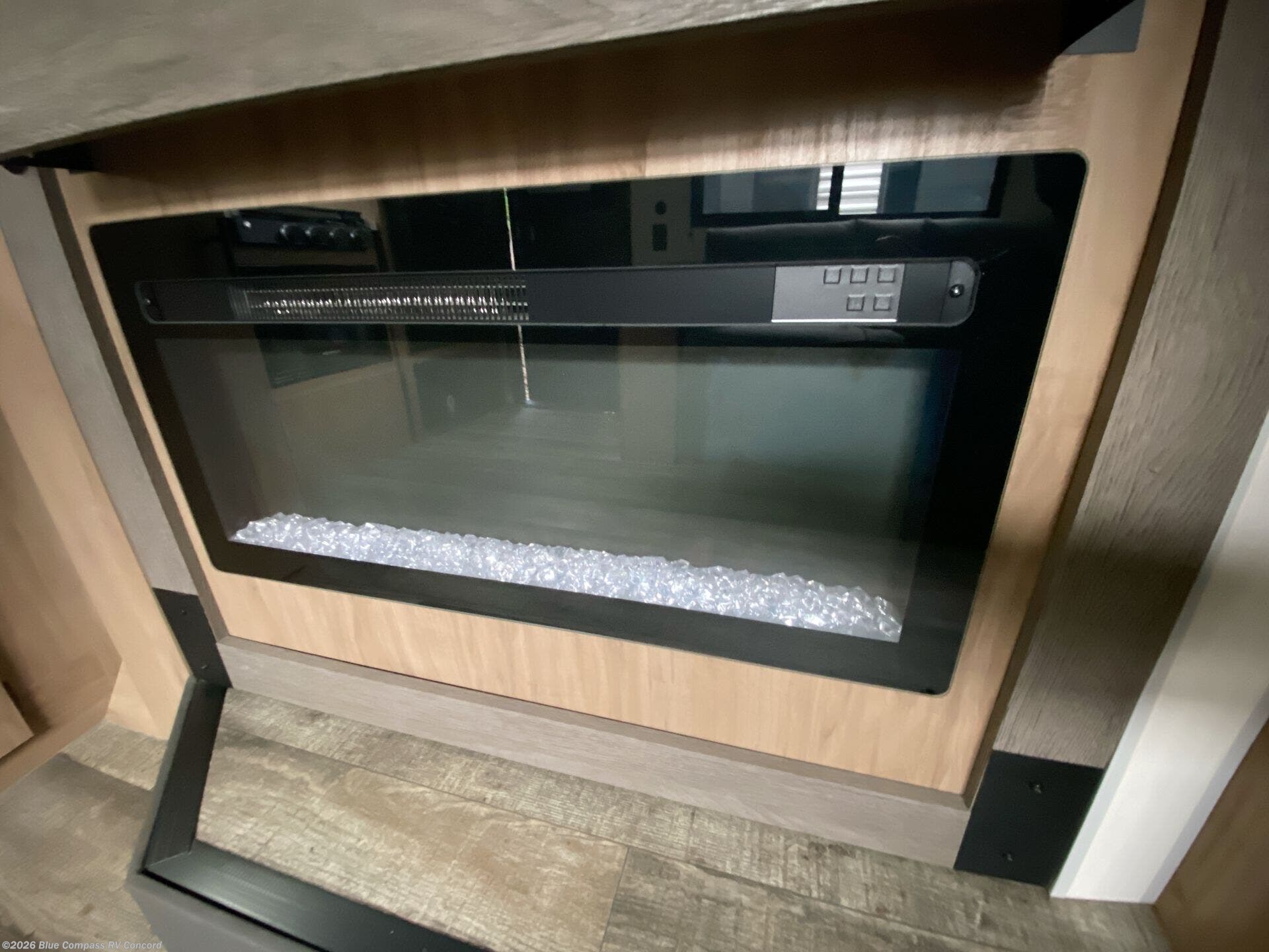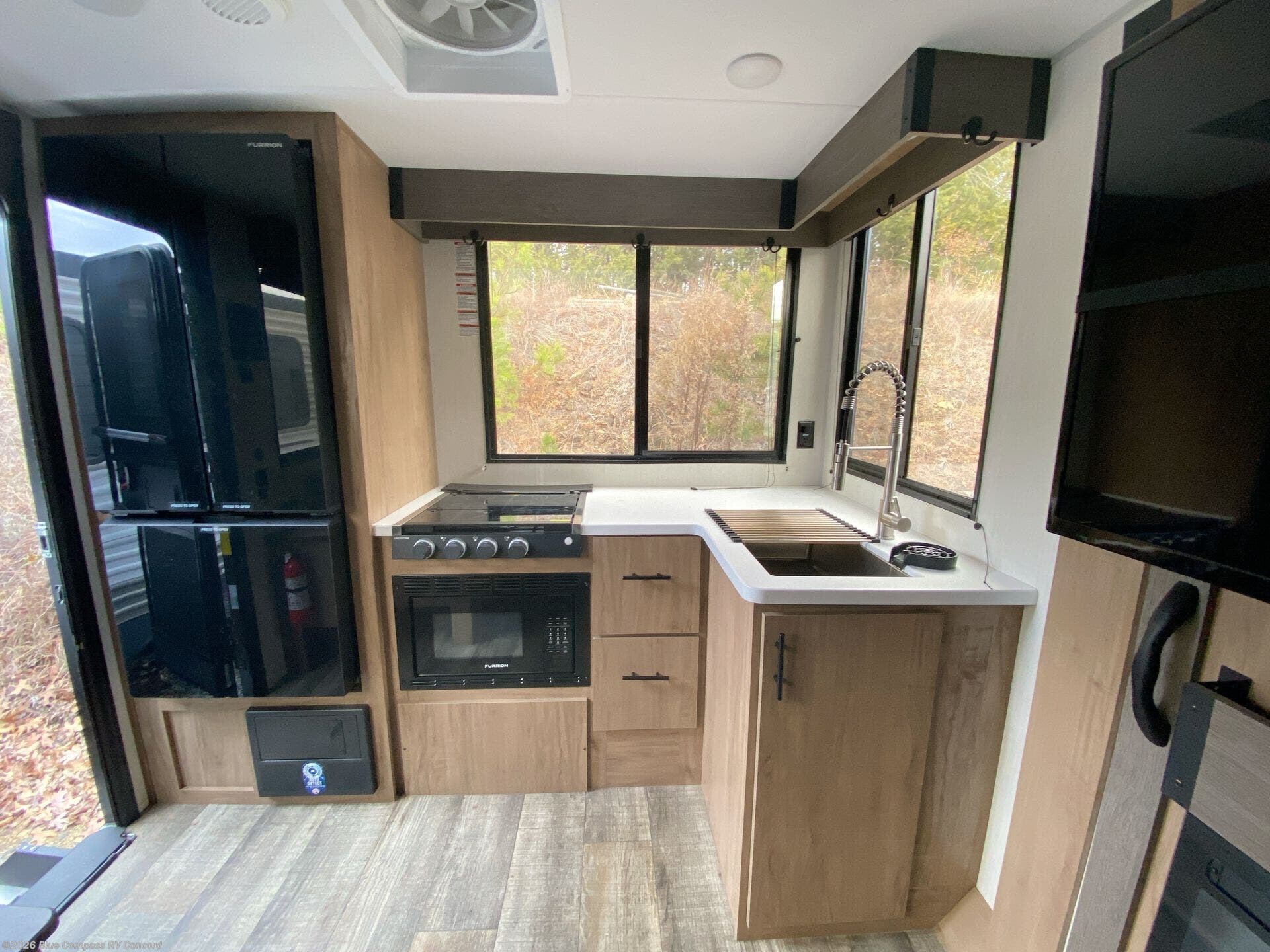 It won't be hard to find comfort in this spacious travel trailer! A front private bedroom is sure to make you feel right at home, and you'll find a bedside wardrobe, overhead cabinets, plus a TV mount if you choose to add entertainment here. In the main living area, your crew can relax on the sofa with panoramic windows behind it for great outdoor views. There is also a booth dinette within the large slide out. Ample storage is also found here, including hidden shelves behind the entertainment center with a fireplace. Head to the rear kitchen where you'll find generous counter space and all the appliances needed to make meals each day!