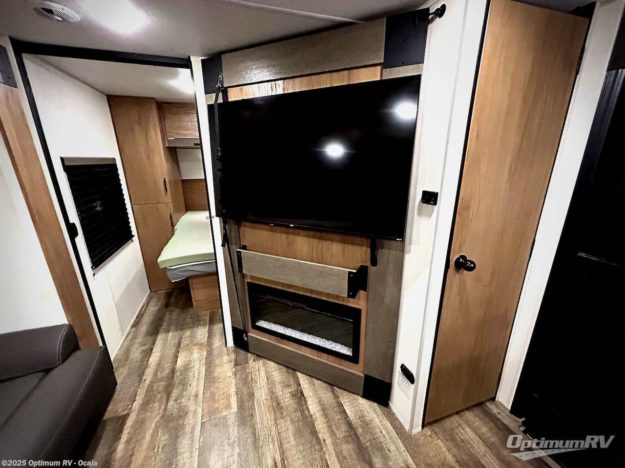 Camping with friends and family just got easier in this travel trailer that can sleep nine each night! The kids or your guest will love the double-size bunks with extra deep storage for their things, while you take the front private bedroom with a camp king bed. There is also a booth dinette and an extra thick cascade edge sofa for more sleeping and seating space. Panoramic windows give you wonderful views of your surroundings, and the fireplace inside will make your space feel more like home. There is an entertainment center with hidden shelves to store movies or books, plus a pantry for snacks galore. This model also includes a full bath with one of the dual entry doors for added convenience!