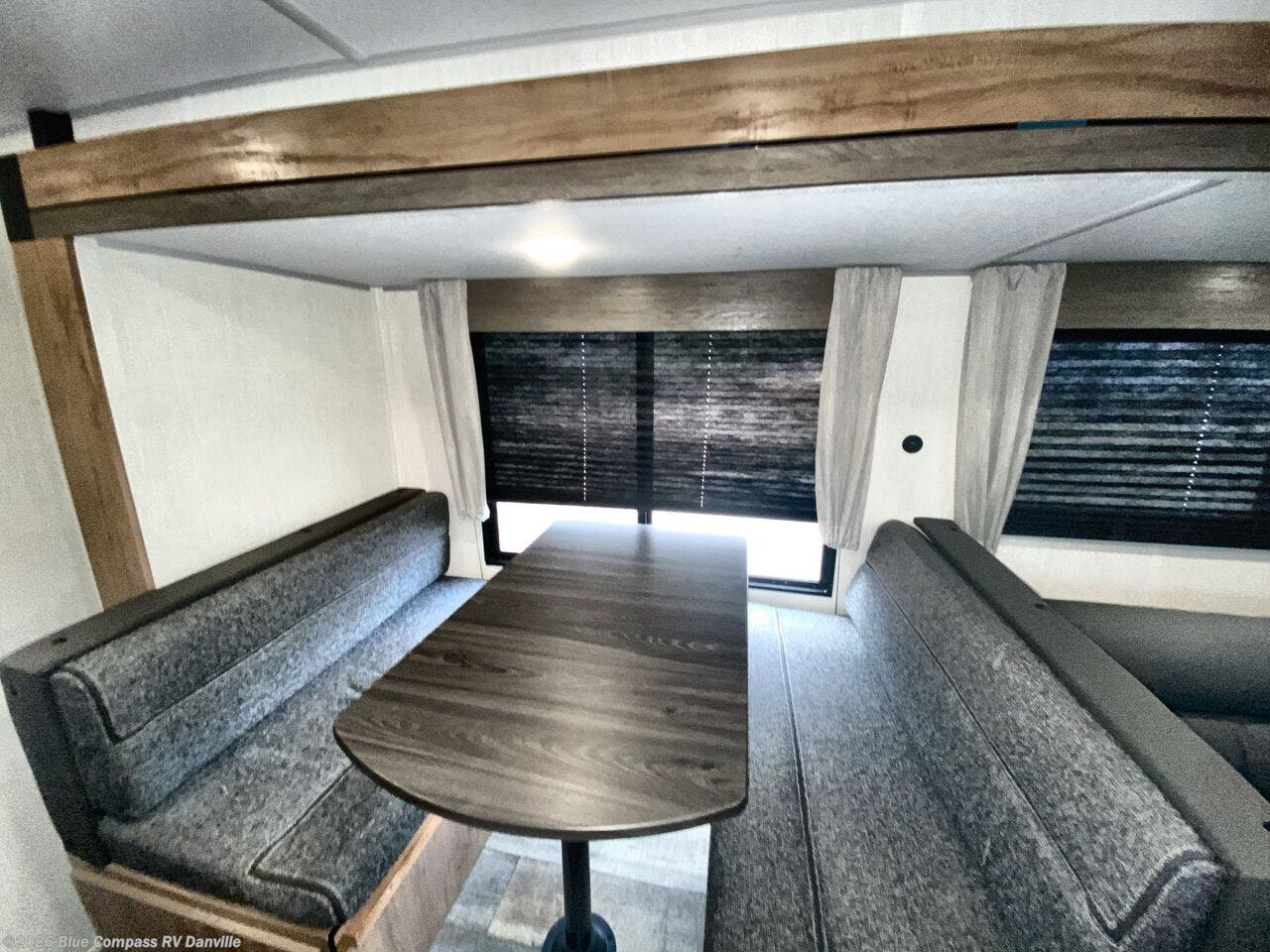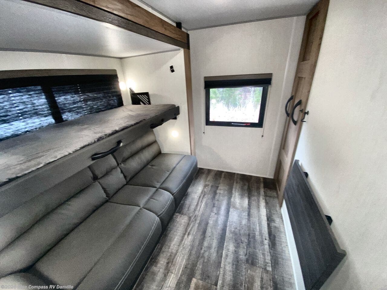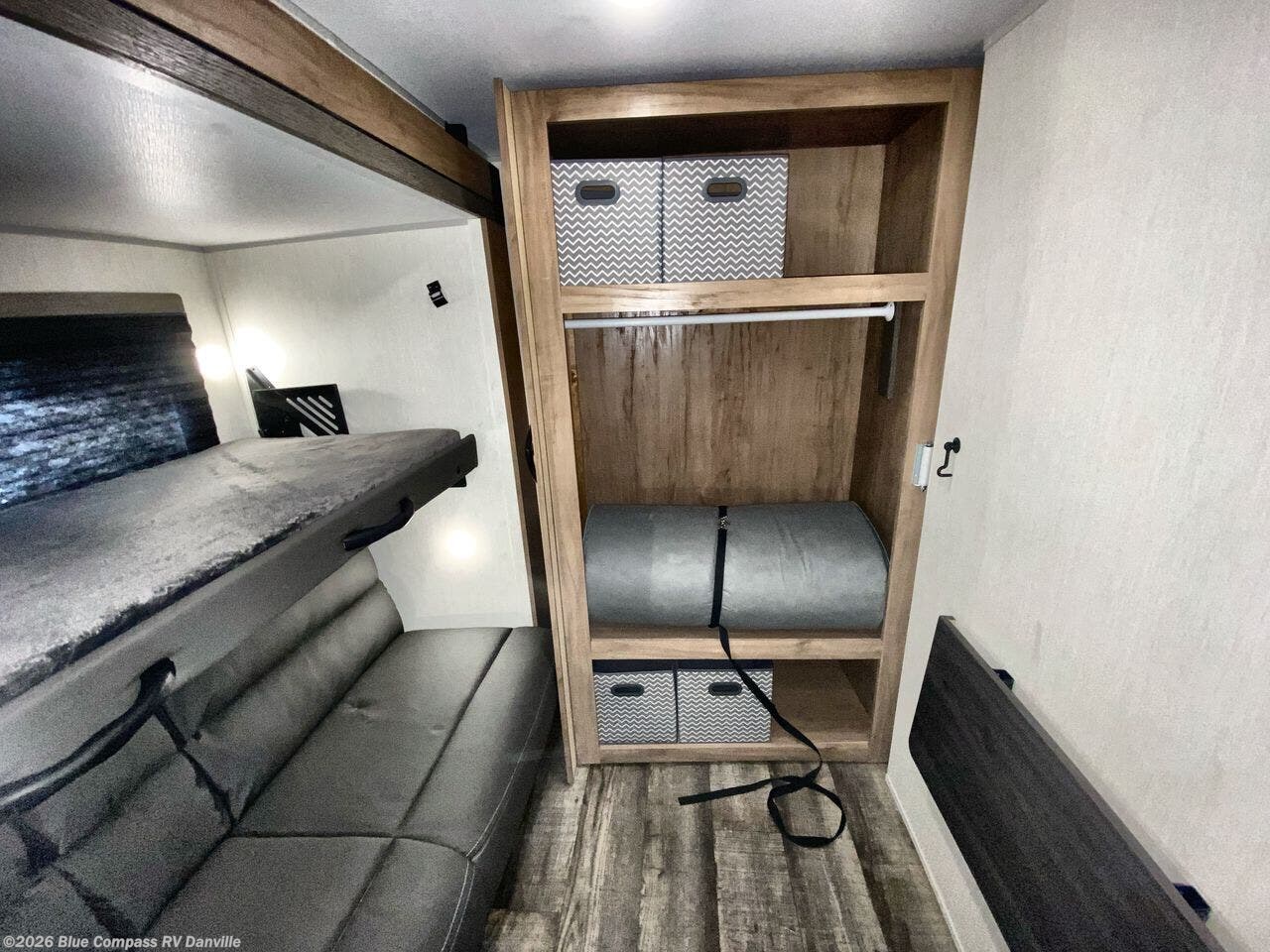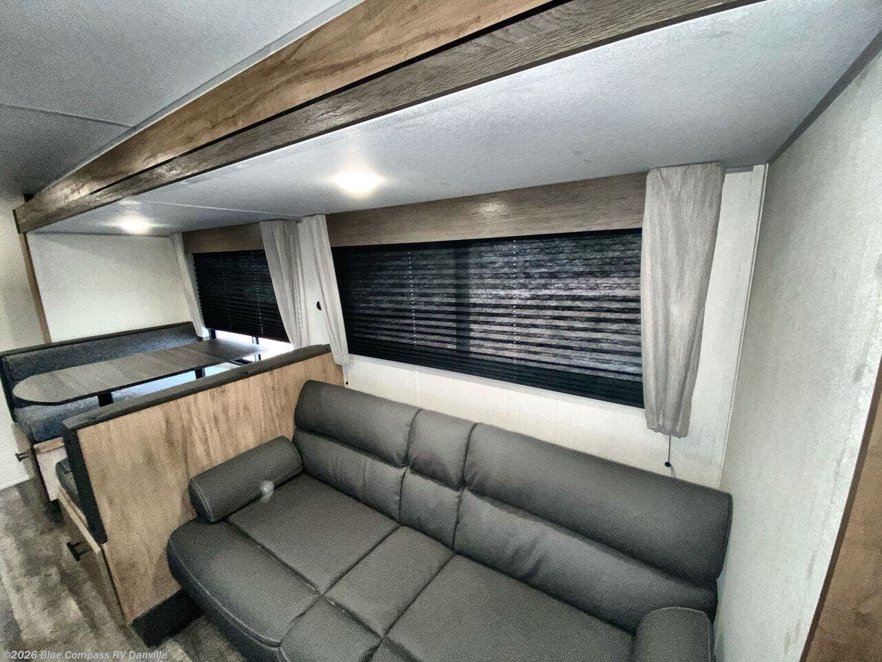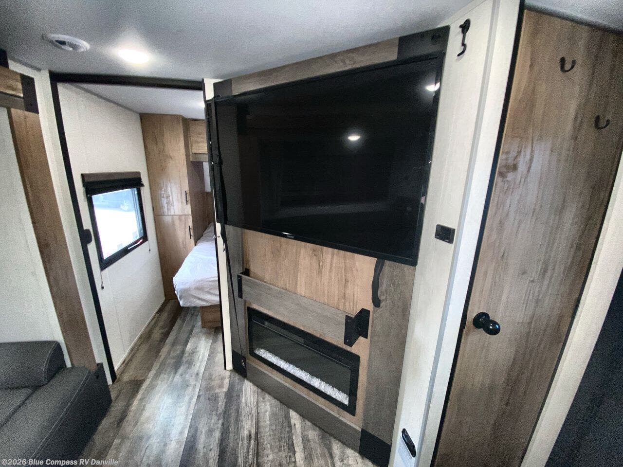 This travel trailer features a unique bunkhouse with a sofa and a bunk above plus a rolling cabinet with a bunk mat that can be rolled away during the day for extra floor space. The chef will have their choice to cook at the outside kitchen or stay warm inside by the fireplace. There is a booth dinette for dining space and a sofa to relax on, and the hidden shelves behind the entertainment center will be perfect for books, movies, or snacks! Having your own bedroom with a camp king bed will have you feeling right at home, and you can even bring a television along since there is TV prep here!