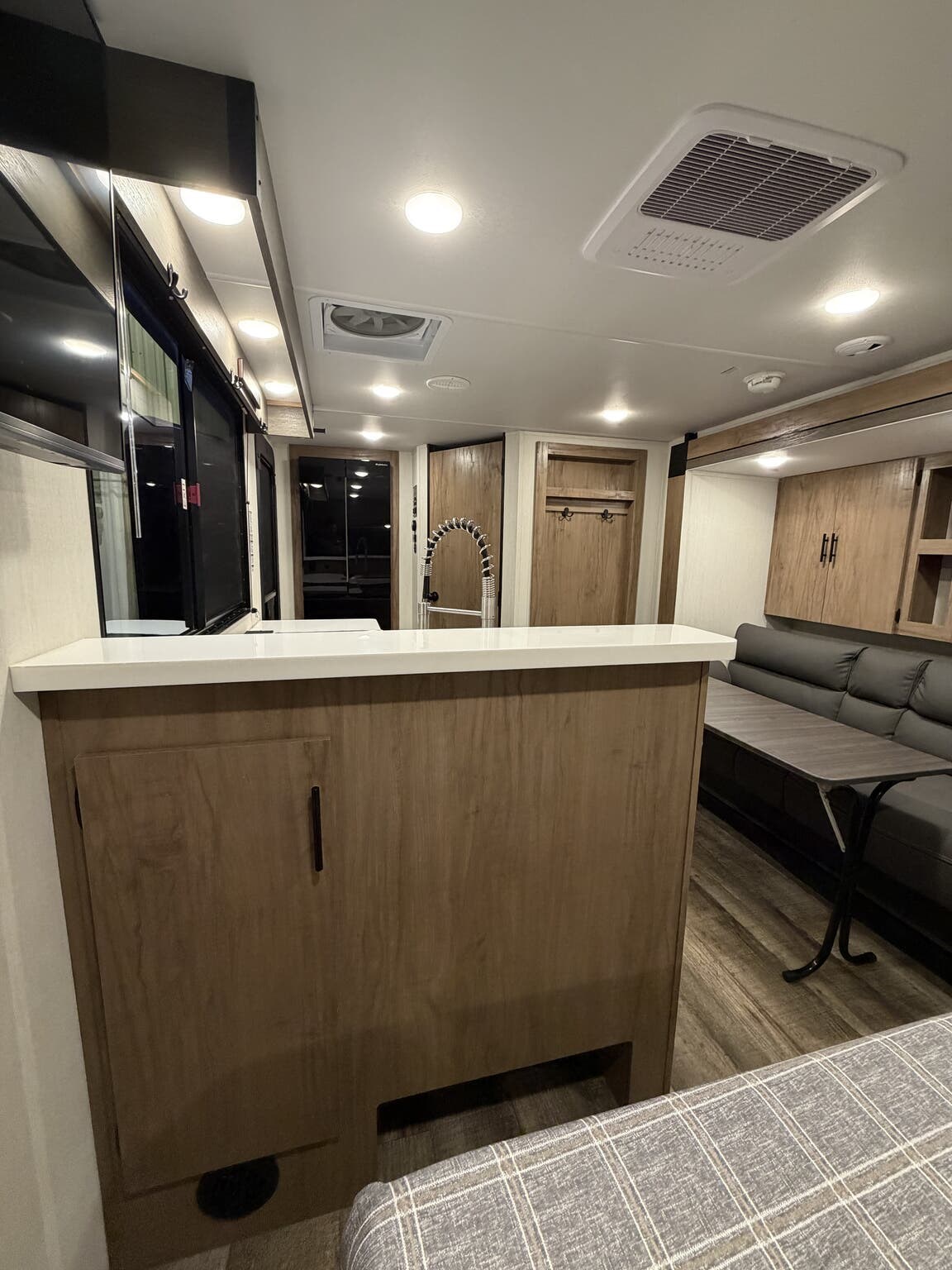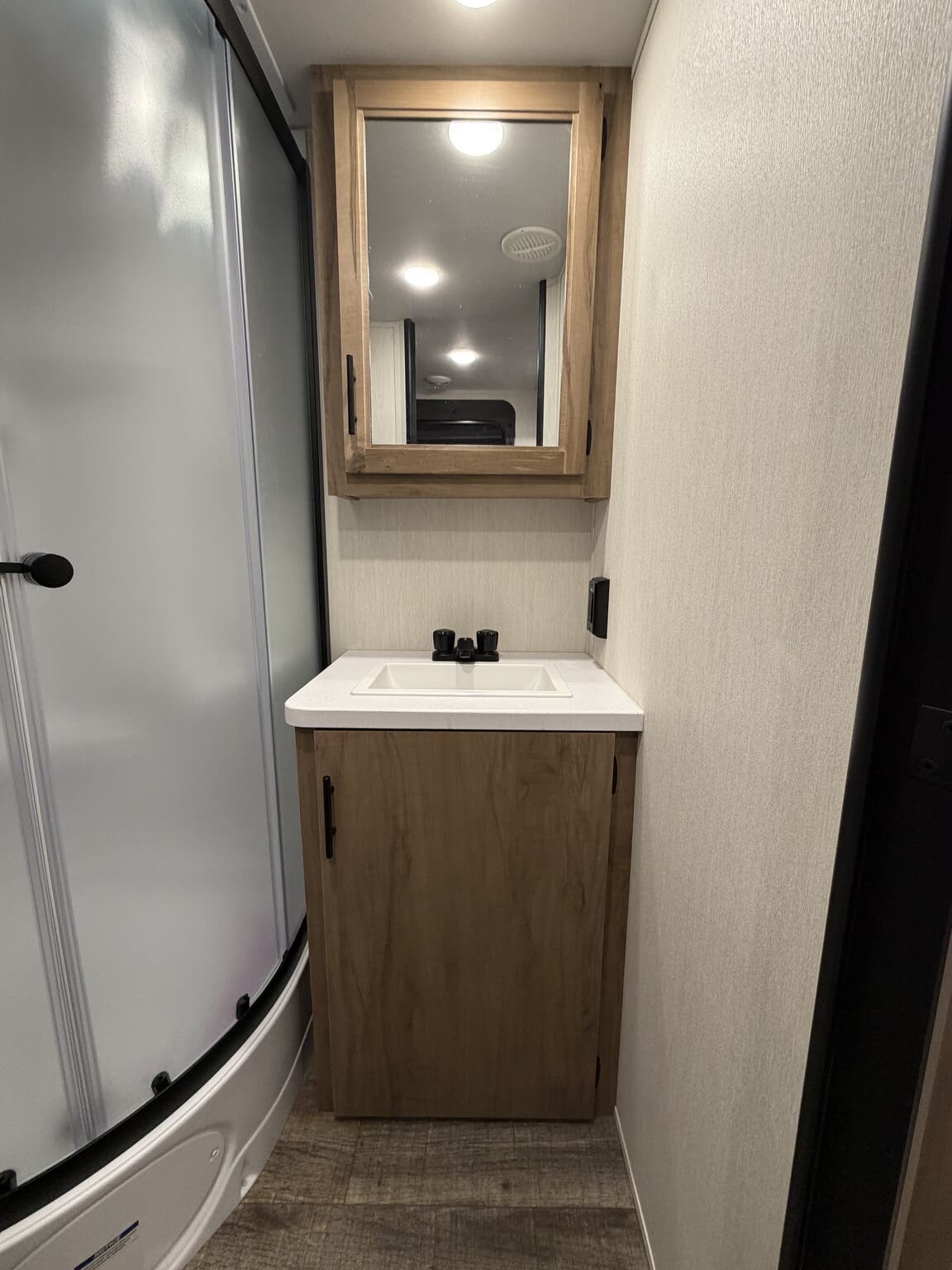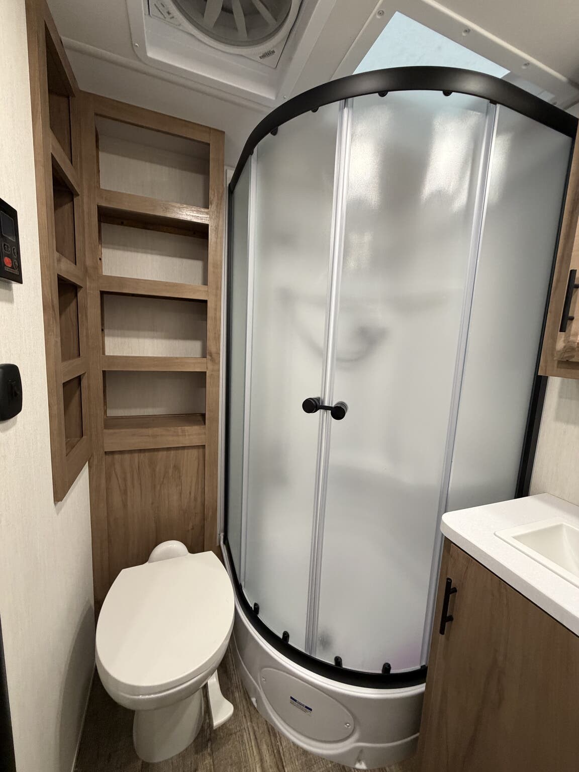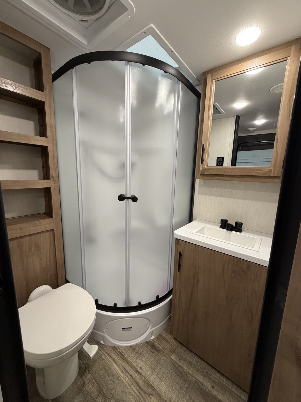 Glass Shower Door, King Size Bed, Kitchen Sink, Medicine Cabinet, Overhead Cabinetry, Pleated Shades, Removable Table, Roof Vents, Shower, Sofa Bed