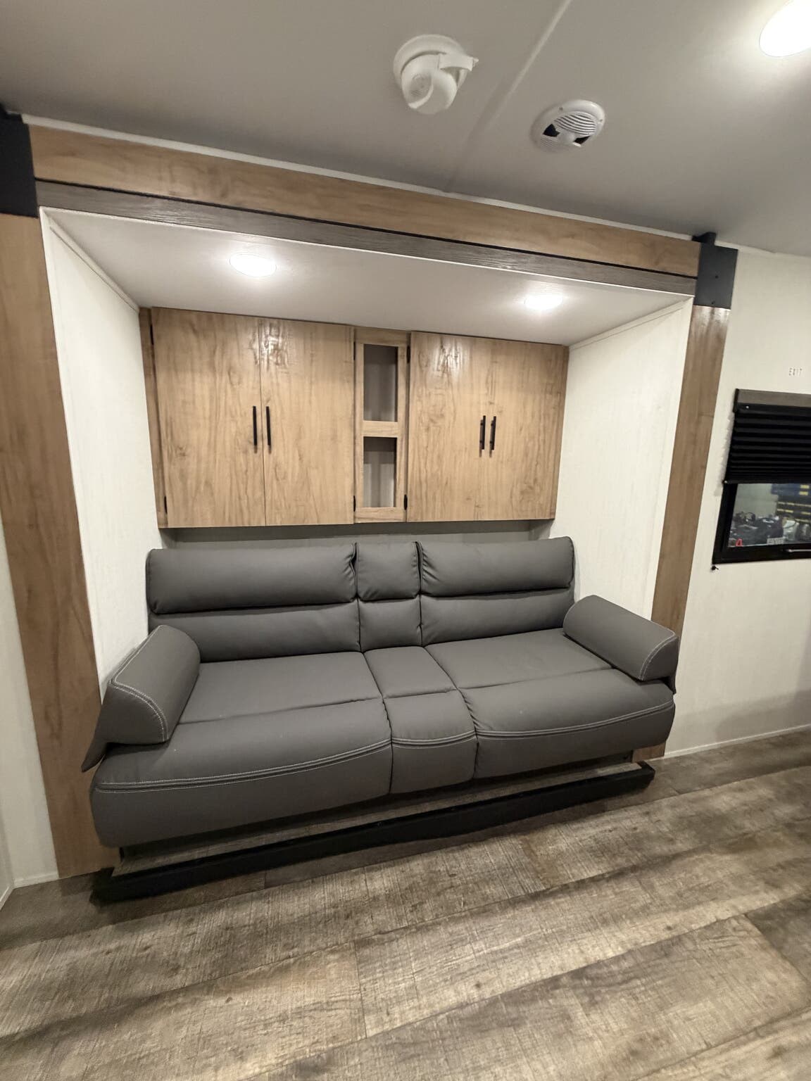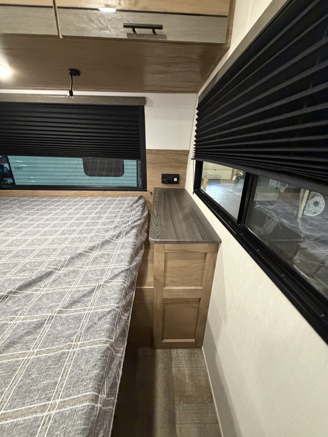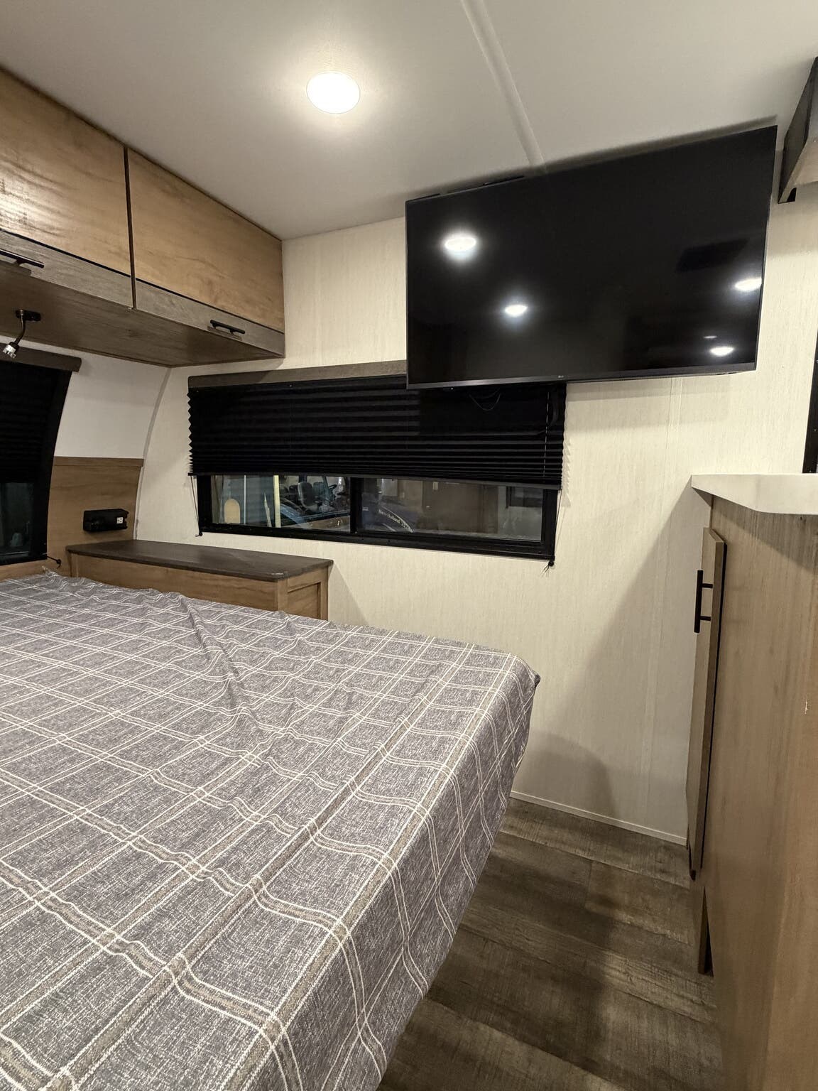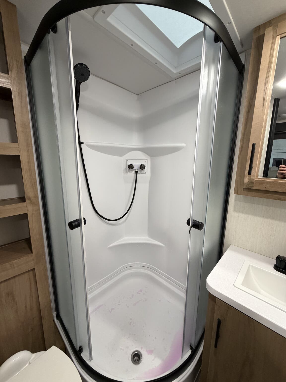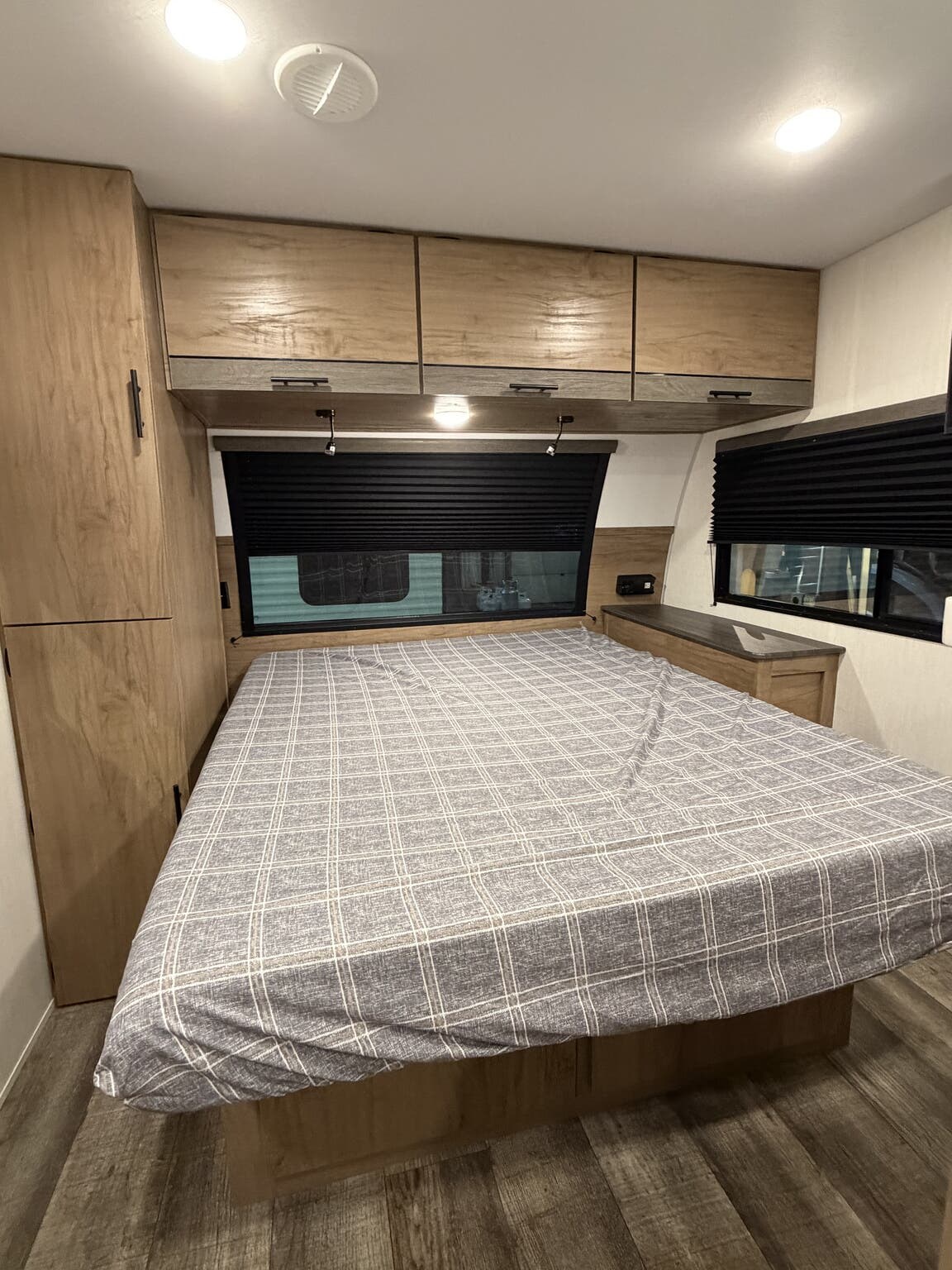 Glass Shower Door, King Size Bed, Kitchen Sink, Medicine Cabinet, Overhead Cabinetry, Pleated Shades, Removable Table, Roof Vents, Shower, Sofa Bed