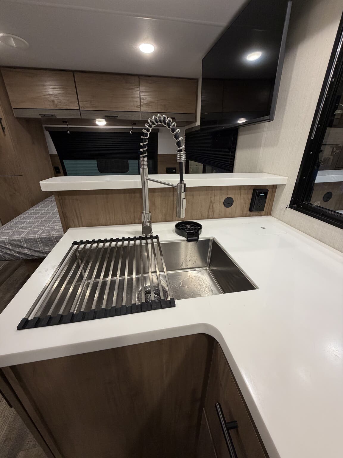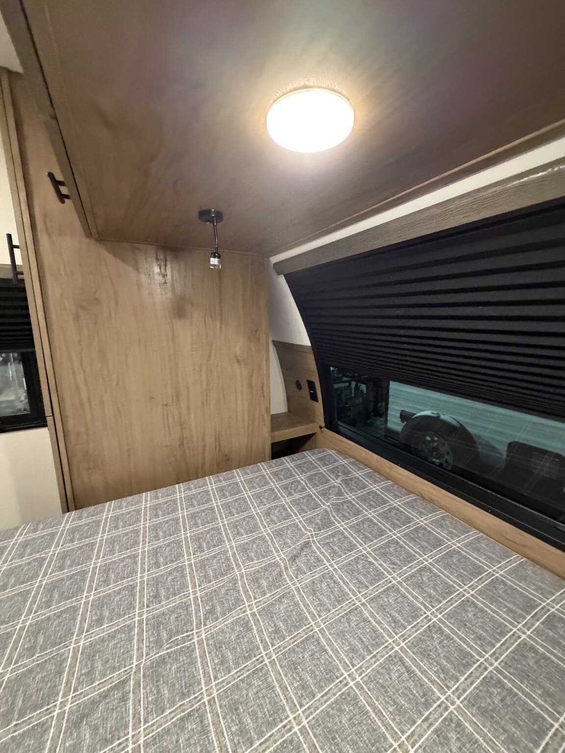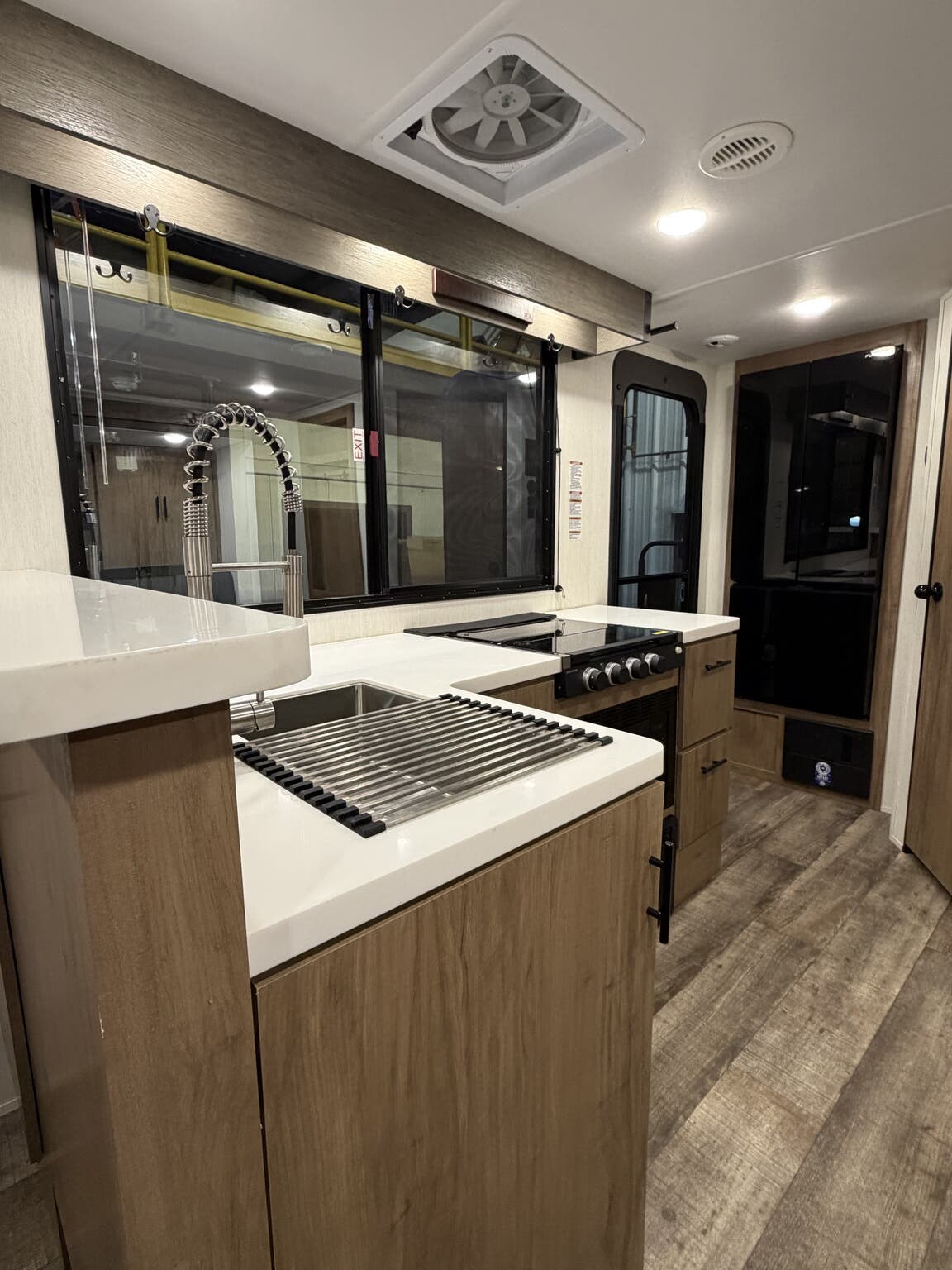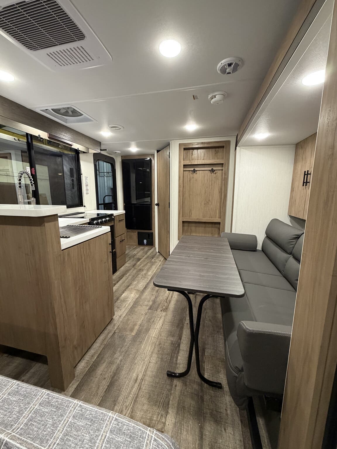 Glass Shower Door, King Size Bed, Kitchen Sink, Medicine Cabinet, Overhead Cabinetry, Pleated Shades, Removable Table, Roof Vents, Shower, Sofa Bed