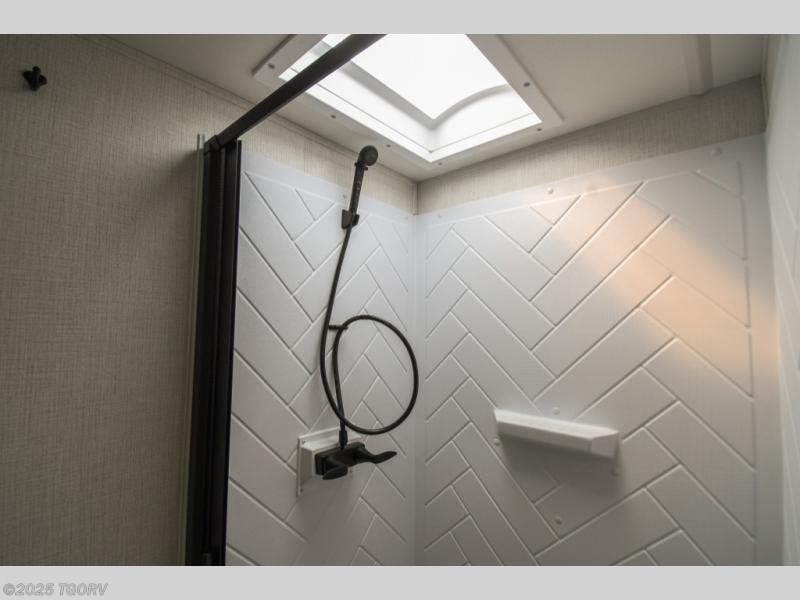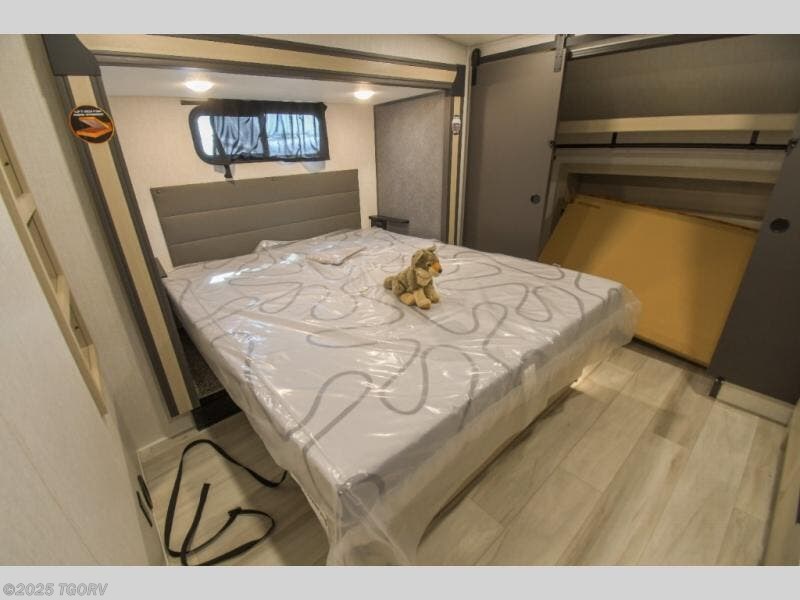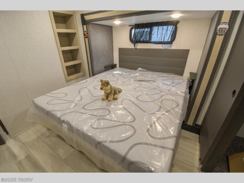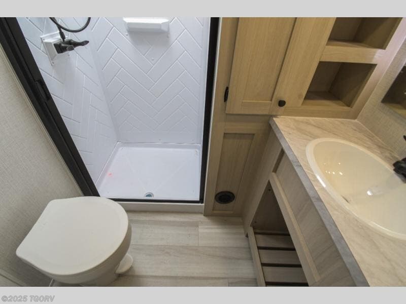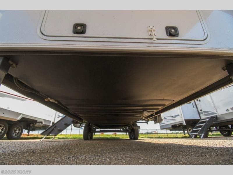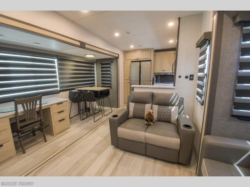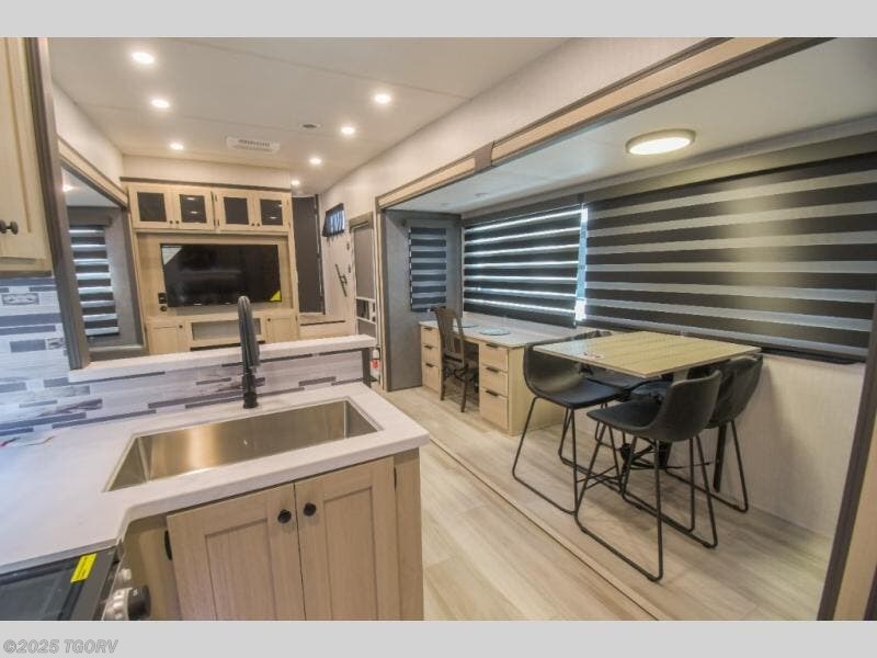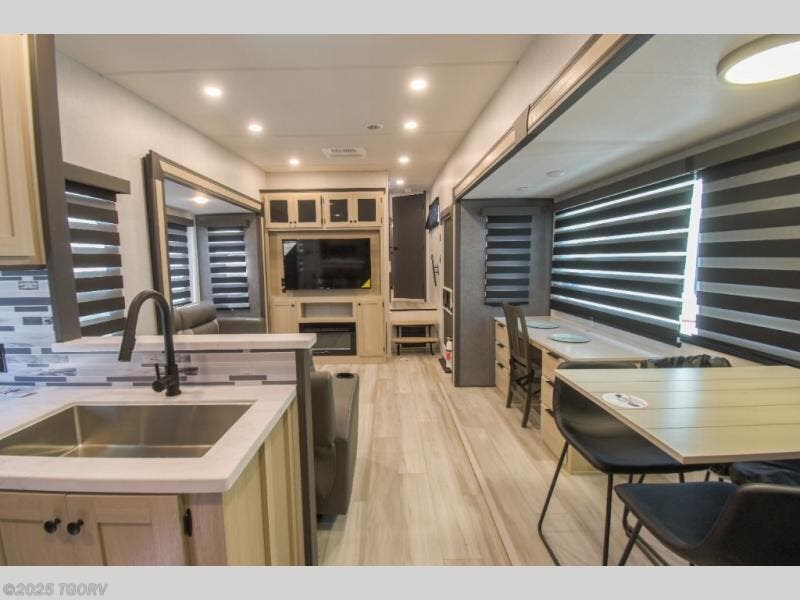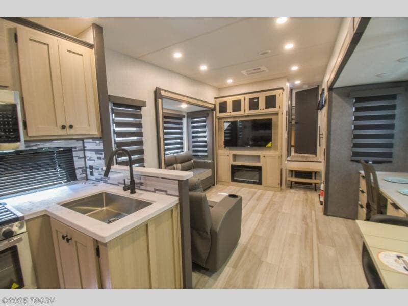 Cook like a chef worthy of a Michelin star in this amazing fifth wheel! Inside, you'll find a spacious rear kitchen, complete with a pantry, a 12V refrigerator ideal for keeping your fruits and vegetables fresh, overhead cabinets, and a sprawling countertop for all your cooking and dining times. The high-top table and chairs provide the perfect place to enjoy meals with family and friends. The living room is a cozy place featuring comfortable theater seating, a tri-fold sofa, a cozy fireplace, an entertainment center, and a convenient desk for staying productive on the go. The full bathroom is also a great place to freshen up, complete with a linen closet and all the amenities you need to take a bath and feel at home. With a spacious shower and plenty of storage, you'll have everything you need to start your day off right. The perfect place to rest and recharge after a long day of adventure is the front bedroom which boasts a comfortable king bed, dresser, walk-in wardrobe with washer and dryer prep, for keeping all your favorite belongings clean and organized on the road. Outside, you'll appreciate the pass-through storage for all your gear and toys, as well as the two awnings (15' and 11') ideal for creating unforgettable memories outside without worrying about the weather.