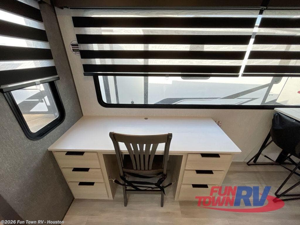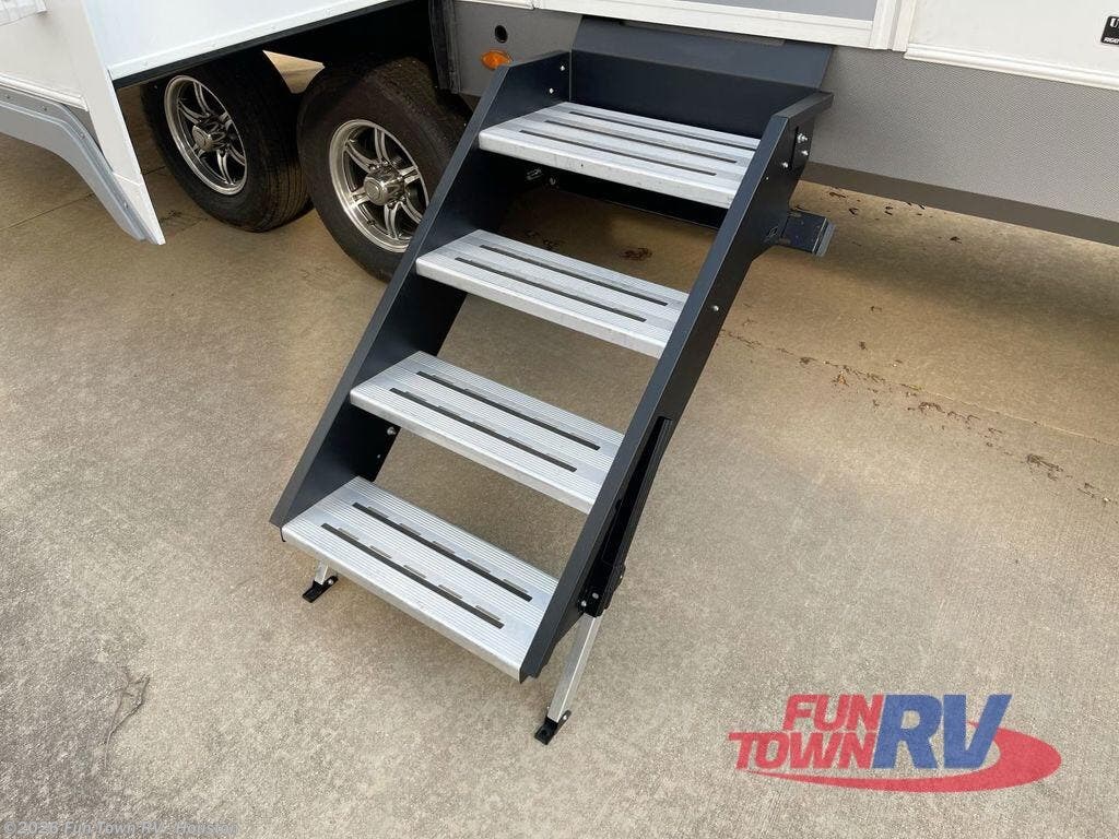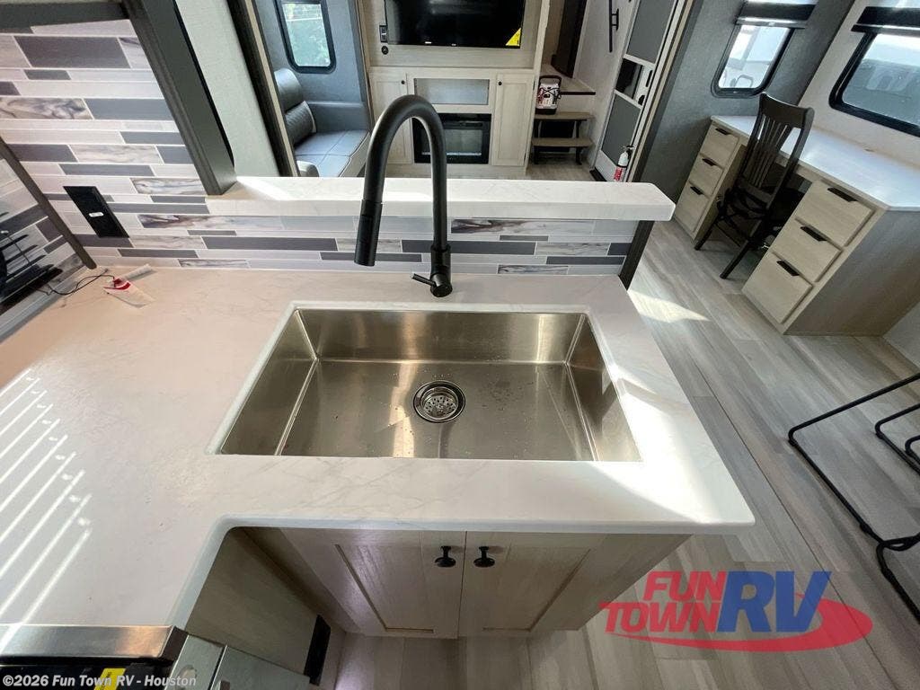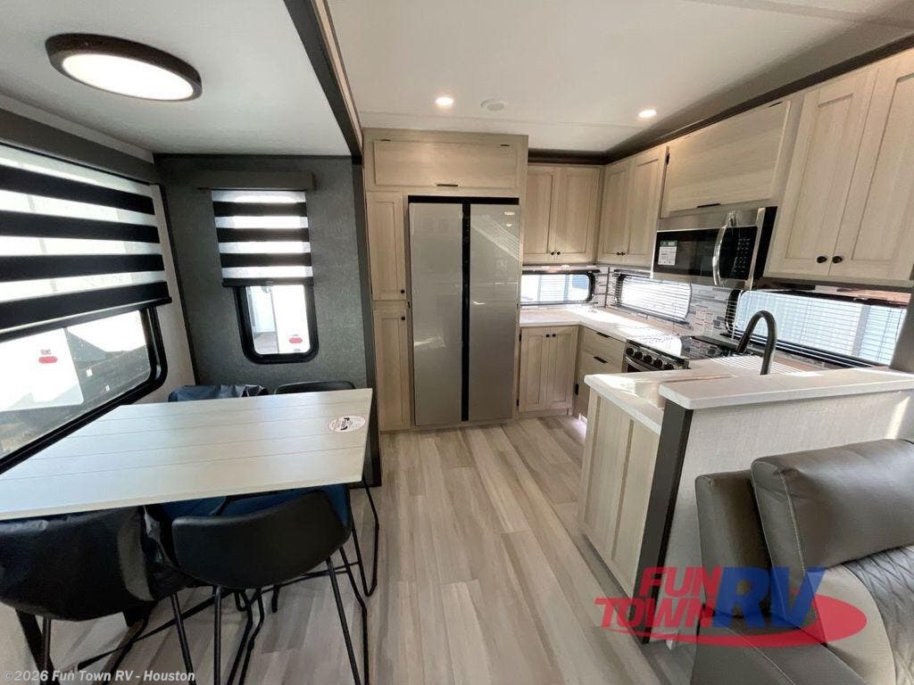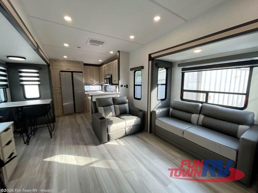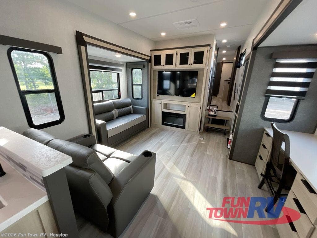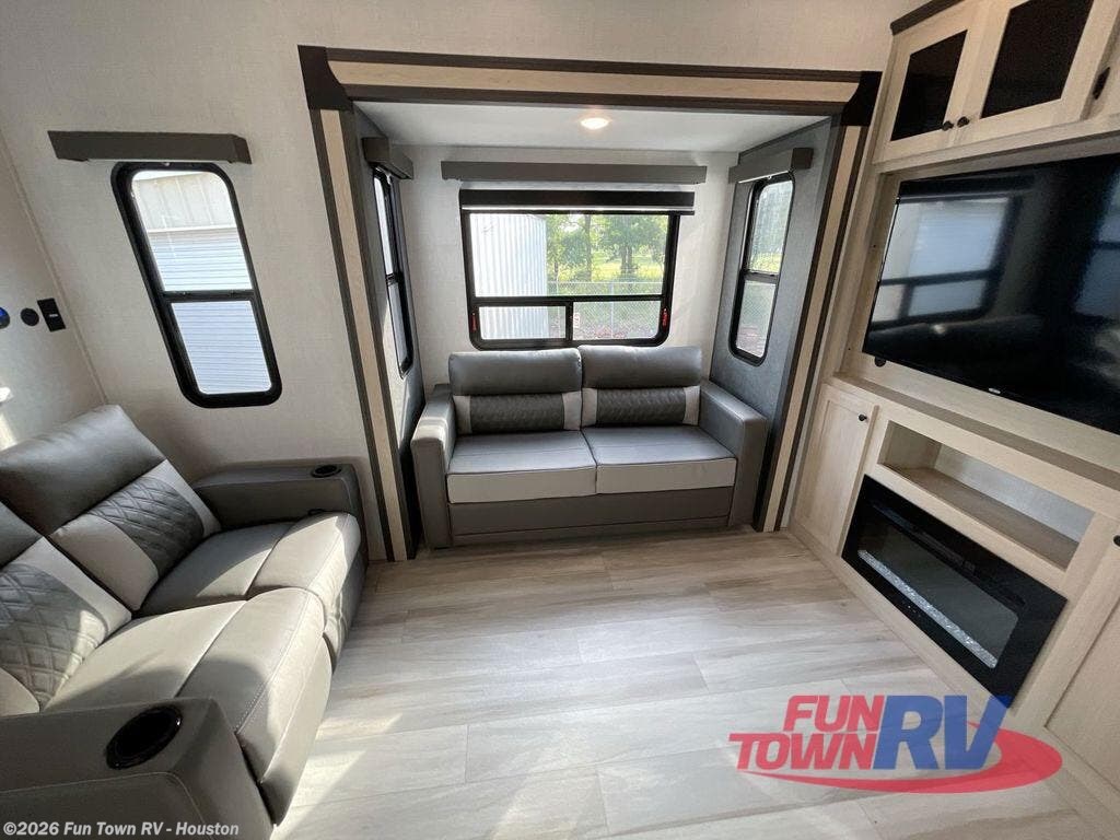 Cook like a chef worthy of a Michelin star in this amazing fifth wheel! Inside, you'll find a spacious rear kitchen, complete with a pantry, a 12V refrigerator ideal for keeping your fruits and vegetables fresh, overhead cabinets, and a sprawling countertop for all your cooking and dining times. The high-top table and chairs provide the perfect place to enjoy meals with family and friends. The living room is a cozy place featuring comfortable theater seating, a tri-fold sofa, a cozy fireplace, an entertainment center, and a convenient desk for staying productive on the go. The full bathroom is also a great place to freshen up, complete with a linen closet and all the amenities you need to take a bath and feel at home. With a spacious shower and plenty of storage, you'll have everything you need to start your day off right. The perfect place to rest and recharge after a long day of adventure is the front bedroom which boasts a comfortable king bed, dresser, walk-in wardrobe with washer and dryer prep, for keeping all your favorite belongings clean and organized on the road. Outside, you'll appreciate the pass-through storage for all your gear and toys, as well as the two awnings (15' and 11') ideal for creating unforgettable memories outside without worrying about the weather.