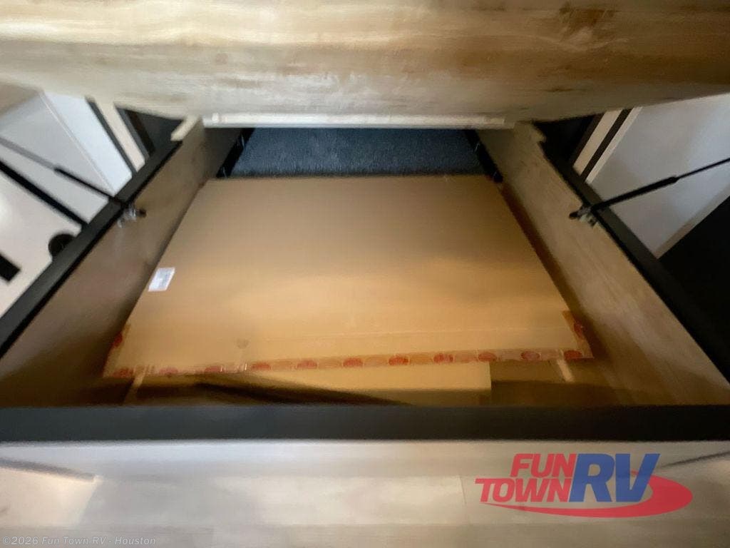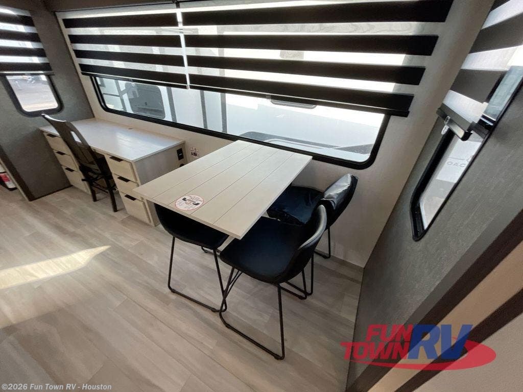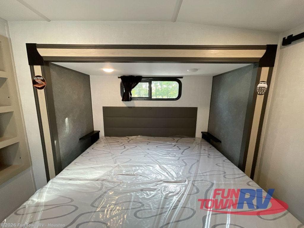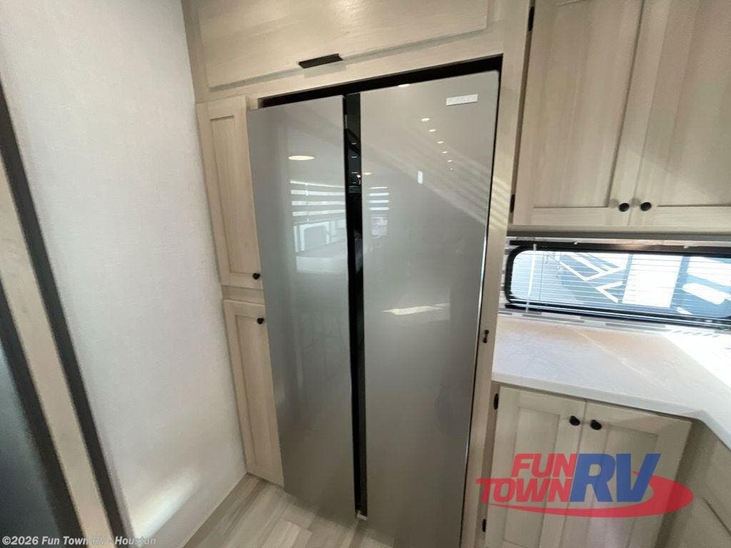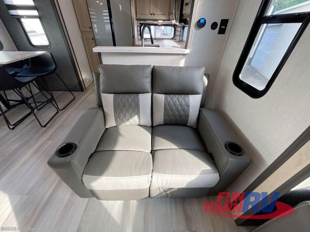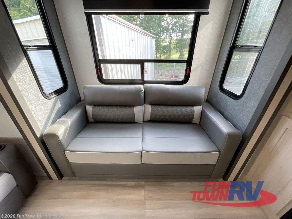 Cook like a chef worthy of a Michelin star in this amazing fifth wheel! Inside, you'll find a spacious rear kitchen, complete with a pantry, a 12V refrigerator ideal for keeping your fruits and vegetables fresh, overhead cabinets, and a sprawling countertop for all your cooking and dining times. The high-top table and chairs provide the perfect place to enjoy meals with family and friends. The living room is a cozy place featuring comfortable theater seating, a tri-fold sofa, a cozy fireplace, an entertainment center, and a convenient desk for staying productive on the go. The full bathroom is also a great place to freshen up, complete with a linen closet and all the amenities you need to take a bath and feel at home. With a spacious shower and plenty of storage, you'll have everything you need to start your day off right. The perfect place to rest and recharge after a long day of adventure is the front bedroom which boasts a comfortable king bed, dresser, walk-in wardrobe with washer and dryer prep, for keeping all your favorite belongings clean and organized on the road. Outside, you'll appreciate the pass-through storage for all your gear and toys, as well as the two awnings (15' and 11') ideal for creating unforgettable memories outside without worrying about the weather.