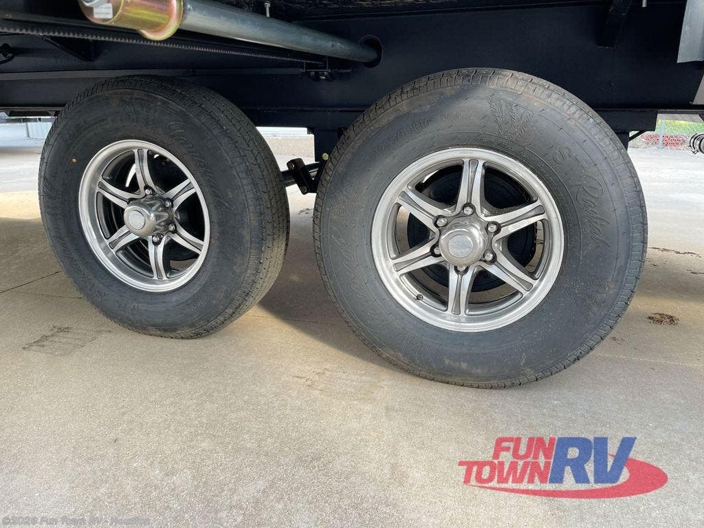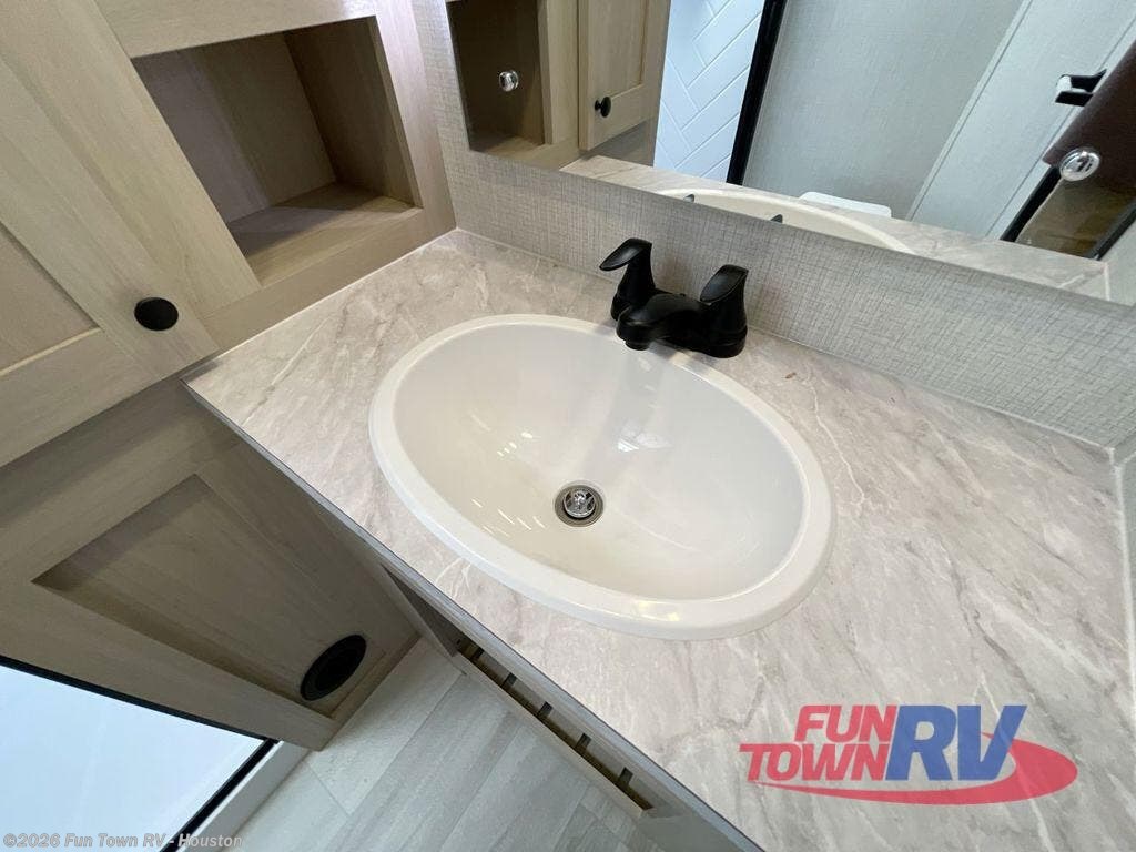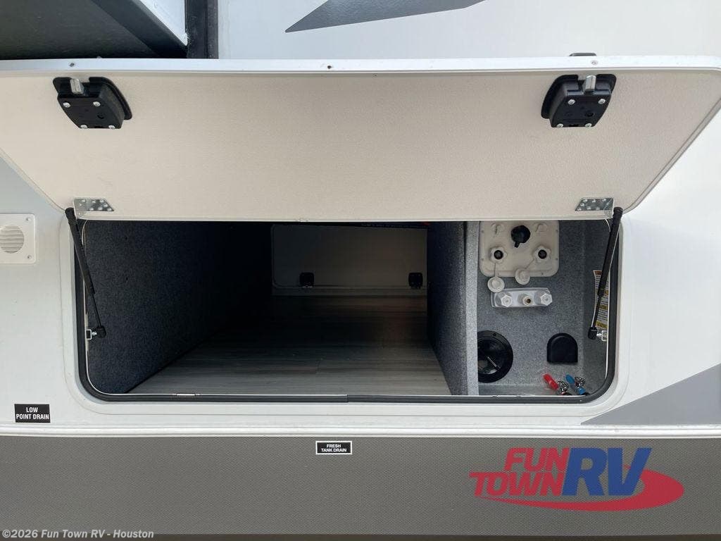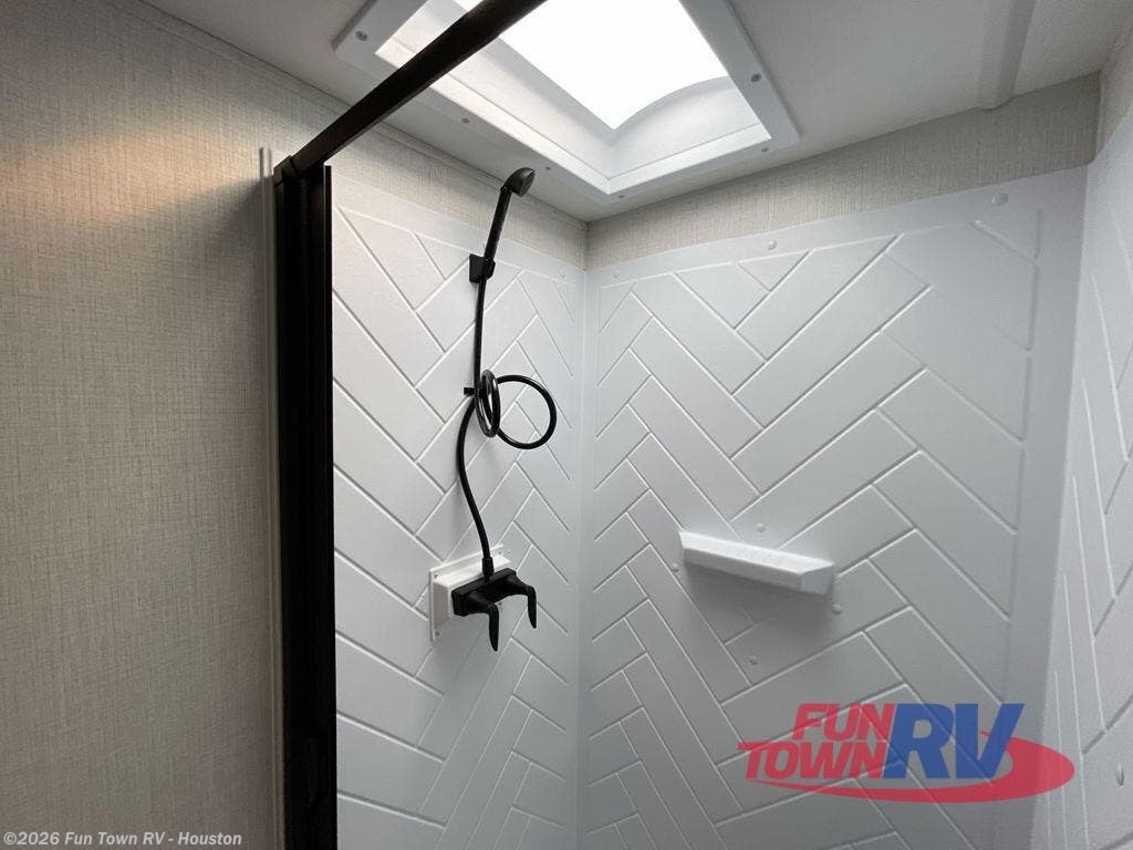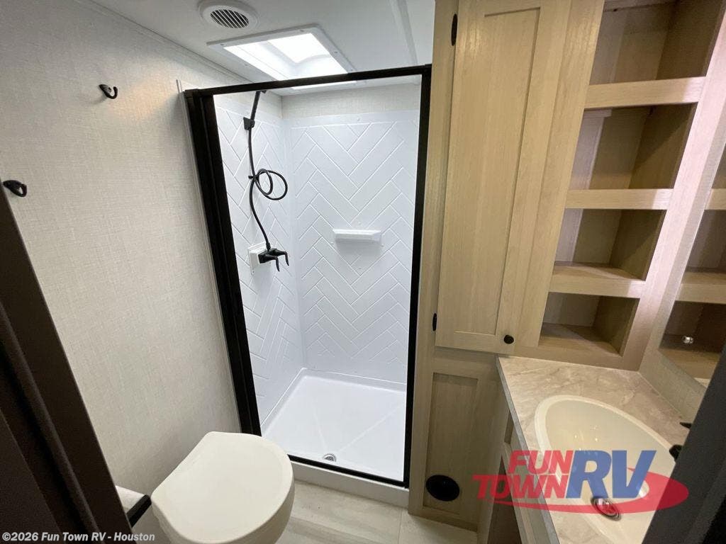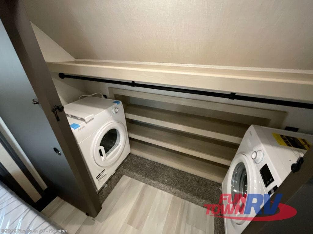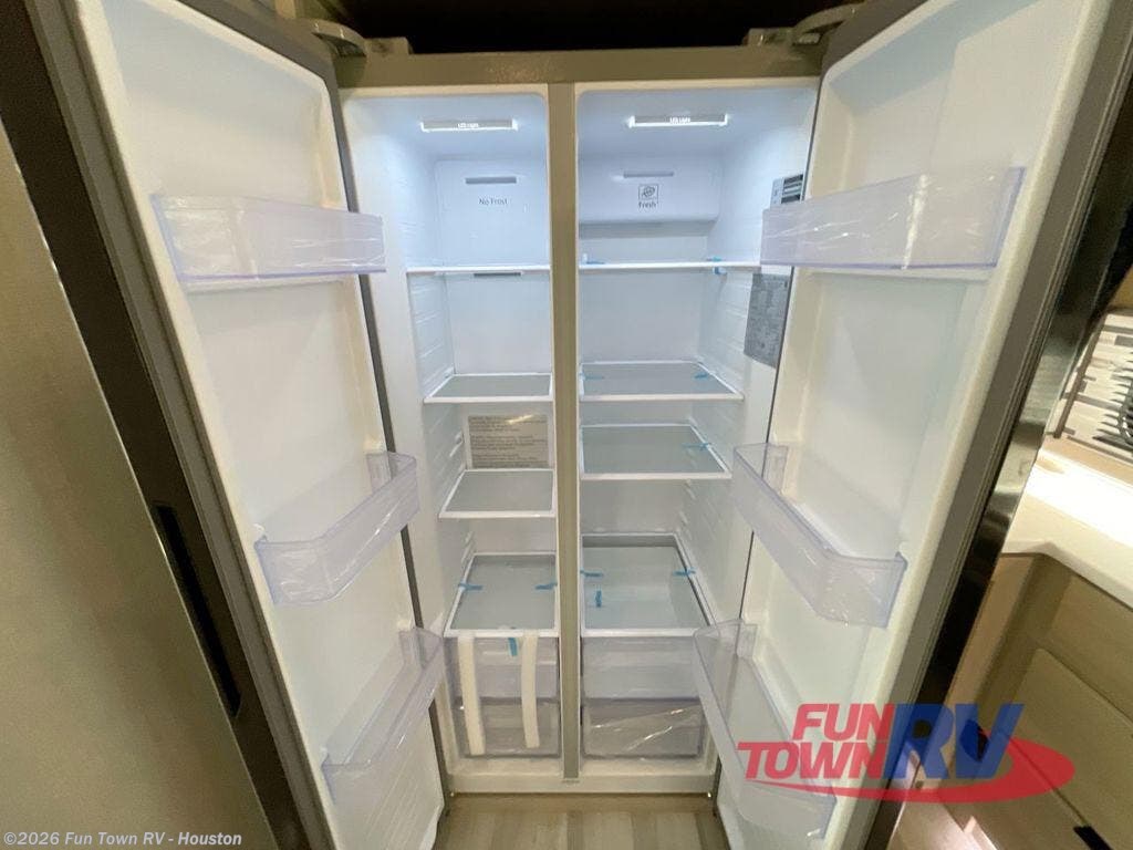 Cook like a chef worthy of a Michelin star in this amazing fifth wheel! Inside, you'll find a spacious rear kitchen, complete with a pantry, a 12V refrigerator ideal for keeping your fruits and vegetables fresh, overhead cabinets, and a sprawling countertop for all your cooking and dining times. The high-top table and chairs provide the perfect place to enjoy meals with family and friends. The living room is a cozy place featuring comfortable theater seating, a tri-fold sofa, a cozy fireplace, an entertainment center, and a convenient desk for staying productive on the go. The full bathroom is also a great place to freshen up, complete with a linen closet and all the amenities you need to take a bath and feel at home. With a spacious shower and plenty of storage, you'll have everything you need to start your day off right. The perfect place to rest and recharge after a long day of adventure is the front bedroom which boasts a comfortable king bed, dresser, walk-in wardrobe with washer and dryer prep, for keeping all your favorite belongings clean and organized on the road. Outside, you'll appreciate the pass-through storage for all your gear and toys, as well as the two awnings (15' and 11') ideal for creating unforgettable memories outside without worrying about the weather.