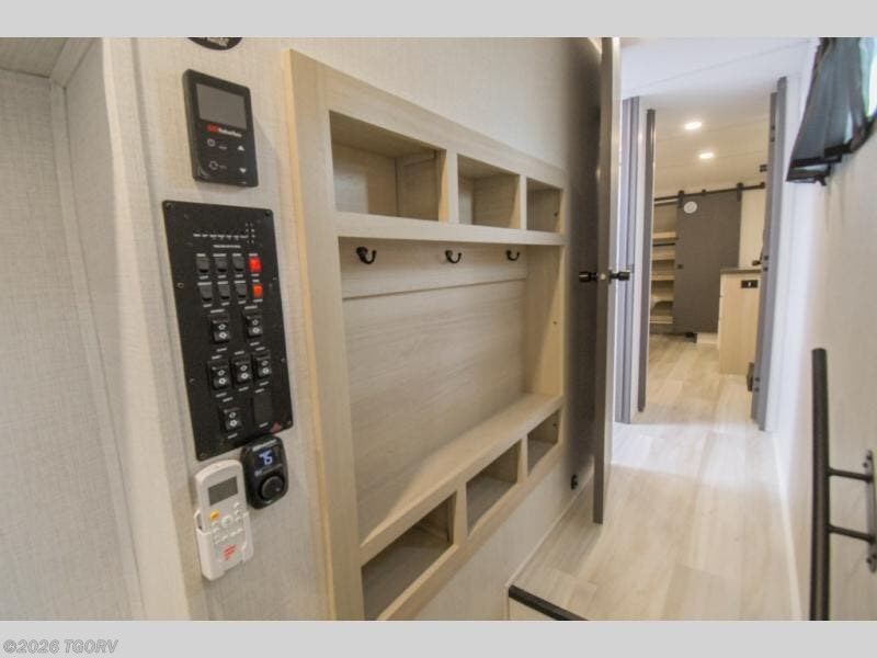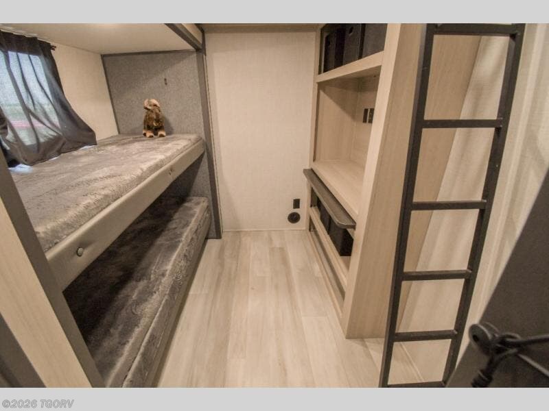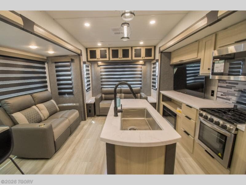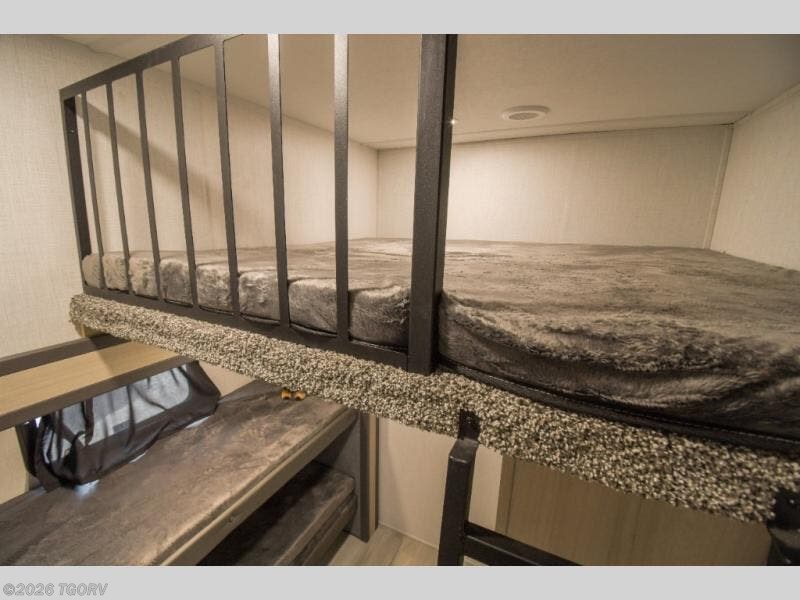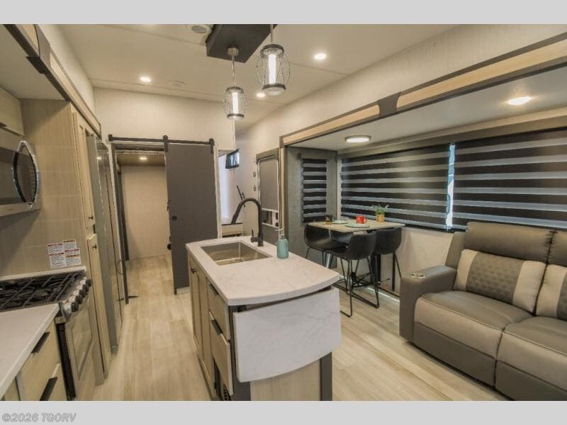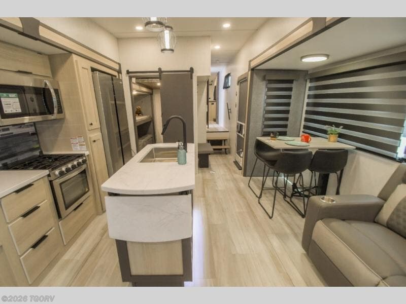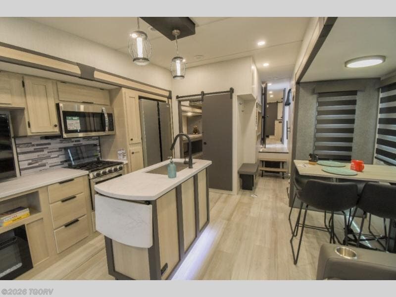 Wow! You won't believe the features found in this luxury fifth wheel that can sleep up to nine each night! Your guests or the kids will absolutely love the middle bunkroom with triple bunks and a loft above for even more sleeping or storage space. There is also a pull-out desk here, which will allow you to utilize this space as an office as well! You'll have your own space in the front private bedroom on the king bed slide out, and there is a walk-in wardrobe to keep your clothes tidy. There is even washer and dryer prep for the option to keep those clothes clean! The chef of your group will have everything they need to prepare meals, including a 21" 2-in-1 oven range, an over-the-range microwave, a 16 cu. ft. 12V refrigerator, plus a kitchen island for more counter space. In the evenings, your crew can get cozy on the rear sofa and theater seats across from the entertainment center and fireplace, or you might just play a game at the hi-top table and chairs!