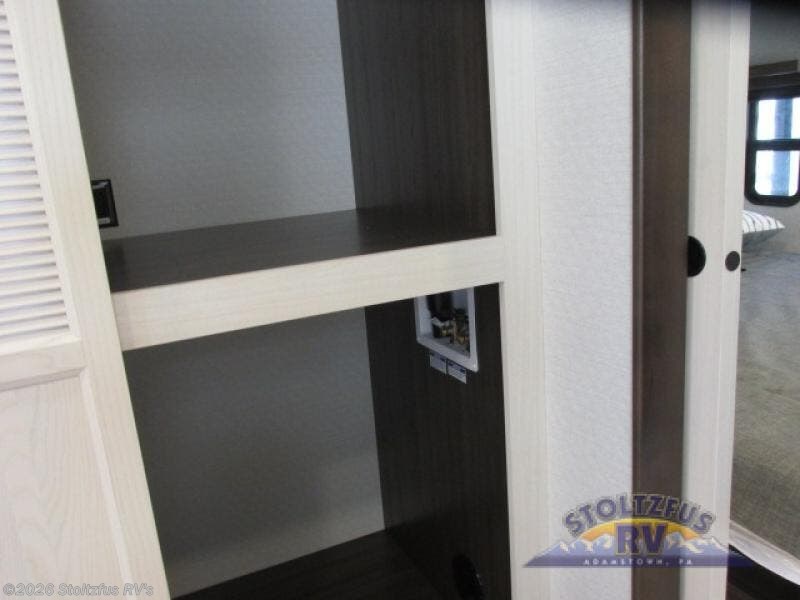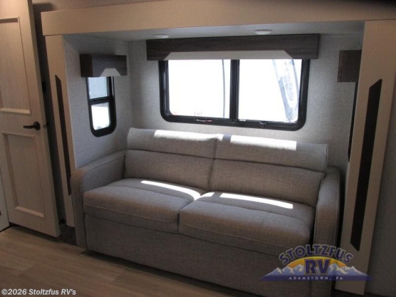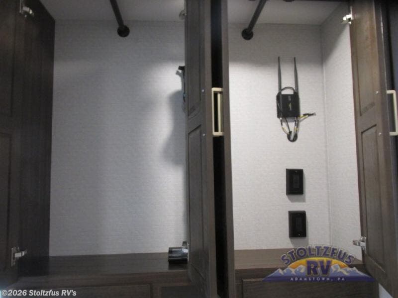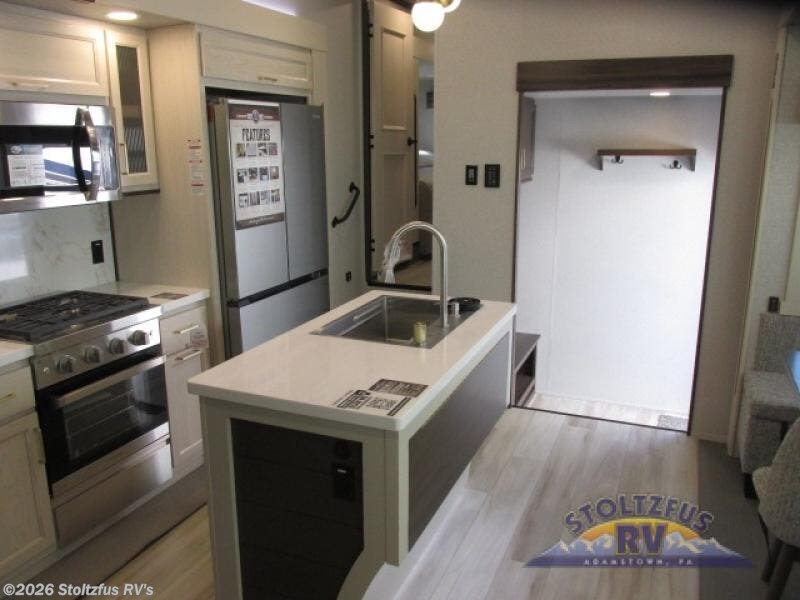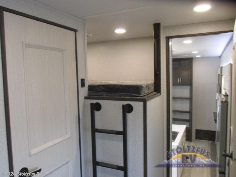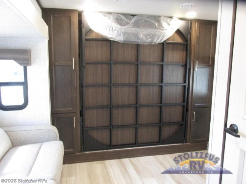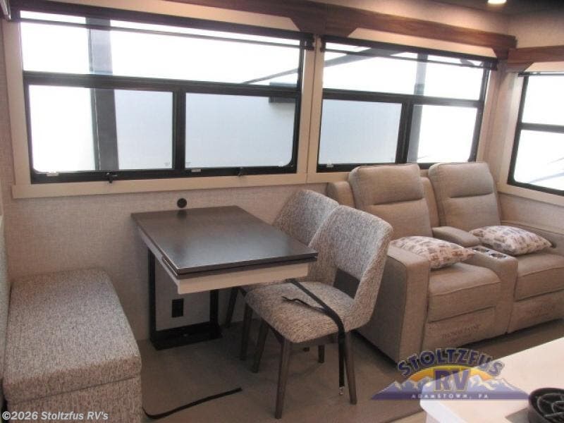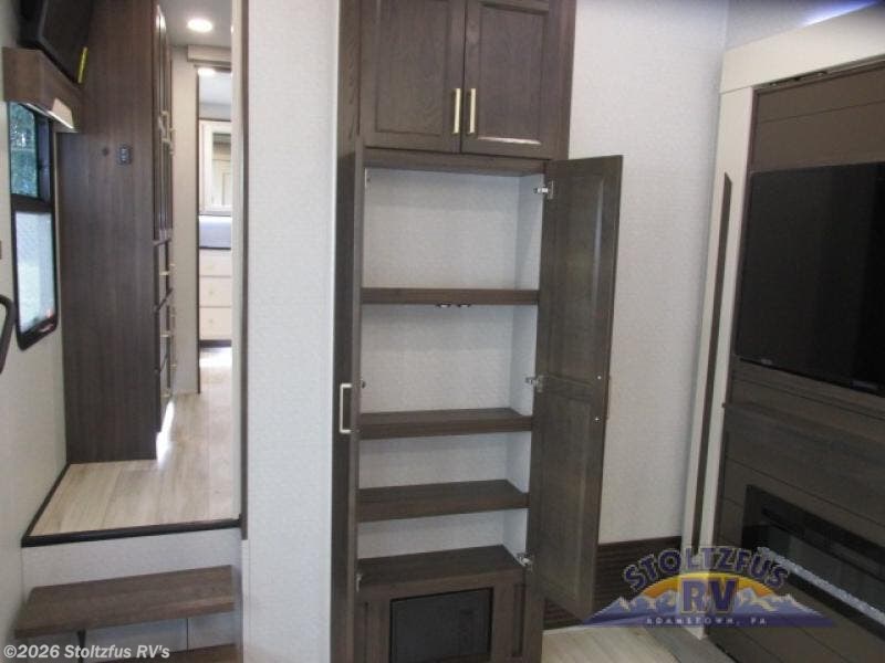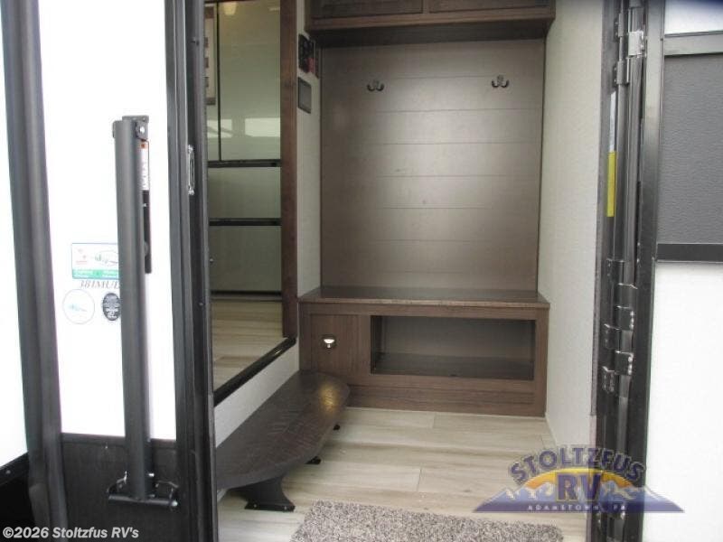 You won't believe all this fifth wheel has to offer! There is a convenient mud room right as you enter the unit where you can use the bench to take your shoes off and not drag dirt in the living areas. The front bedroom includes a jackknife sofa slide out, a half bath, plus a Murphy bed with a desk below so this room can be used as a guest room or office! And the loft access is in this room to house more guests or use as storage space. Your crew will love to meet in the middle combined kitchen and living area with power theater seats, a wall mounted dining table with an extension and an ottoman, plus a kitchen island with a fold-down breakfast counter. There is also a Murphy pantry hidden behind the entertainment center and all the appliances needed to make meals each day. You will be met with comfort in the master bedroom that includes a king bed slide out, a dresser and a TV, plus a full rear bath with dual bath sinks. You will also find a shower with a seat, washer/dryer prep, and drop-down storage under the rear bedroom/bathroom so nothing gets left behind!