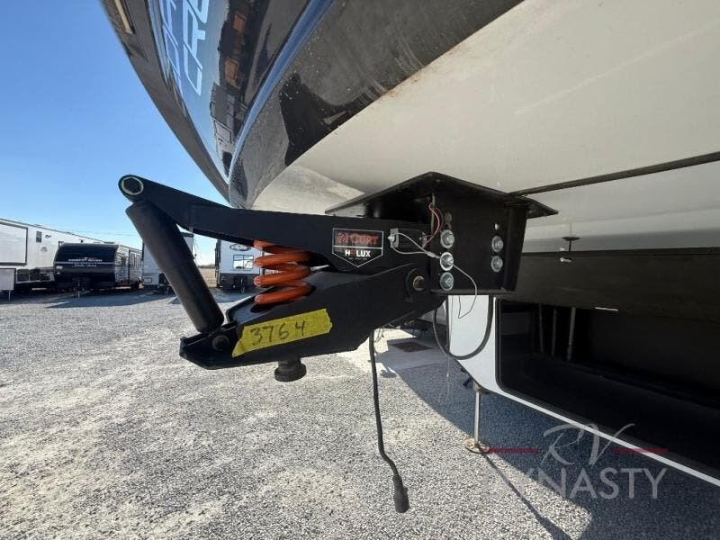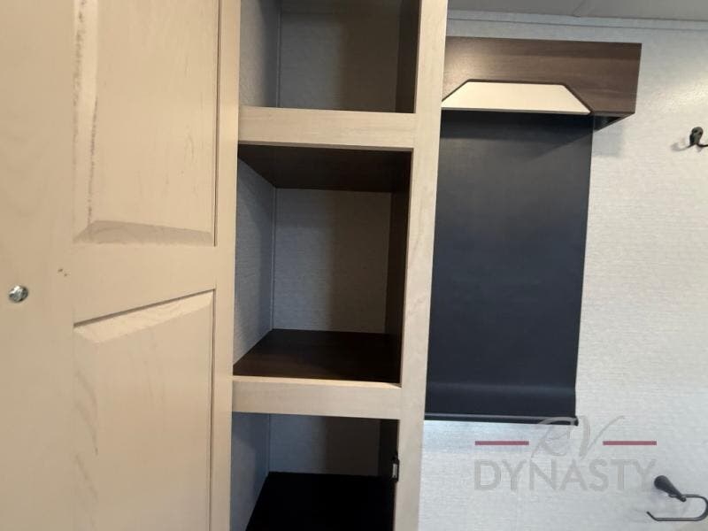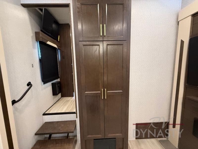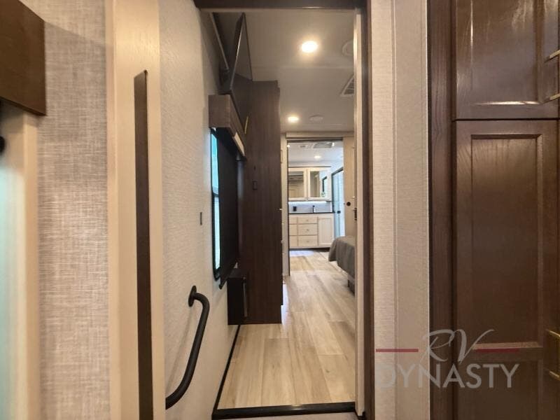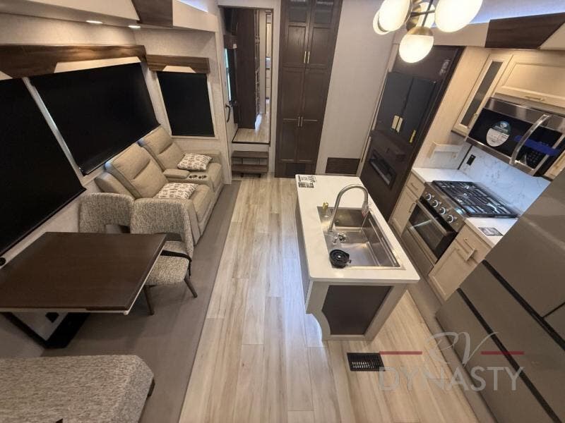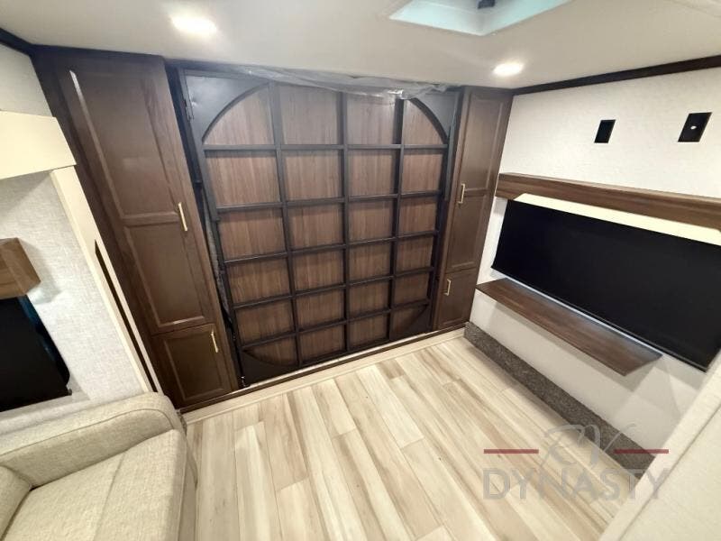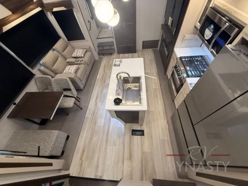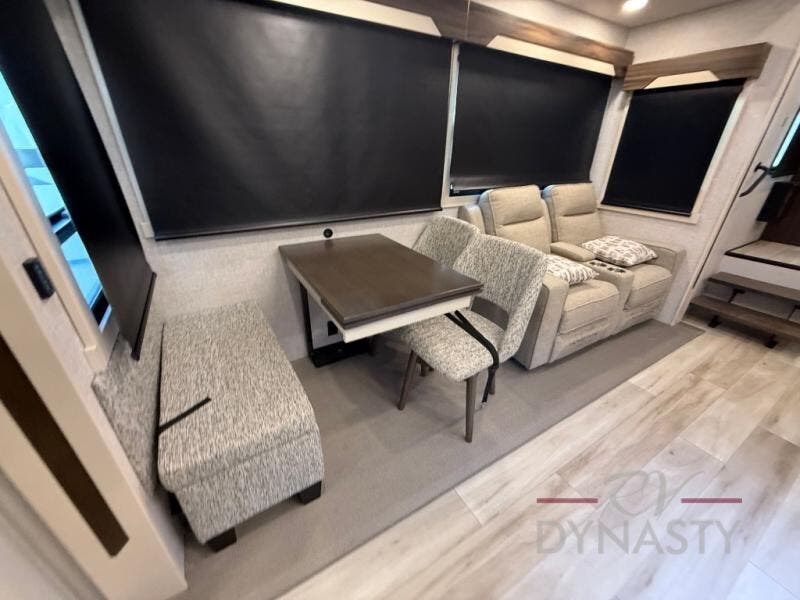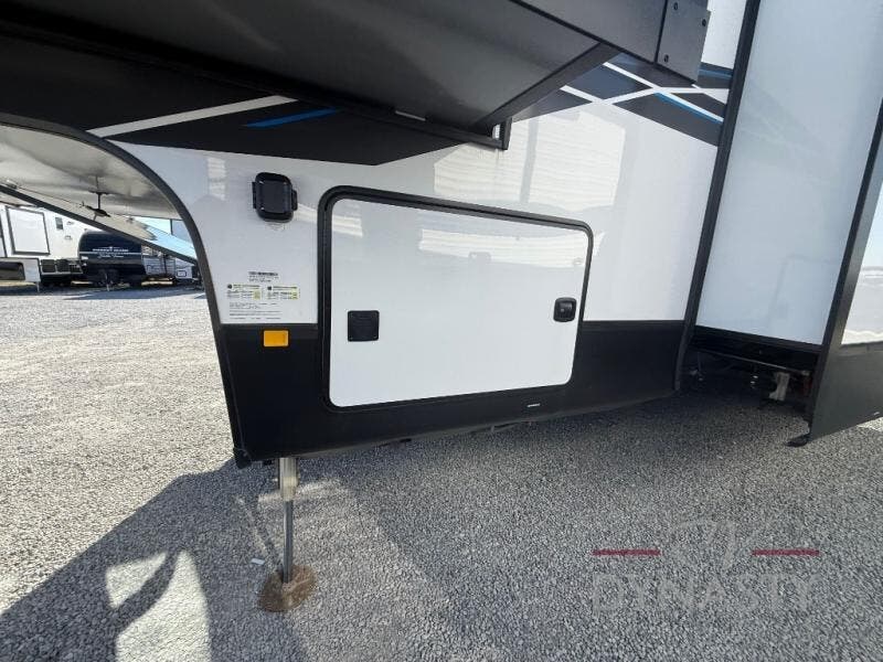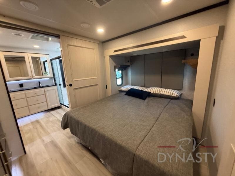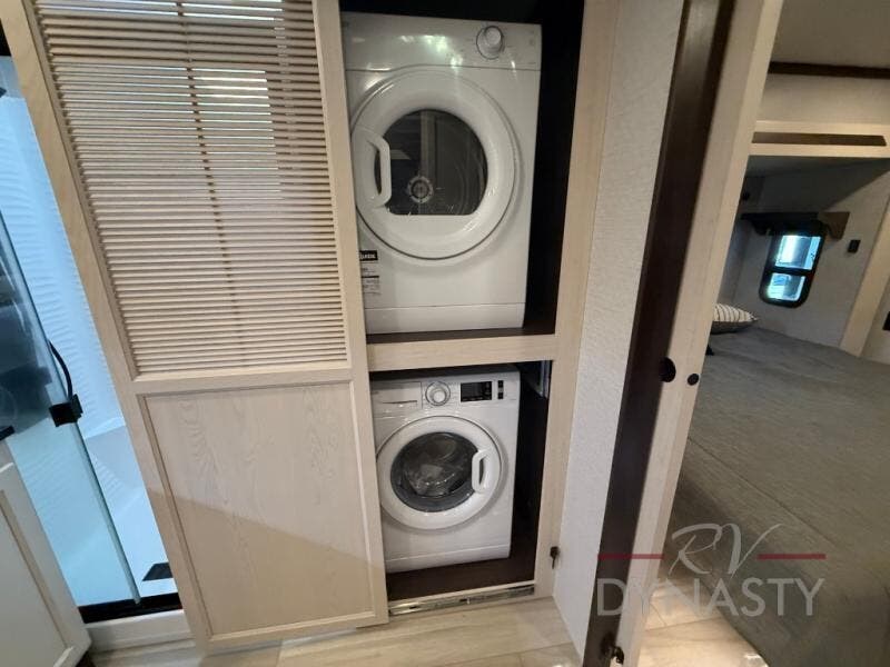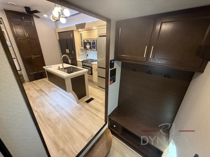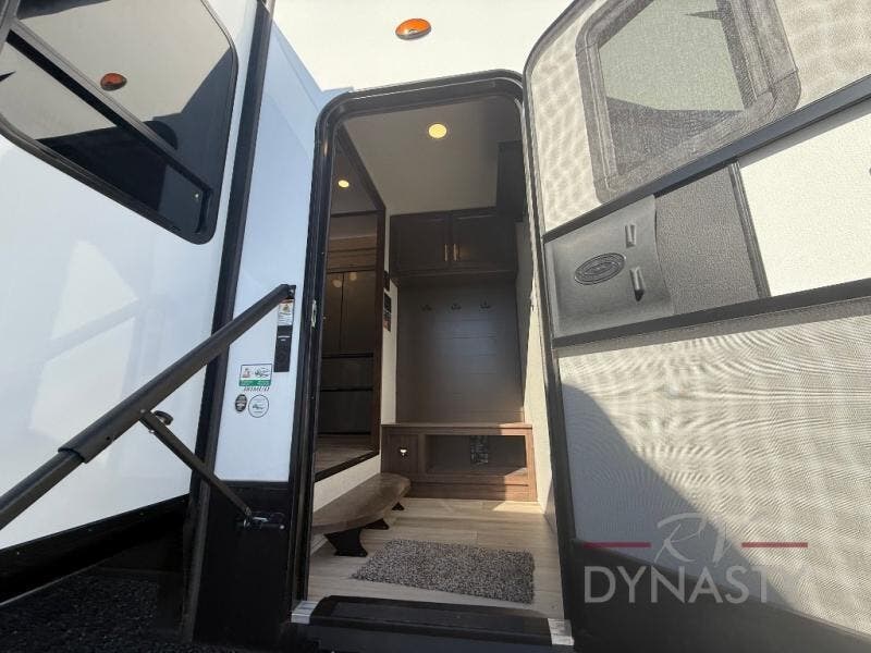 You won't believe all this fifth wheel has to offer! There is a convenient mud room right as you enter the unit where you can use the bench to take your shoes off and not drag dirt in the living areas. The front bedroom includes a jackknife sofa slide out, a half bath, plus a Murphy bed so this room can be used as a guest room! And the loft access is in this room to house more guests or use as storage space. Your crew will love to meet in the middle combined kitchen and living area with power theater seats, a wall mounted dining table with an extension and an ottoman, plus a kitchen island with a fold-down breakfast counter. There is also a Murphy pantry hidden behind the entertainment center and all the appliances needed to make meals each day. You will be met with comfort in the master bedroom that includes a king bed slide out, a dresser and a TV, plus a full rear bath with dual bath sinks. You will also find a shower with a seat, washer/dryer prep, and drop-down storage under the rear bedroom/bathroom so nothing gets left behind!