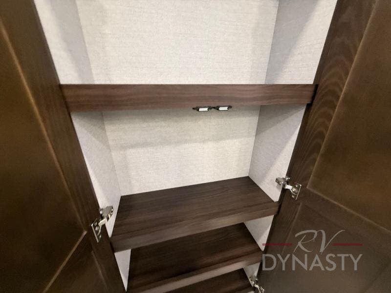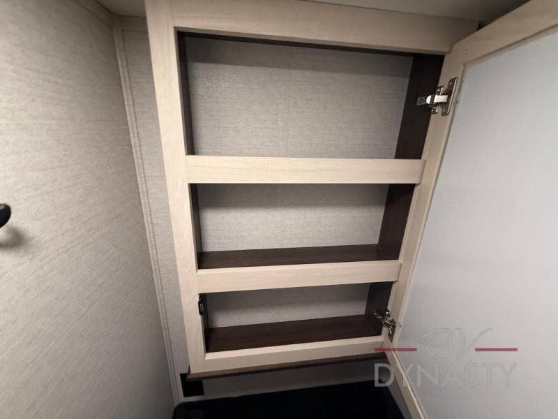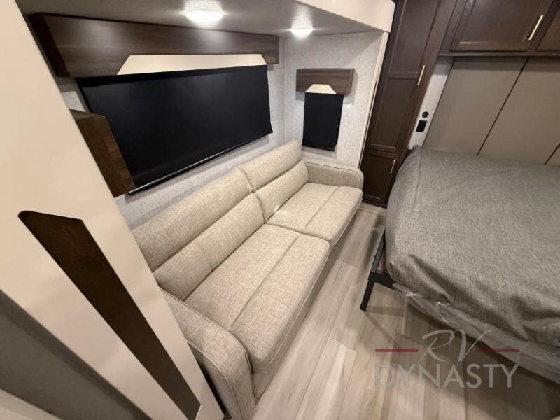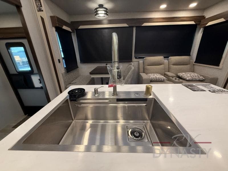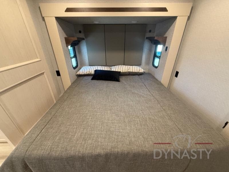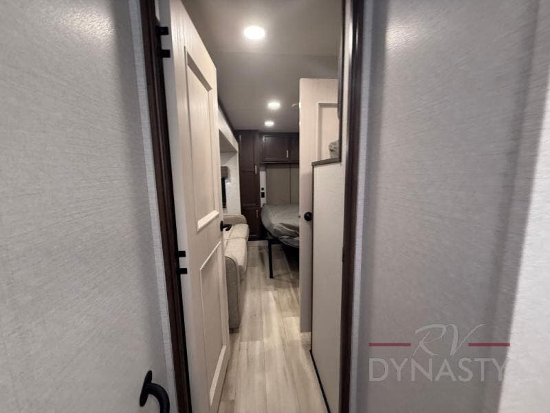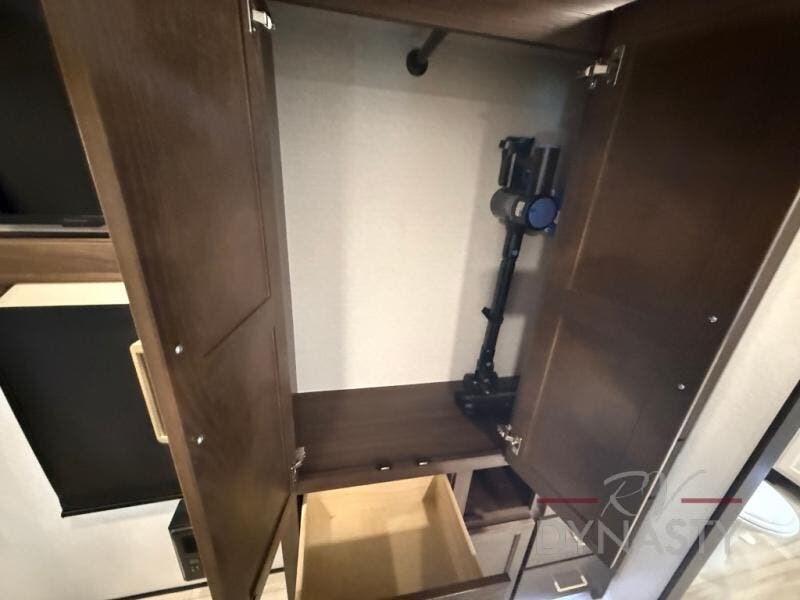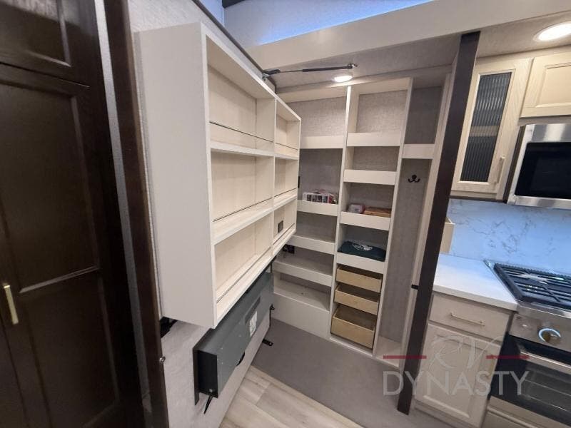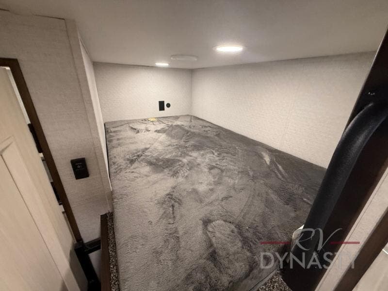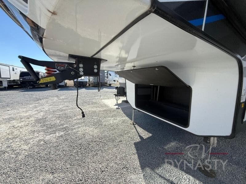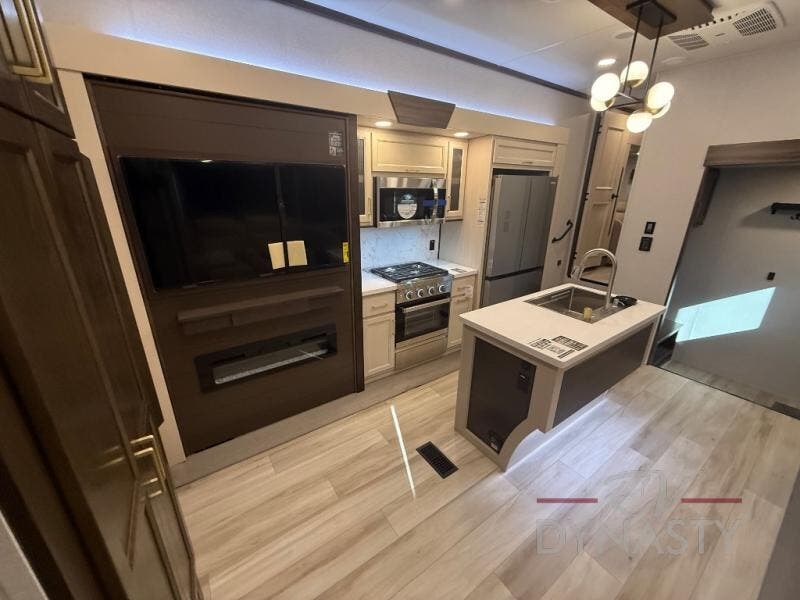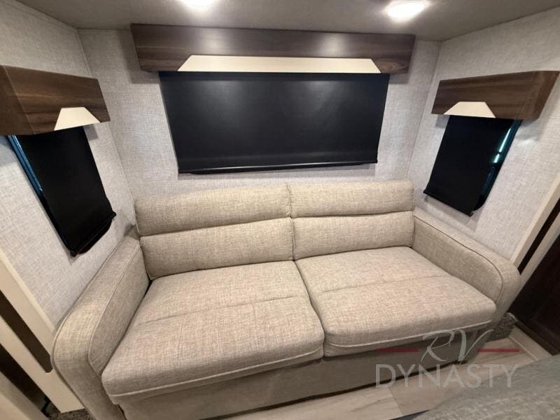 You won't believe all this fifth wheel has to offer! There is a convenient mud room right as you enter the unit where you can use the bench to take your shoes off and not drag dirt in the living areas. The front bedroom includes a jackknife sofa slide out, a half bath, plus a Murphy bed so this room can be used as a guest room! And the loft access is in this room to house more guests or use as storage space. Your crew will love to meet in the middle combined kitchen and living area with power theater seats, a wall mounted dining table with an extension and an ottoman, plus a kitchen island with a fold-down breakfast counter. There is also a Murphy pantry hidden behind the entertainment center and all the appliances needed to make meals each day. You will be met with comfort in the master bedroom that includes a king bed slide out, a dresser and a TV, plus a full rear bath with dual bath sinks. You will also find a shower with a seat, washer/dryer prep, and drop-down storage under the rear bedroom/bathroom so nothing gets left behind!