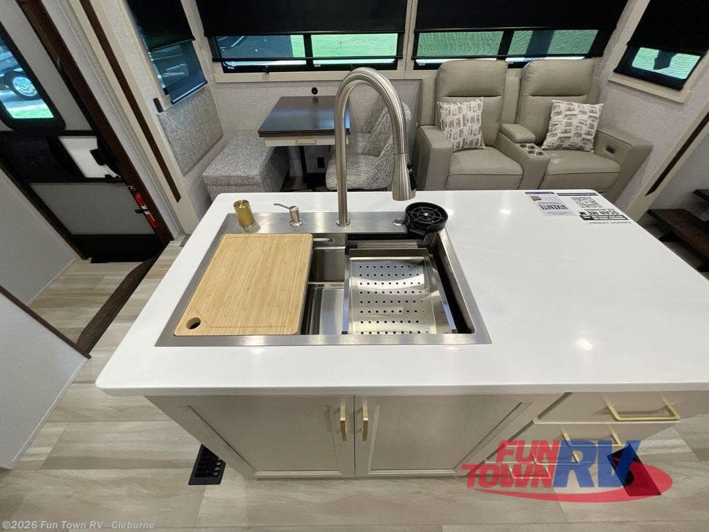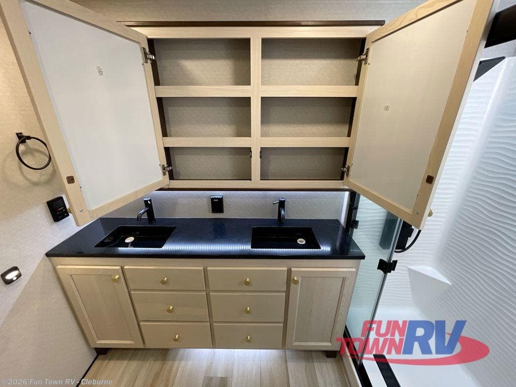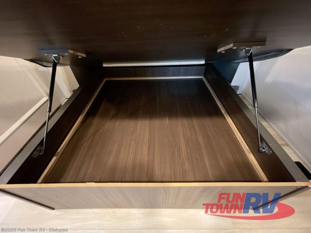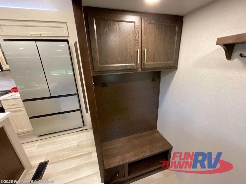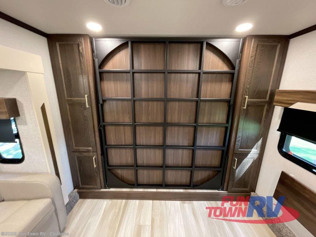 You won't believe all this fifth wheel has to offer! There is a convenient mud room right as you enter the unit where you can use the bench to take your shoes off and not drag dirt in the living areas. The front bedroom includes a jackknife sofa slide out, a half bath, plus a Murphy bed so this room can be used as a guest room! And the loft access is in this room to house more guests or use as storage space. Your crew will love to meet in the middle combined kitchen and living area with power theater seats, a wall mounted dining table with an extension and an ottoman, plus a kitchen island with a fold-down breakfast counter. There is also a Murphy pantry hidden behind the entertainment center and all the appliances needed to make meals each day. You will be met with comfort in the master bedroom that includes a king bed slide out, a dresser and a TV, plus a full rear bath with dual bath sinks. You will also find a shower with a seat, washer/dryer prep, and drop-down storage under the rear bedroom/bathroom so nothing gets left behind!