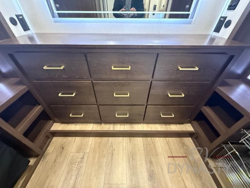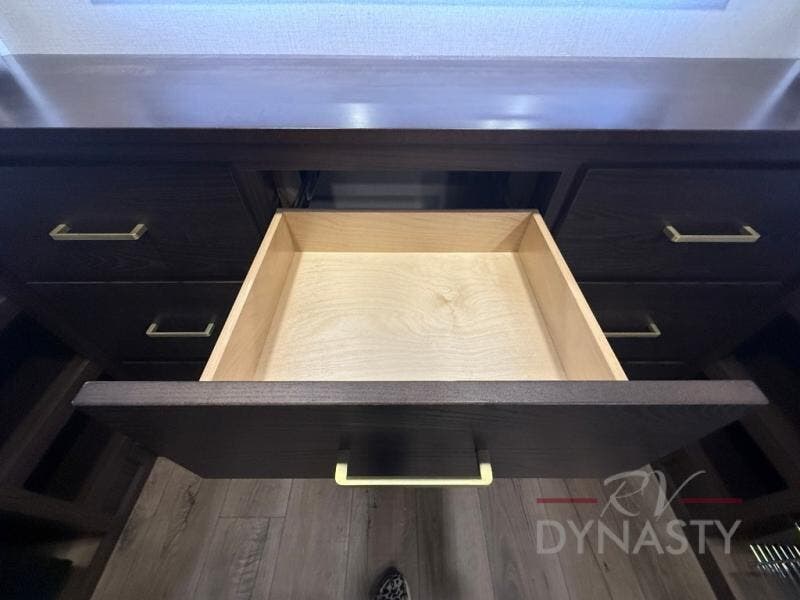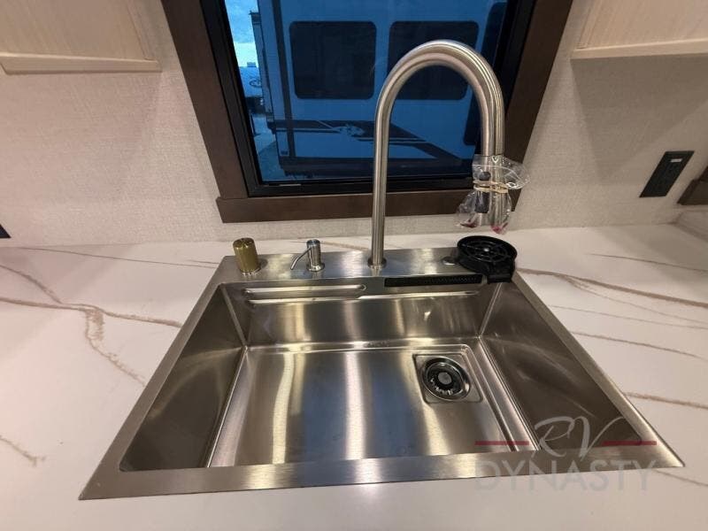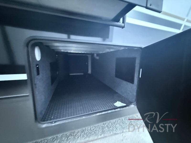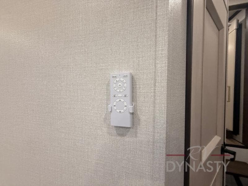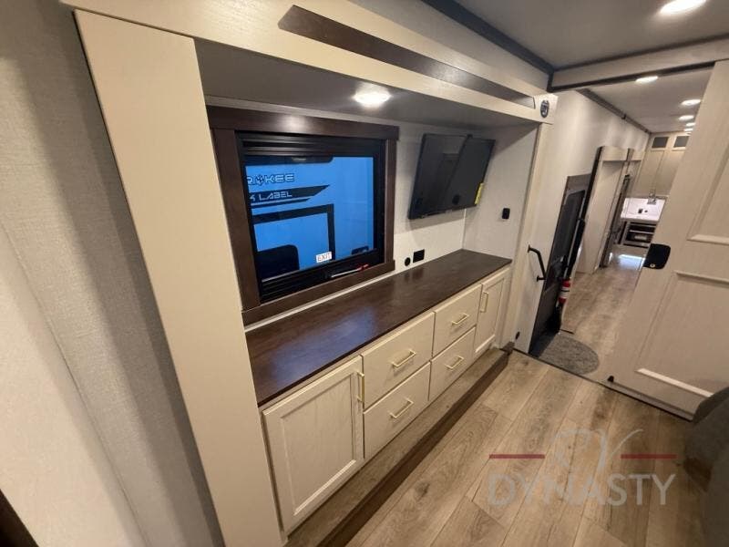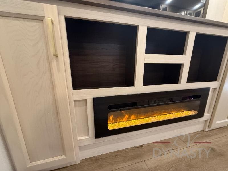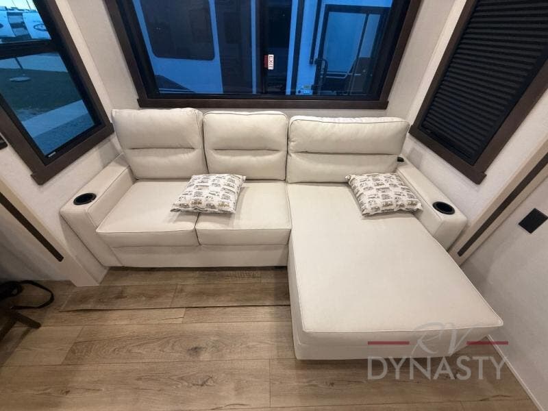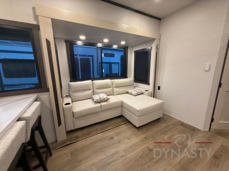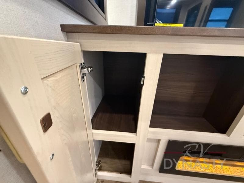 At the front of this 385RK fifth wheel, you’ll find a full bathroom featuring a spacious shower with a built-in seat and convenient LED motion night lighting under the vanity for added comfort. Adjacent to the bathroom is a walk-in closet complete with a dresser and hanging rods, offering ample storage for clothing and gear. Next to this area is the bedroom, which houses a 72" x 80" king bed set in a slide-out for a restful night’s sleep. Across from the bed sits another dresser with a TV, providing extra storage and entertainment. Moving toward the center, a half bath is conveniently located across from the entrance for easy access. The living area opens up with dual opposing slides, creating a roomy lounge space featuring a sectional sofa and an entertainment center with a TV and fireplace, perfect for cozy movie nights. At the rear, the U-shaped kitchen invites the chef of the trip to cook to their heart’s content, equipped with ample overhead cabinets, a 20-cu. ft. stainless steel refrigerator, a 30" stainless steel over-the-range microwave with an updated backsplash, and a 3-burner gas oven with a pull-out pan drawer. Meals can be enjoyed at the convenient bartop with stools to the side, making this fifth wheel both stylish and functional.