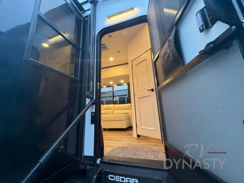 With any Cedar Creek fifth wheel by Forest River, you will find a quality-built RV with your comfort in mind! The all-aluminum super structure on 16" centers or less will provide a solid foundation to your fifth wheel, and the 3M bonded sidewalls will hold up and provide resistance to UV, heat, cold moisture, and even highway chemicals. Each model also includes a Road Warrior suspension for smooth towing, a 6-Point Hydraulic, GEN 3 Leveling System, and a new 101" wide body frame. Inside, you'll enjoy walnut/two tone wooden cabinetry with hidden hinges, cutting board drawer with cut-out trash funnel, motion lighting in the bath and bedroom closet, plus many more comforts. The New Travelfi™ Pay-as-you go internet provides the ability to bring your own internet rather than relying solely on campground WiFi, and the "Rich Solar" 200W solar panel will give you off-grid capabilities!
