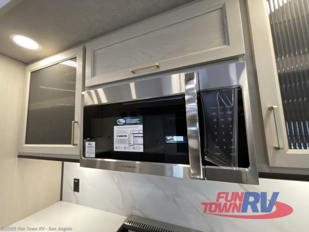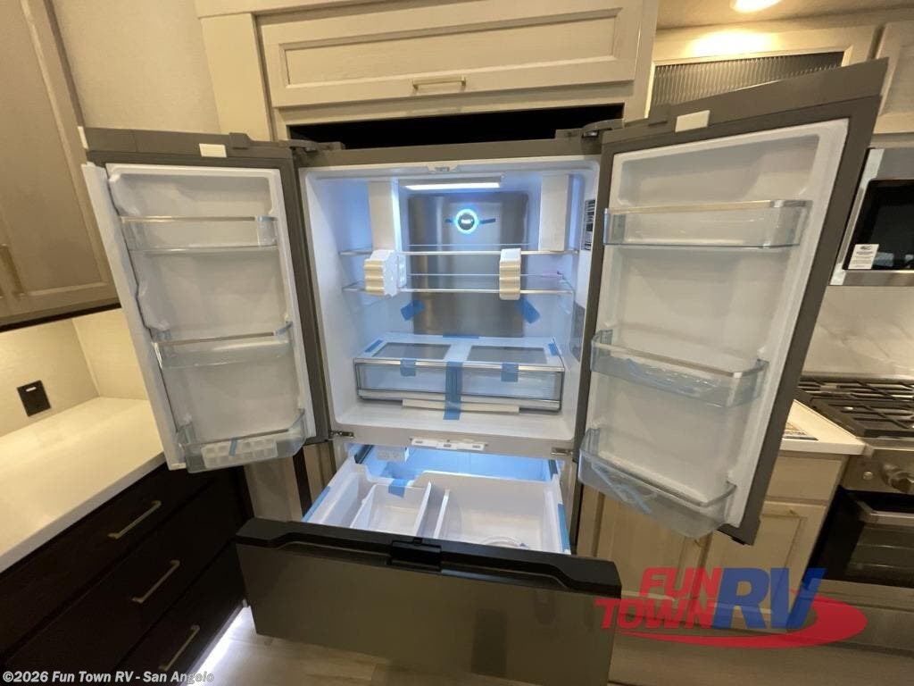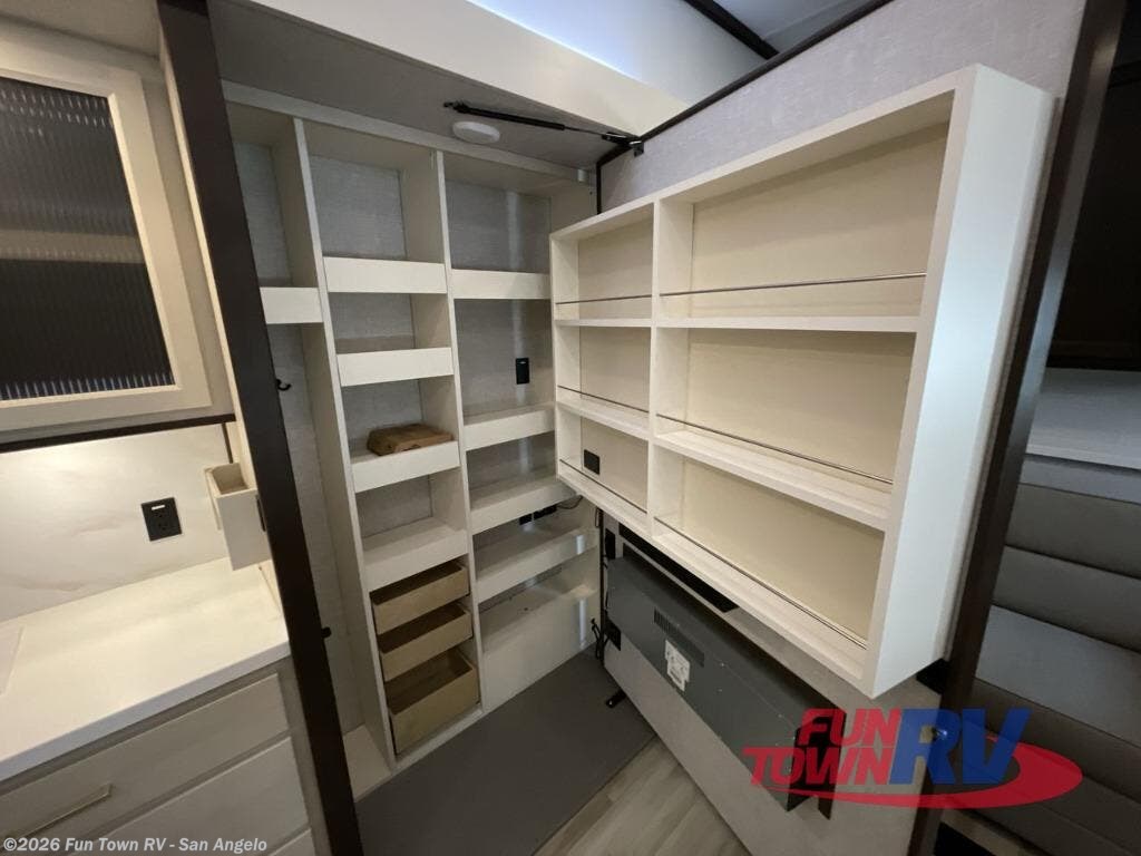It will feel like coming home each time you take this fifth wheel out! The dual opposing slides in the main living area make your space open, and the waterfall island with swivel chairs will be the perfect place to prep meals, dine together, or set out snacks for movie night! You will also love the rear counter space with a large sink to clean up each day and there is a dishwasher option if you want the option to make the process even easier. A tri-fold sofa in the main living area will provide a place for a guest or two to sleep, and the Murphy pantry hidden behind the entertainment center and fireplace will keep snacks stocked up. The full bath includes a shower with a seat, dual bath sinks, plus a linen closet to keep towels tidy. What could make this fifth wheel better than a king bed slide out in the front bedroom?! How about a large wardrobe with washer/dryer prep, a dresser with a TV above, and overhead storage for belongings!