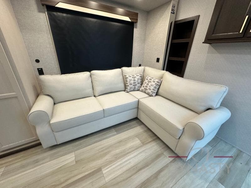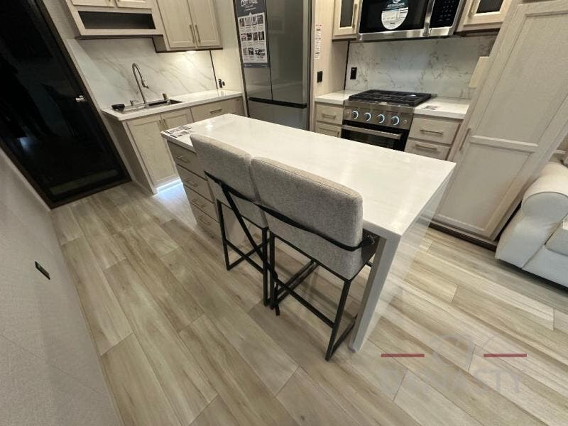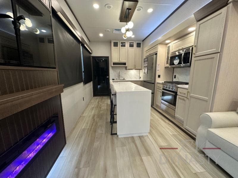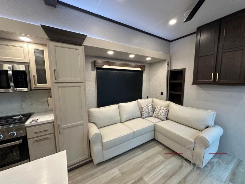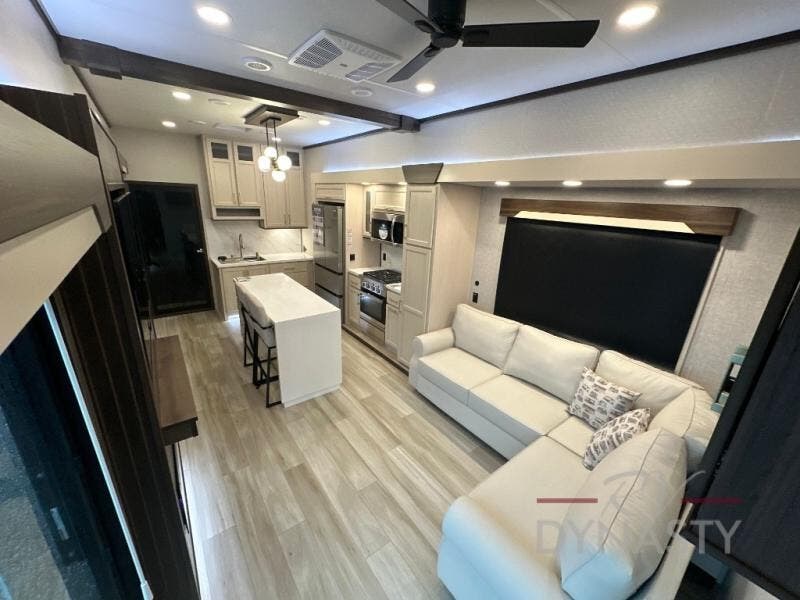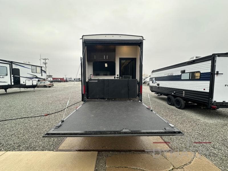 At-home comforts are found in this double slide out destination trailer! With dual entry doors, you can enter in through the rear patio deck and glass door or the main living area through sliding patio doors. The combined kitchen and living room includes a large slide for ample space to move about, along with an L-shaped sectional sofa, a waterfall island with two seats, and all the kitchen appliances to cook meals each day. There is even a dishwasher option if you want to make cleaning up easier. A full bath will let you clean up each day, and the front private bedroom will feel just like home with its king bed slide, front wardrobe with sliding doors, and dresser with a TV above. There is also washer and dryer prep if you want to add those appliances!