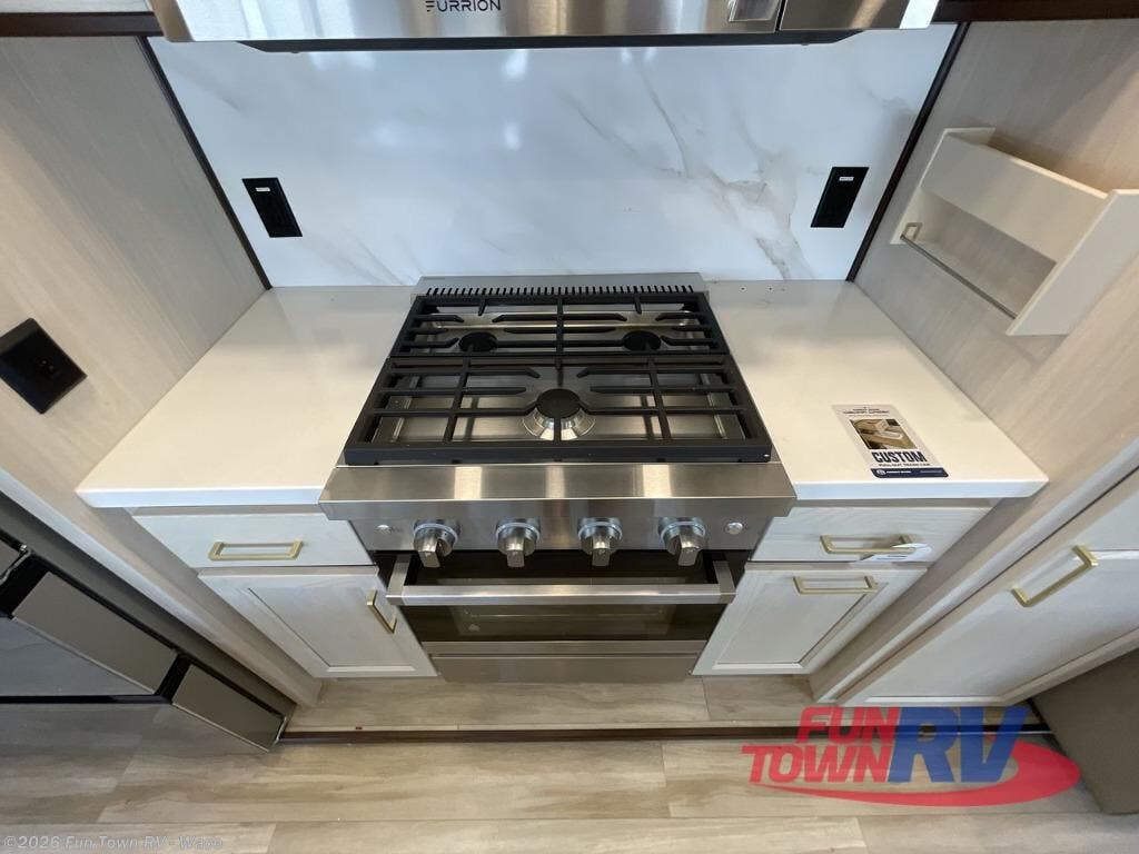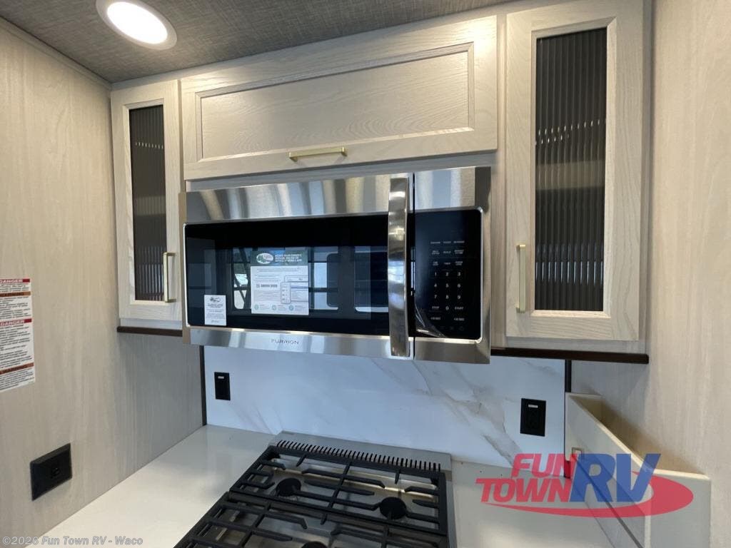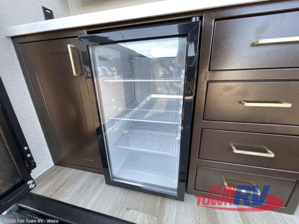 At-home comforts are found in this double slide out destination trailer! With dual entry doors, you can enter in through the rear patio deck and glass door or the main living area through sliding patio doors. The combined kitchen and living room includes a large slide for ample space to move about, along with an L-shaped sectional sofa, a waterfall island with two seats, and all the kitchen appliances to cook meals each day. There is even a dishwasher option if you want to make cleaning up easier. A full bath will let you clean up each day, and the front private bedroom will feel just like home with its king bed slide, front wardrobe with sliding doors, and dresser with a TV above. There is also washer and dryer prep if you want to add those appliances!