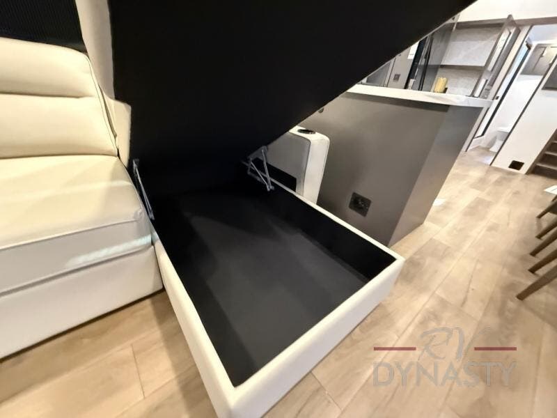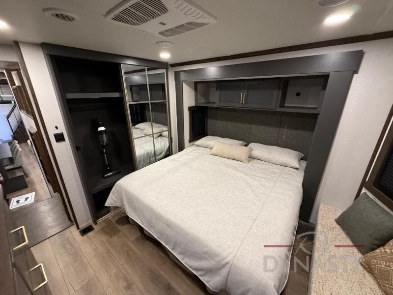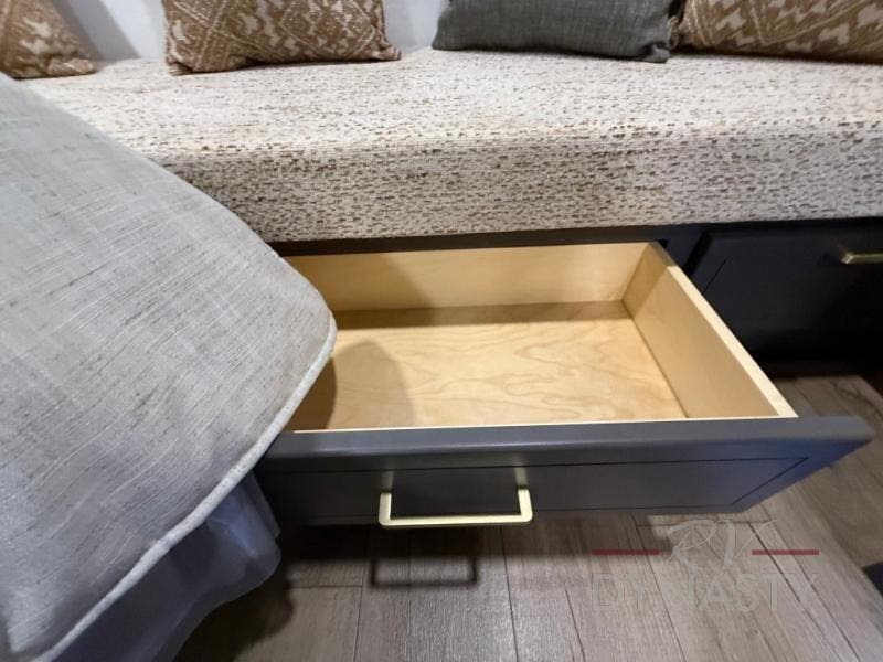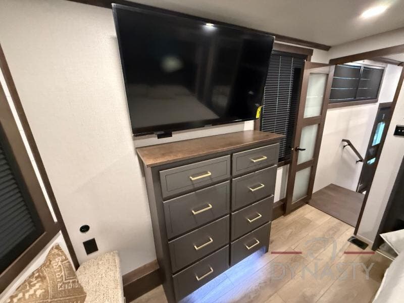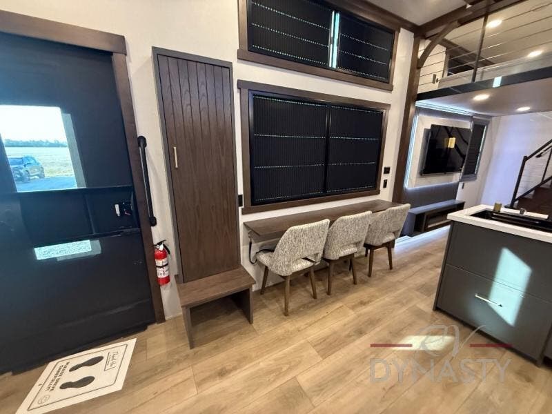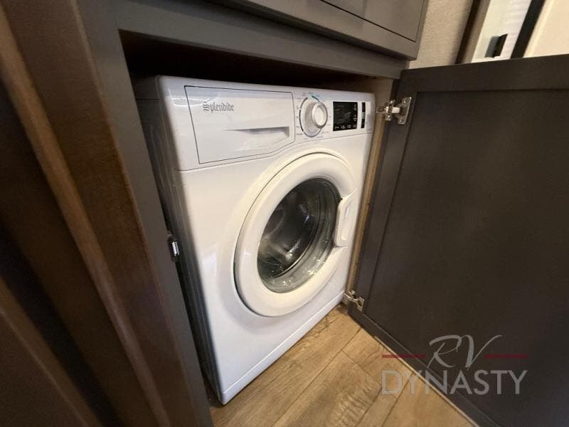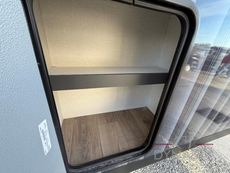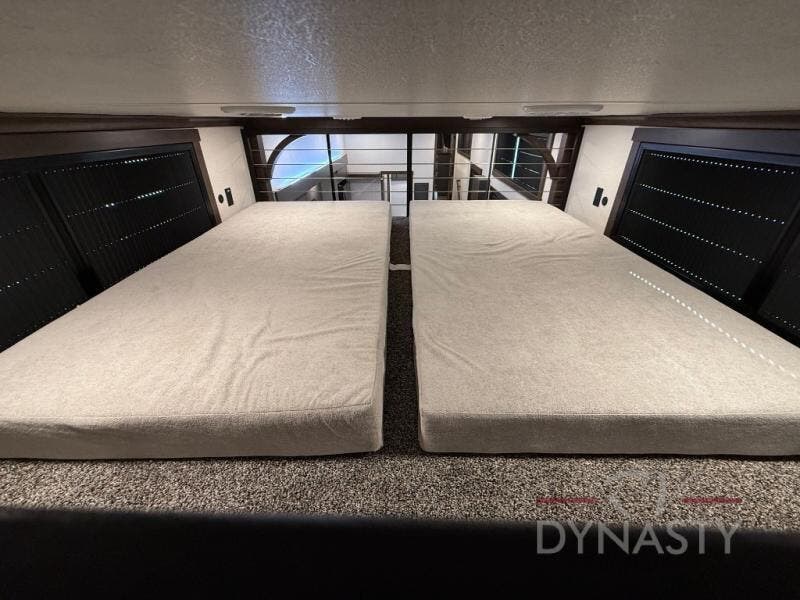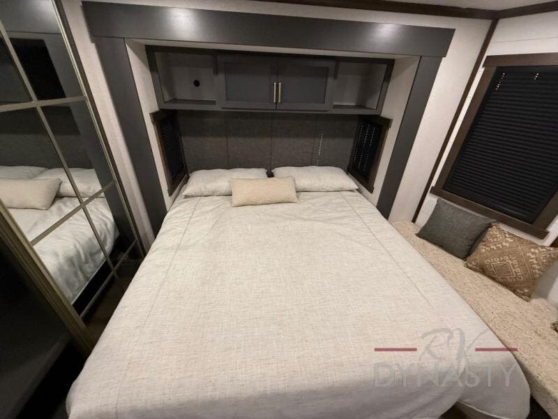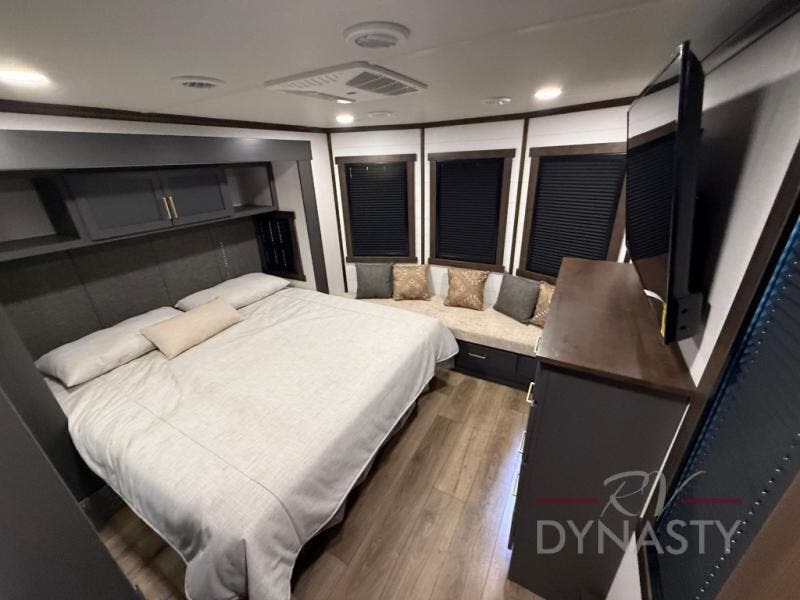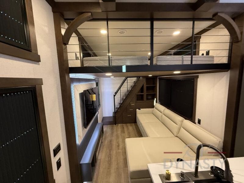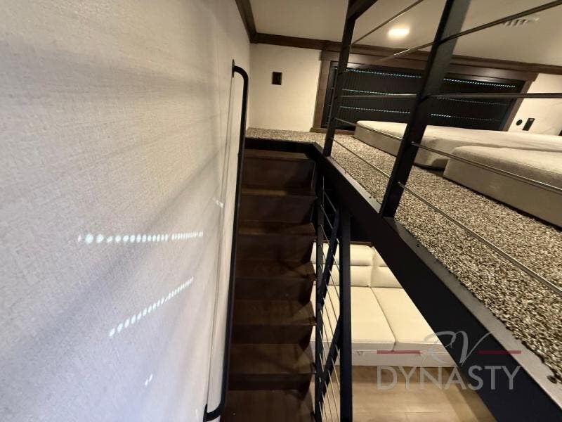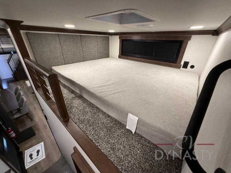 It will be so easy to enjoy extended stays in this destination fifth wheel! There is a large slide out in the main living area, a counter peninsula for more counter space, and a flip-down bar top to dine at. You'll find a comfy place to relax on the sectional sofa with a trundle bed underneath for added sleeping space. There is a loft area above the living room that includes two bunk mats and loft windows so this space seems larger, and the second loft is found above the spacious full bath. Speaking of the bath, you'll find a spacious shower and sink plus washer and dryer prep if you want the option to make laundry day easier. The front private bedroom features a king bed slide out, a front bench seat, a large wardrobe, and a dresser with a TV above to watch movies in bed.
