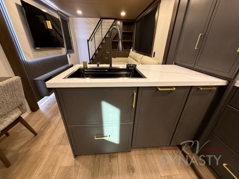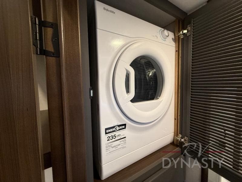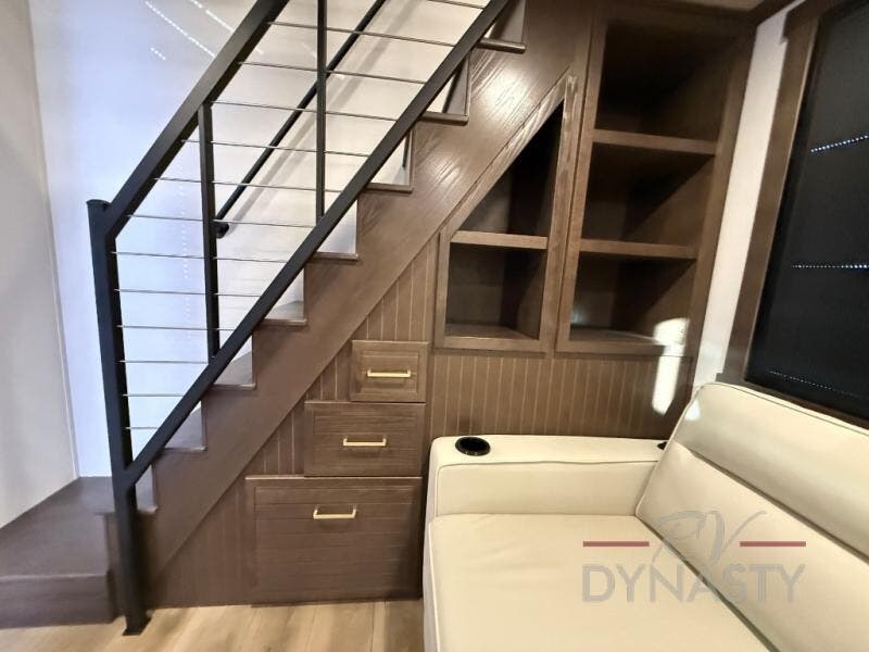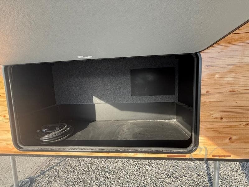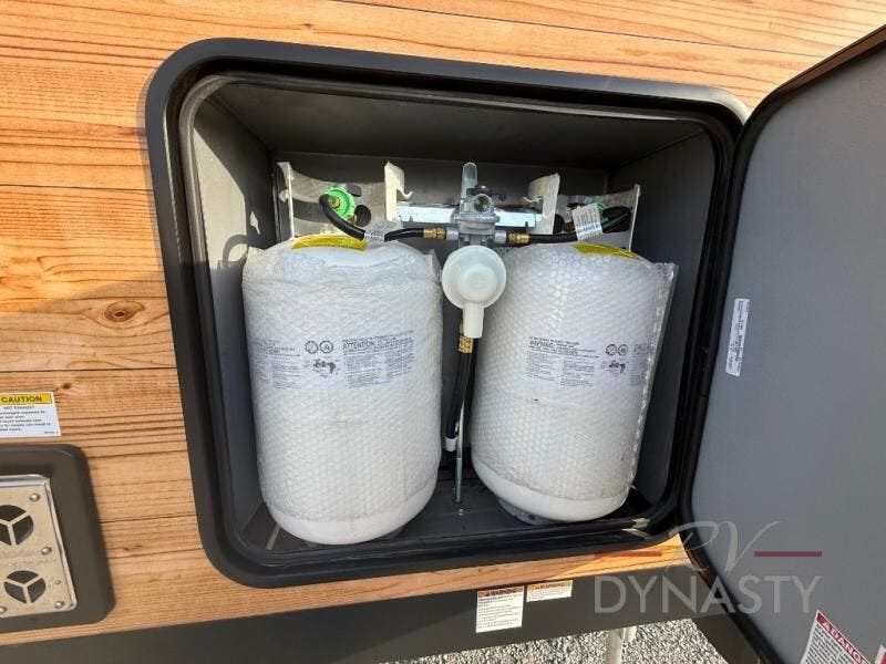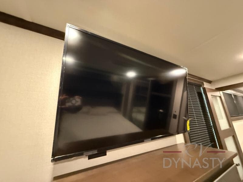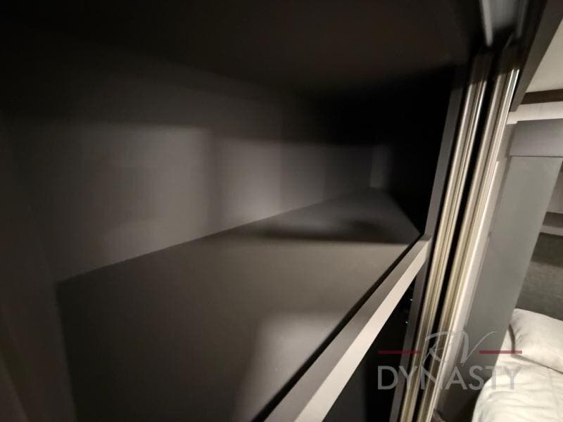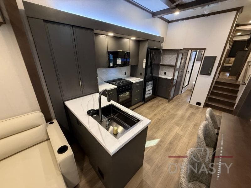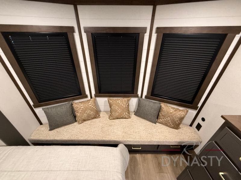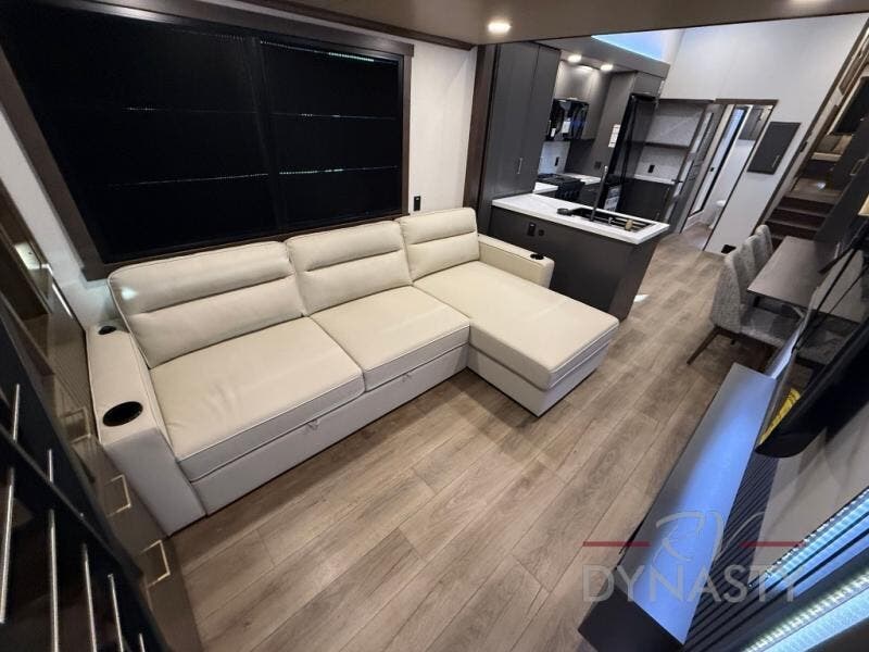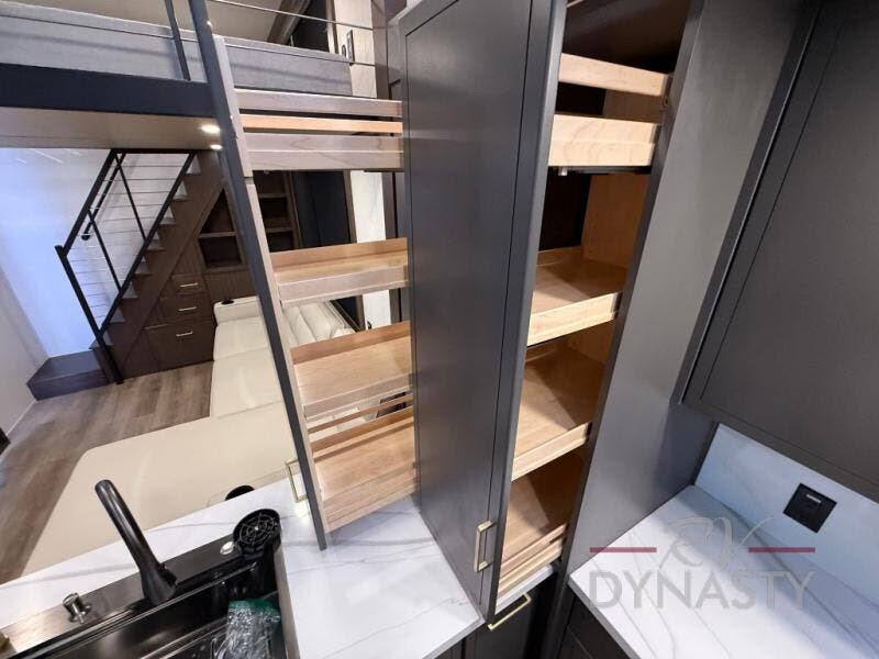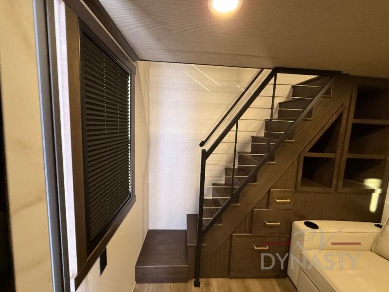 It will be so easy to enjoy extended stays in this destination fifth wheel! There is a large slide out in the main living area, a counter peninsula for more counter space, and a flip-down bar top to dine at. You'll find a comfy place to relax on the sectional sofa with a trundle bed underneath for added sleeping space. There is a loft area above the living room that includes two bunk mats and loft windows so this space seems larger, and the second loft is found above the spacious full bath. Speaking of the bath, you'll find a spacious shower and sink plus washer and dryer prep if you want the option to make laundry day easier. The front private bedroom features a king bed slide out, a front bench seat, a large wardrobe, and a dresser with a TV above to watch movies in bed.