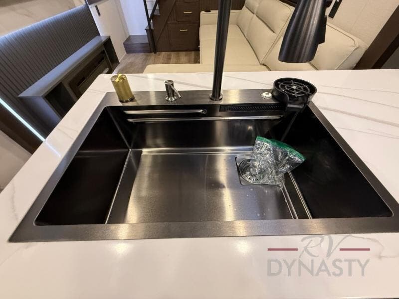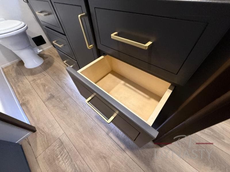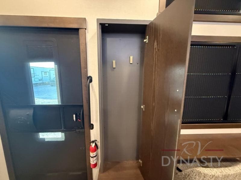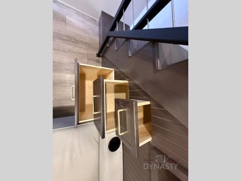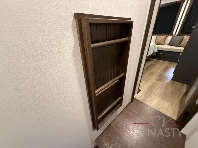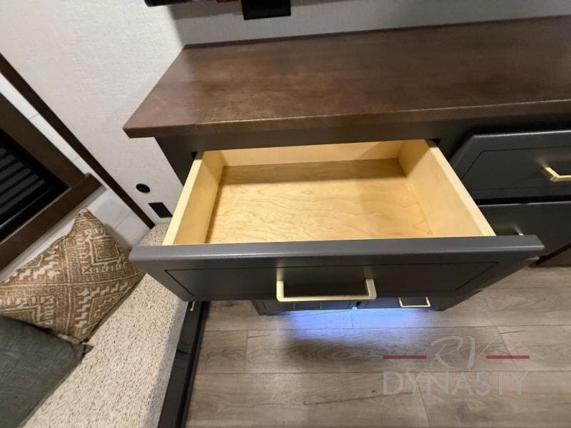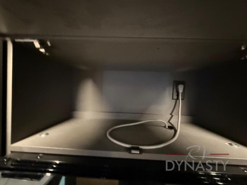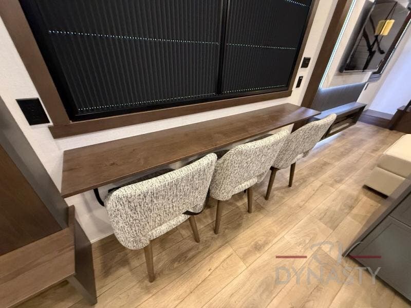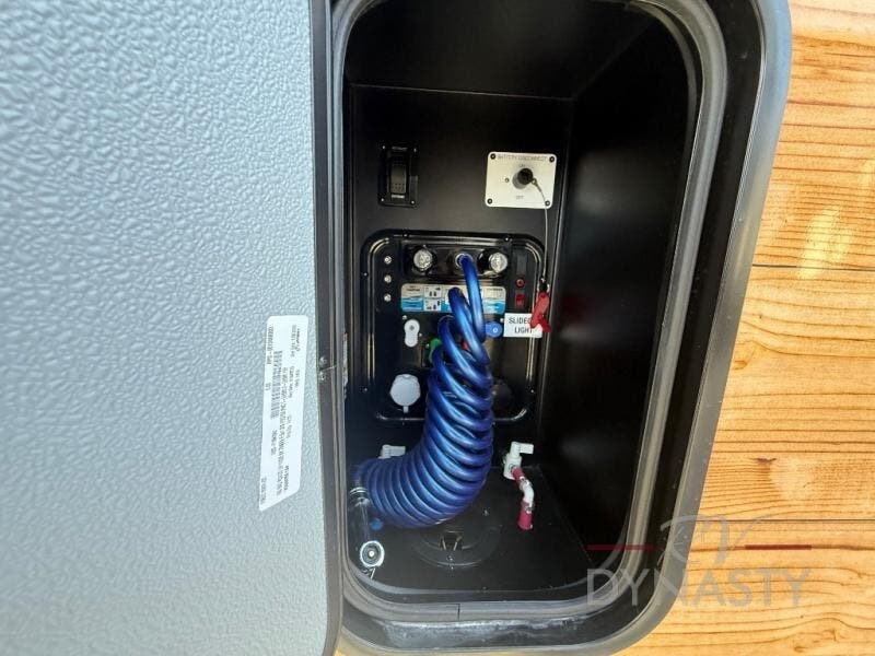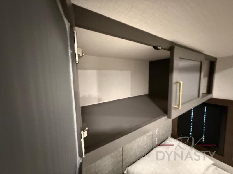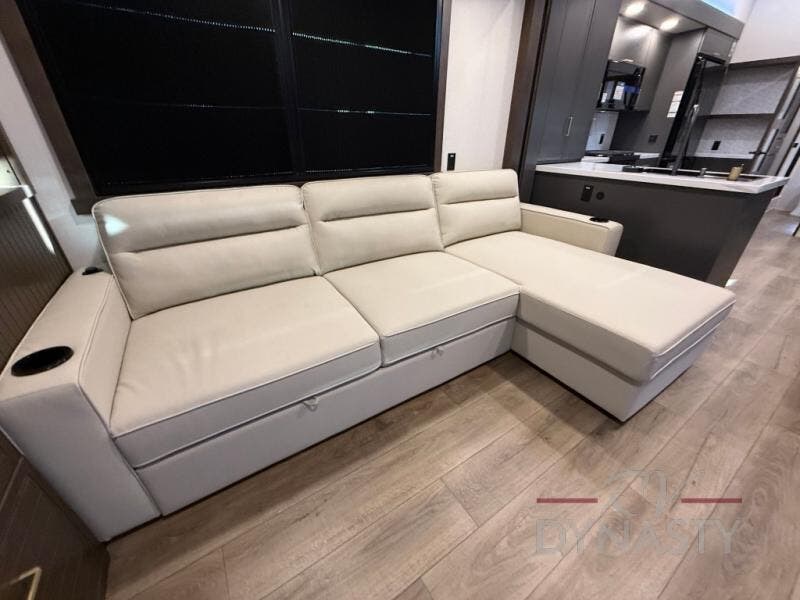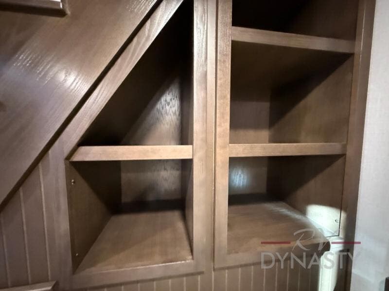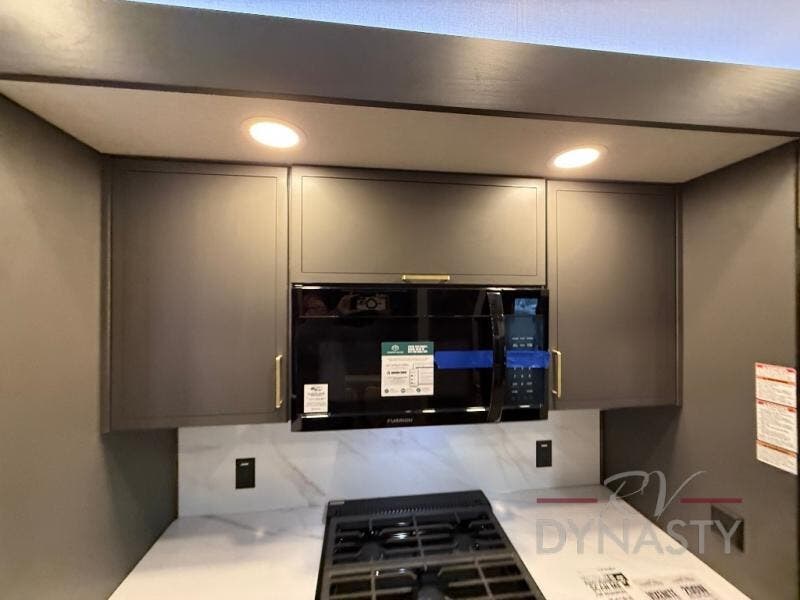 It will be so easy to enjoy extended stays in this destination fifth wheel! There is a large slide out in the main living area, a counter peninsula for more counter space, and a flip-down bar top to dine at. You'll find a comfy place to relax on the sectional sofa with a trundle bed underneath for added sleeping space. There is a loft area above the living room that includes two bunk mats and loft windows so this space seems larger, and the second loft is found above the spacious full bath. Speaking of the bath, you'll find a spacious shower and sink plus washer and dryer prep if you want the option to make laundry day easier. The front private bedroom features a king bed slide out, a front bench seat, a large wardrobe, and a dresser with a TV above to watch movies in bed.