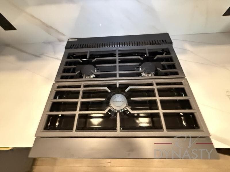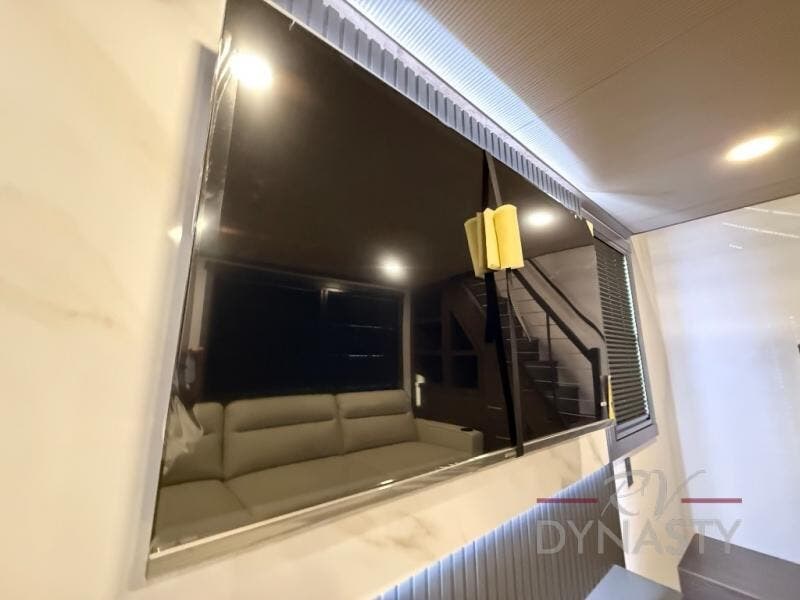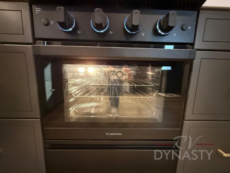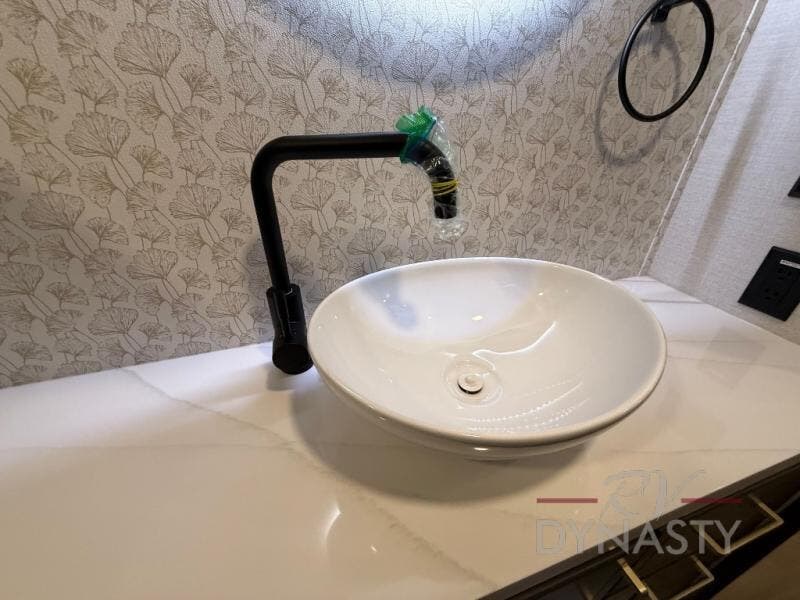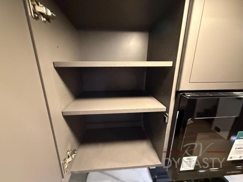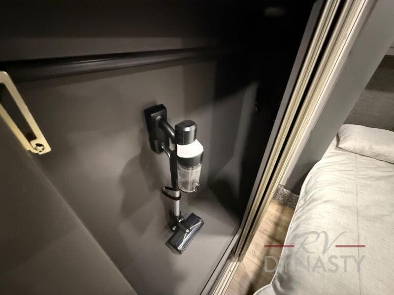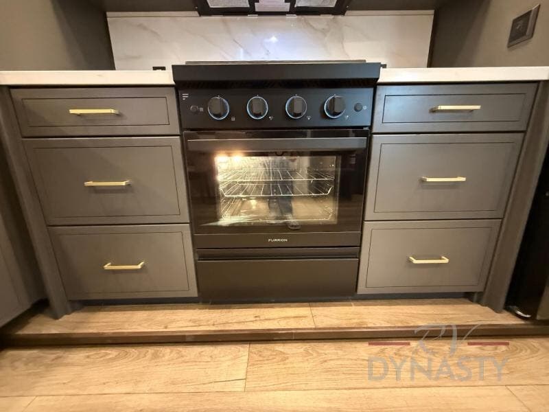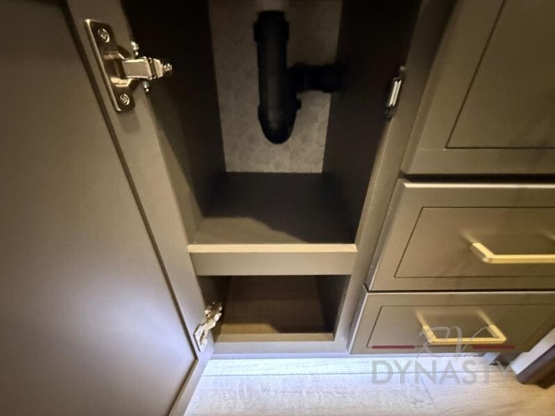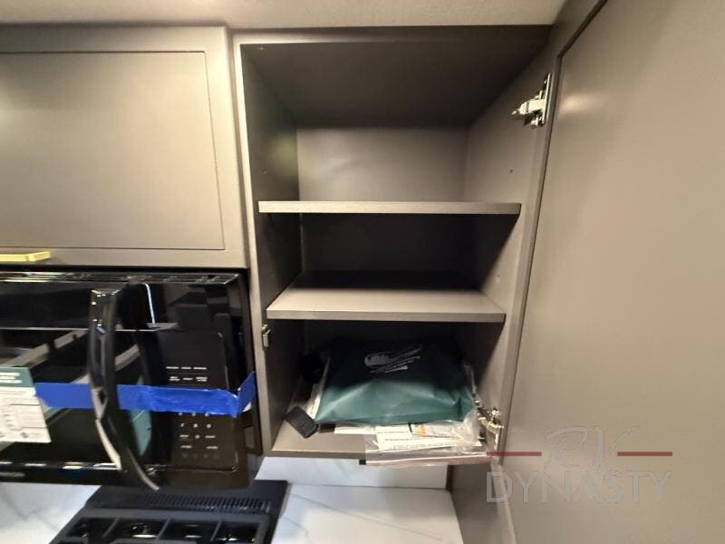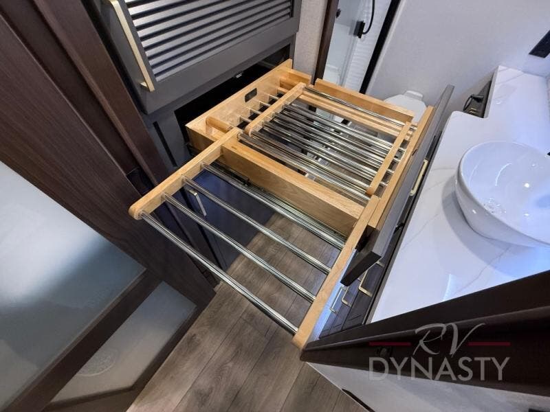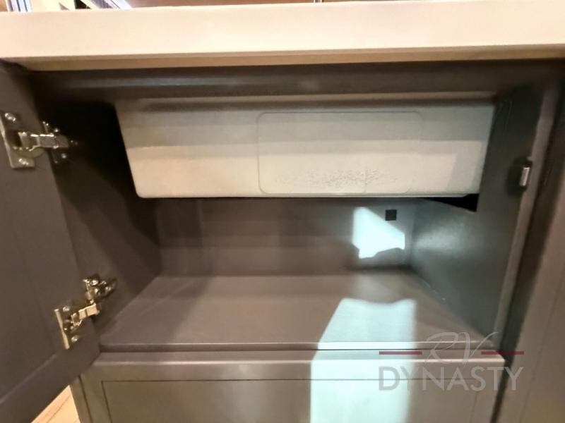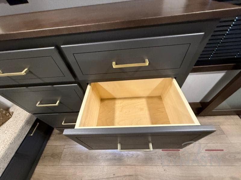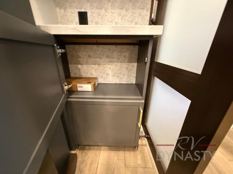 It will be so easy to enjoy extended stays in this destination fifth wheel! There is a large slide out in the main living area, a counter peninsula for more counter space, and a flip-down bar top to dine at. You'll find a comfy place to relax on the sectional sofa with a trundle bed underneath for added sleeping space. There is a loft area above the living room that includes two bunk mats and loft windows so this space seems larger, and the second loft is found above the spacious full bath. Speaking of the bath, you'll find a spacious shower and sink plus washer and dryer prep if you want the option to make laundry day easier. The front private bedroom features a king bed slide out, a front bench seat, a large wardrobe, and a dresser with a TV above to watch movies in bed.