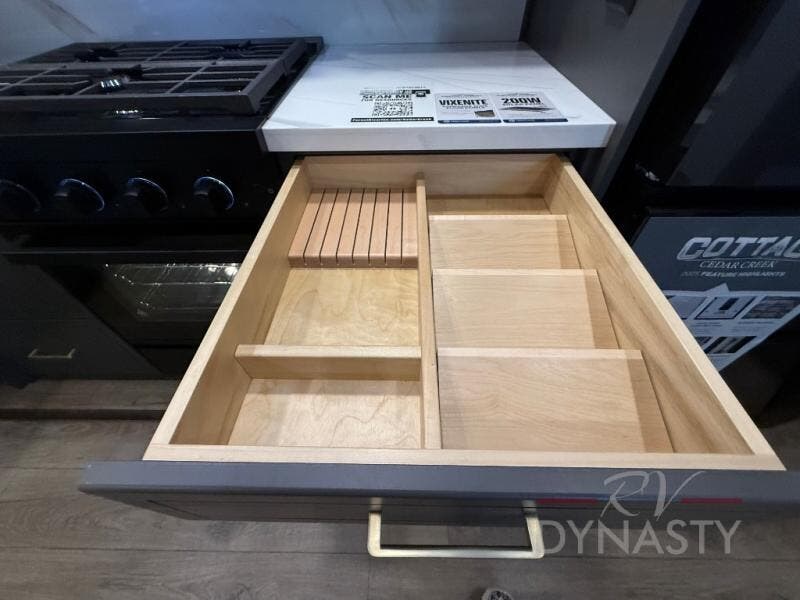 With any Cedar Creek Cottage destination trailer by Forest River, you can enjoy extended stays with residential features at the location of your choice! Each model is built with 3M bonded sidewalls that grow stronger with age and are resistant to UV, heat, oil, moisture, and more. There is also an AlphaPly TPO roof membrane, detachable entry steps, and new waterproof and bug proof Vixenite slide room floor panels for added durability. Head inside where you'll find residential dovetail, self-closing drawers, flush floor slides in the kitchen and living area, a residential style headboard and luxurious bedding decor, and extra storage for linens in the bedroom and bath. Each model is also pre-wired for satellite to the roof, and you can stay connected with the new Cradle Point WiFi/5G antenna and Day 1 connectivity.