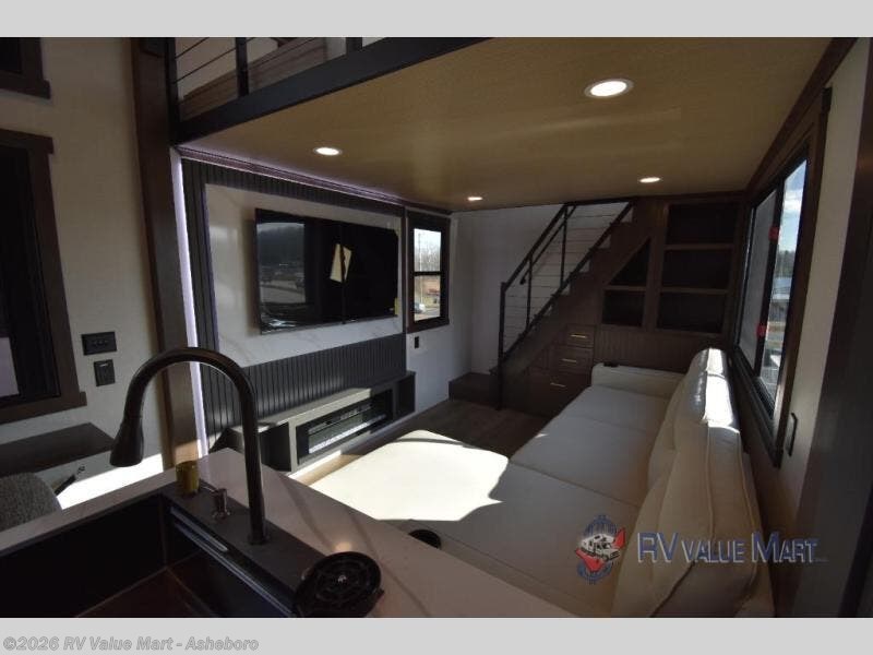 It will be so easy to enjoy extended stays in this destination fifth wheel! There is a large slide out in the main living area, a counter peninsula for more counter space, and a flip-down bar top to dine at. You'll find a comfy place to relax on the sectional sofa with a trundle bed underneath for added sleeping space. There is a loft area above the living room that includes two bunk mats and loft windows so this space seems larger, and the second loft is found above the spacious full bath. Speaking of the bath, you'll find a spacious shower and sink plus washer and dryer prep if you want the option to make laundry day easier. The front private bedroom features a king bed slide out, a front bench seat, a large wardrobe, and a dresser with a TV above to watch movies in bed.