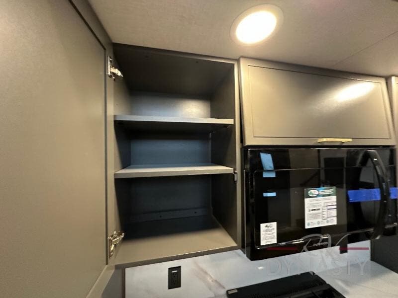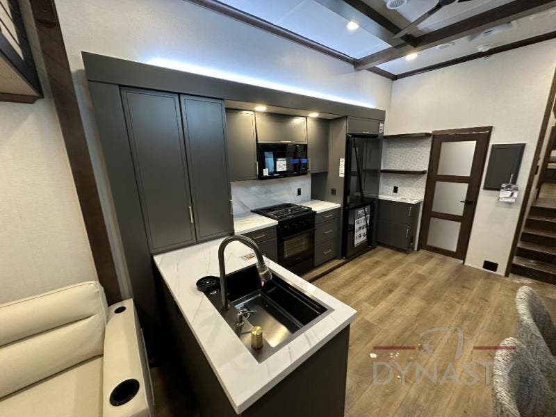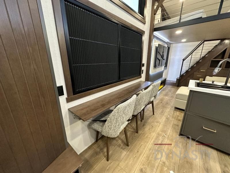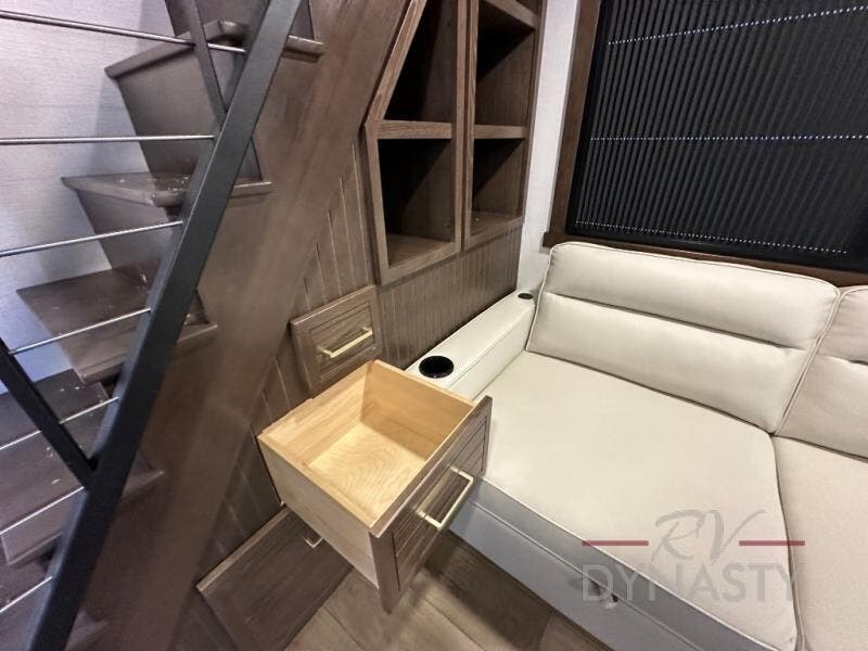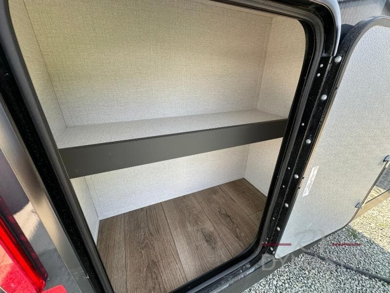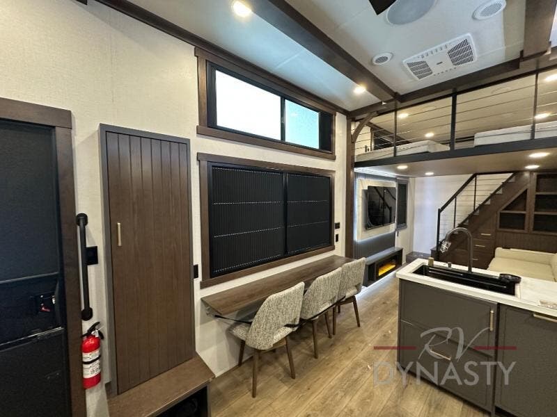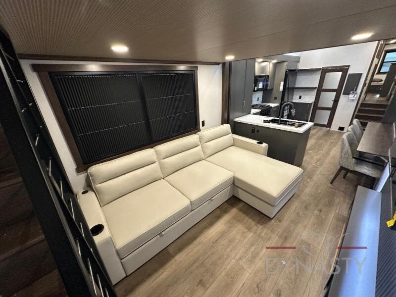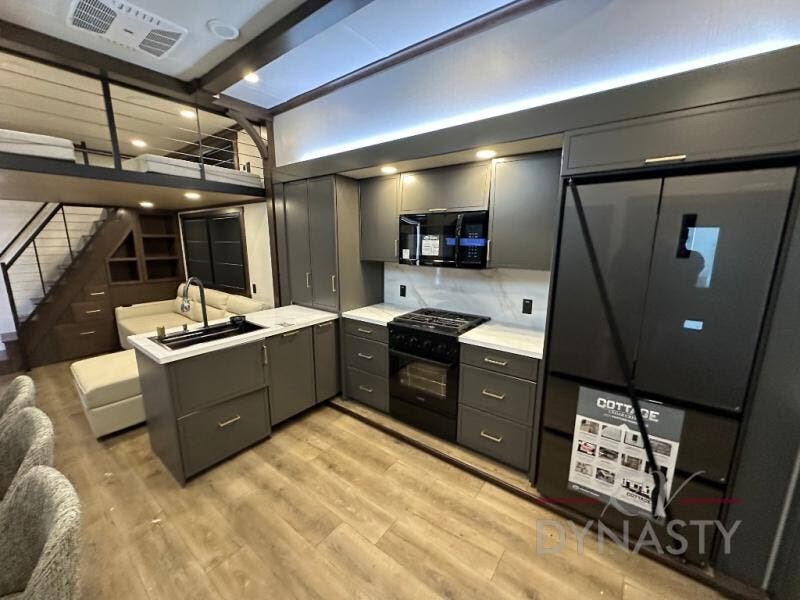 It will be so easy to enjoy extended stays in this destination fifth wheel! There is a large slide out in the main living area, a counter peninsula for more counter space, and a flip-down bar top to dine at. You'll find a comfy place to relax on the sectional sofa with a trundle bed underneath for added sleeping space. There is a loft area above the living room that includes two bunk mats and loft windows so this space seems larger, and the second loft is found above the spacious full bath. Speaking of the bath, you'll find a spacious shower and sink plus washer and dryer prep if you want the option to make laundry day easier. The front private bedroom features a king bed slide out, a front bench seat, a large wardrobe, and a dresser with a TV above to watch movies in bed.