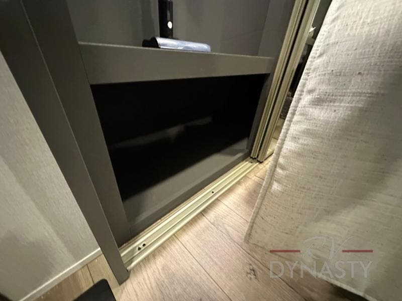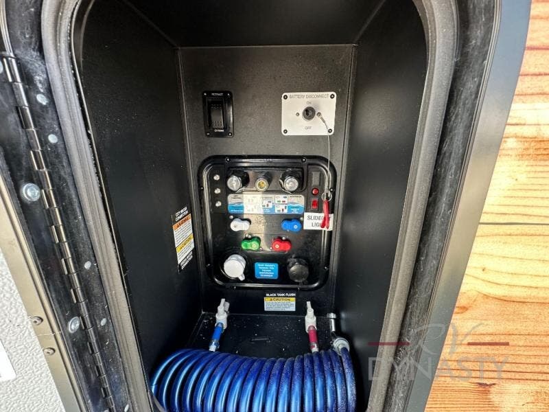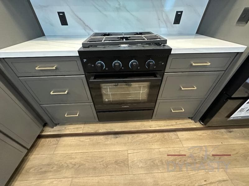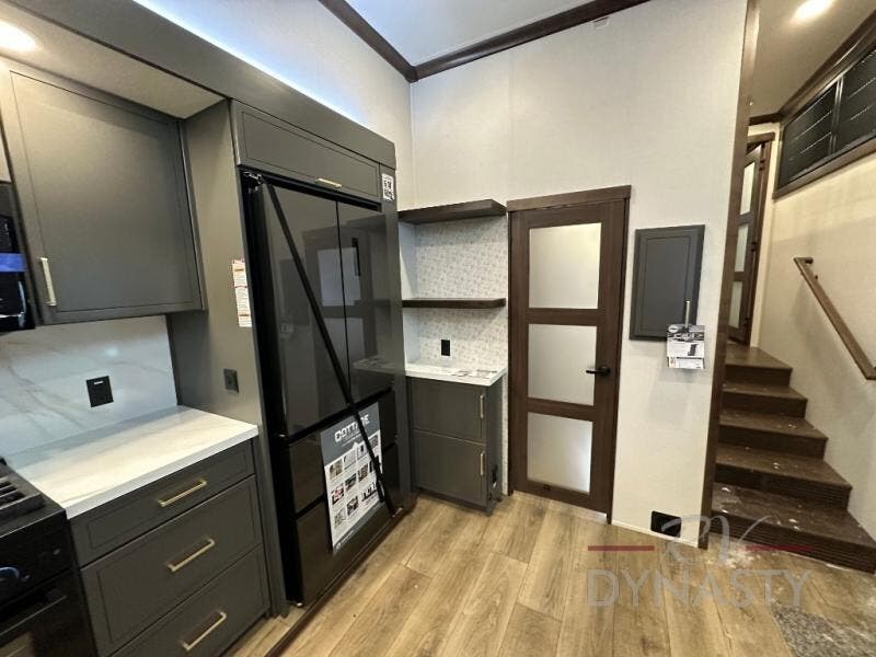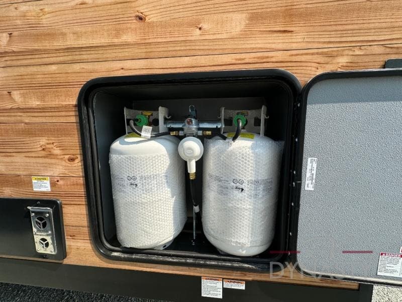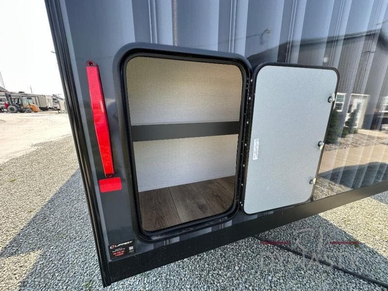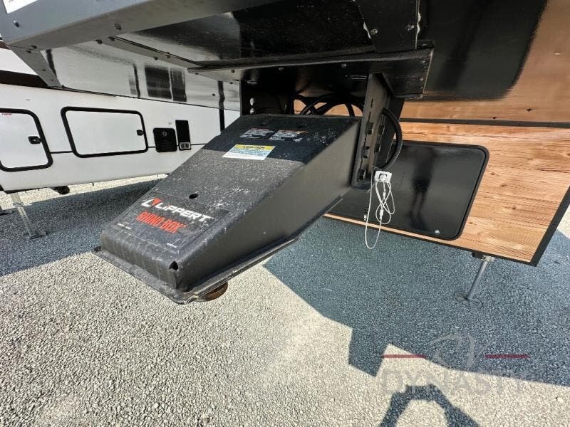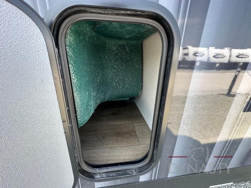 It will be so easy to enjoy extended stays in this destination fifth wheel! There is a large slide out in the main living area, a counter peninsula for more counter space, and a flip-down bar top to dine at. You'll find a comfy place to relax on the sectional sofa with a trundle bed underneath for added sleeping space. There is a loft area above the living room that includes two bunk mats and loft windows so this space seems larger, and the second loft is found above the spacious full bath. Speaking of the bath, you'll find a spacious shower and sink plus washer and dryer prep if you want the option to make laundry day easier. The front private bedroom features a king bed slide out, a front bench seat, a large wardrobe, and a dresser with a TV above to watch movies in bed.