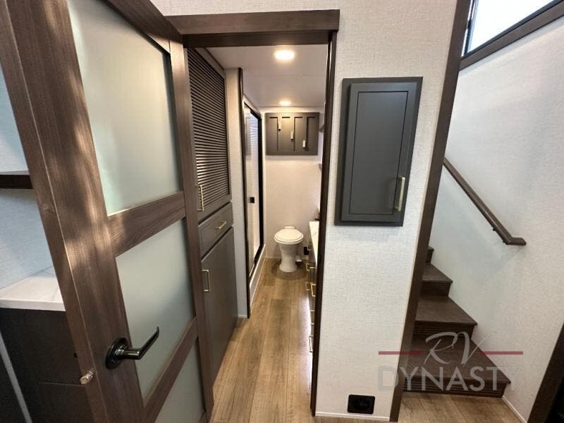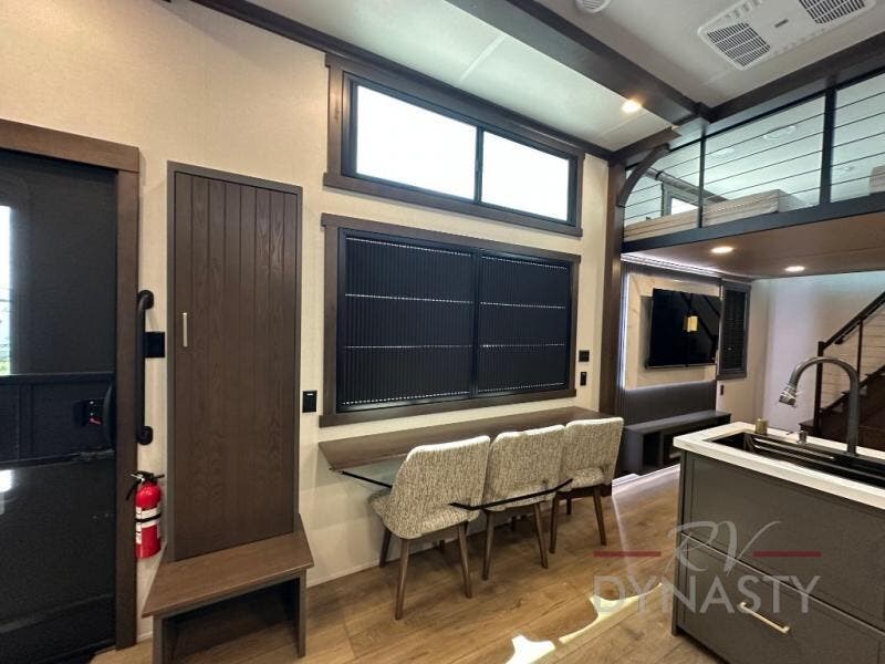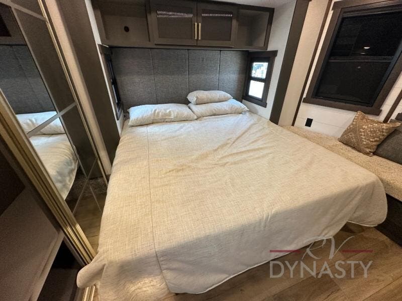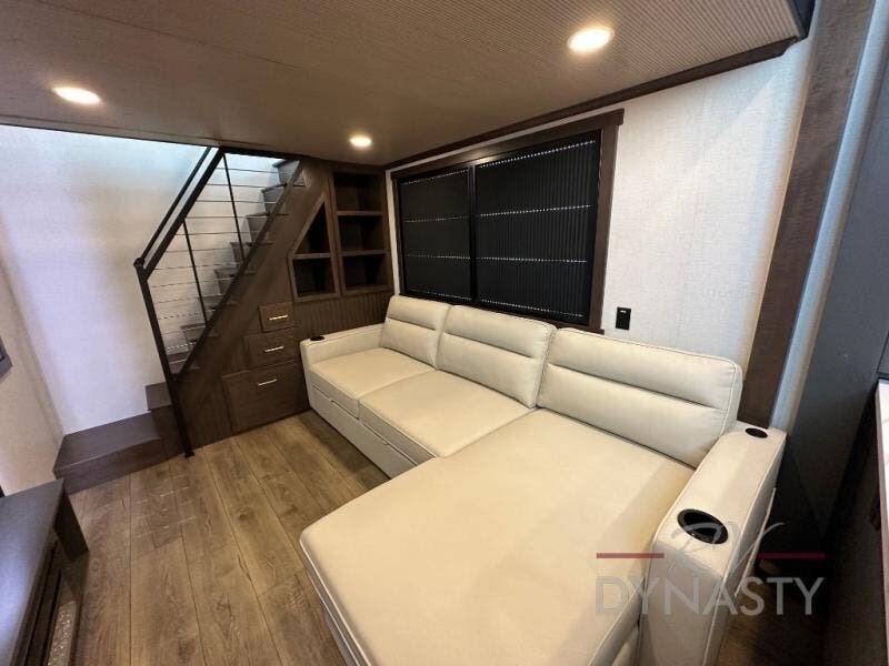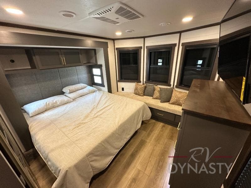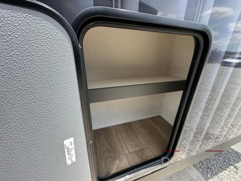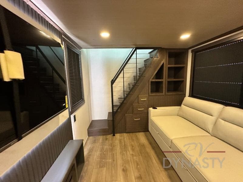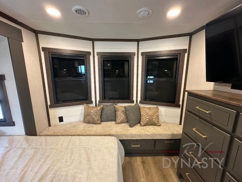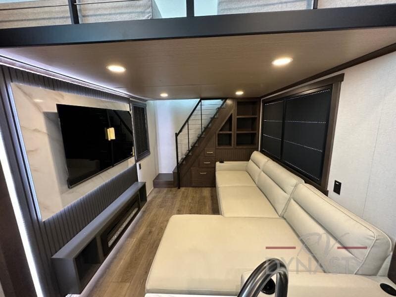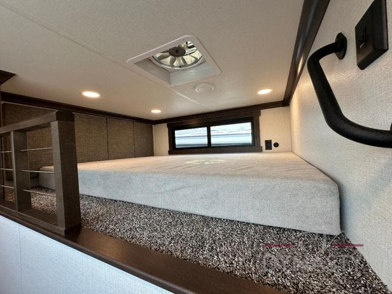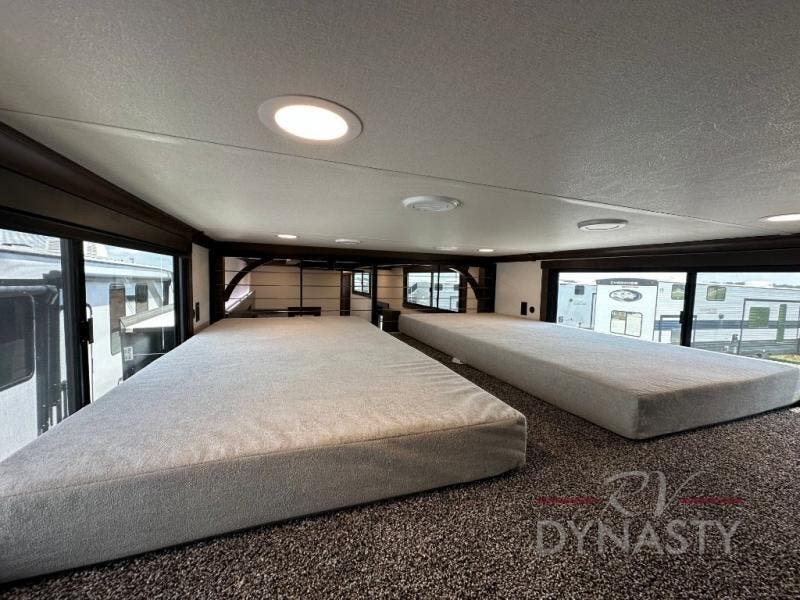 It will be so easy to enjoy extended stays in this destination fifth wheel! There is a large slide out in the main living area, a counter peninsula for more counter space, and a flip-down bar top to dine at. You'll find a comfy place to relax on the sectional sofa with a trundle bed underneath for added sleeping space. There is a loft area above the living room that includes two bunk mats and loft windows so this space seems larger, and the second loft is found above the spacious full bath. Speaking of the bath, you'll find a spacious shower and sink plus washer and dryer prep if you want the option to make laundry day easier. The front private bedroom features a king bed slide out, a front bench seat, a large wardrobe, and a dresser with a TV above to watch movies in bed.