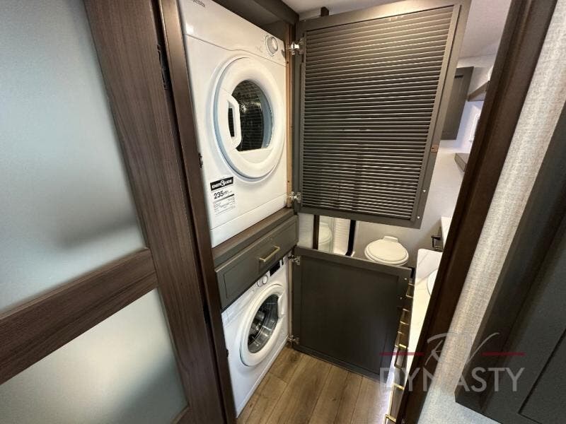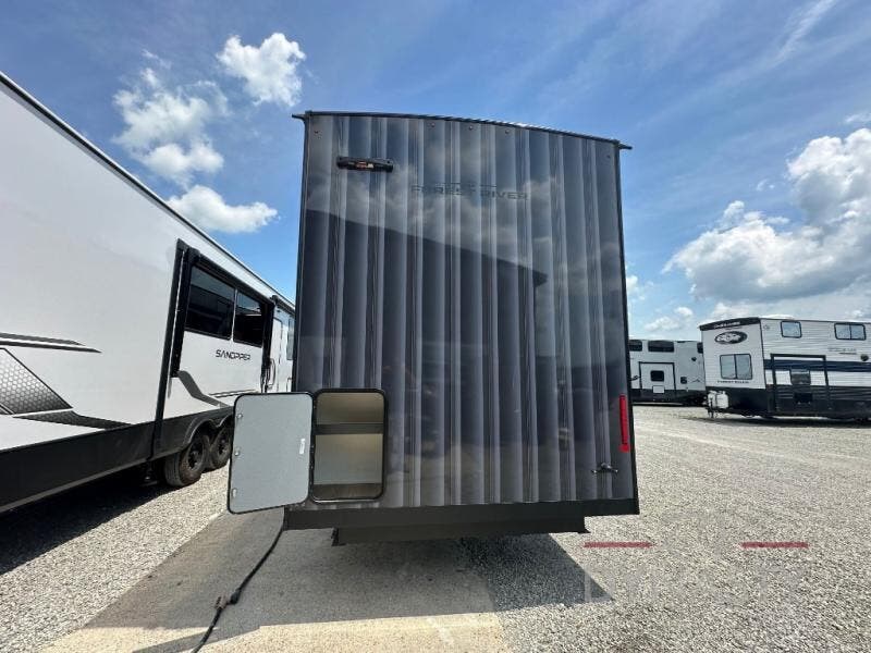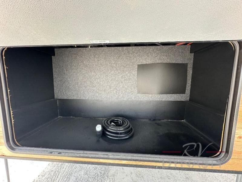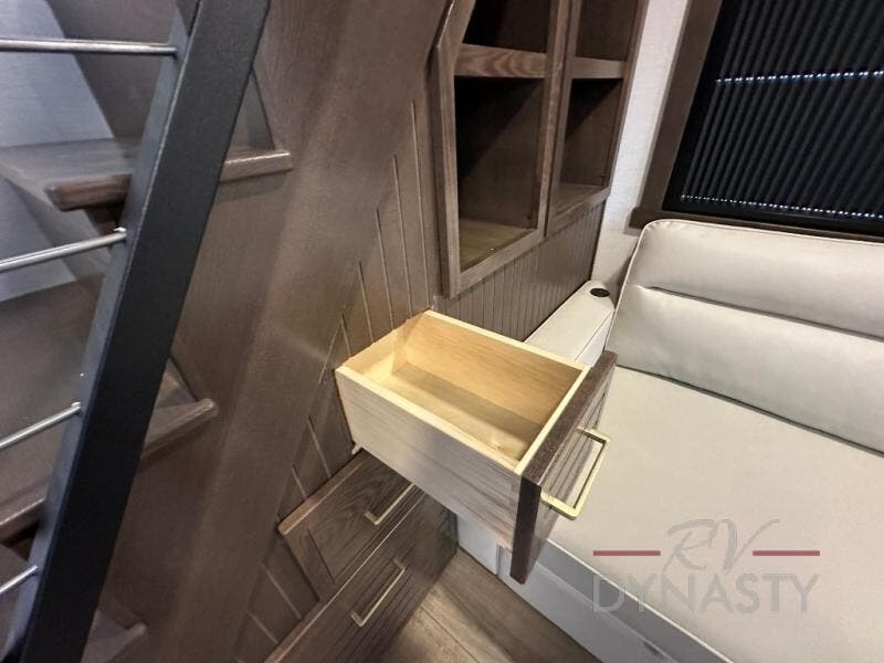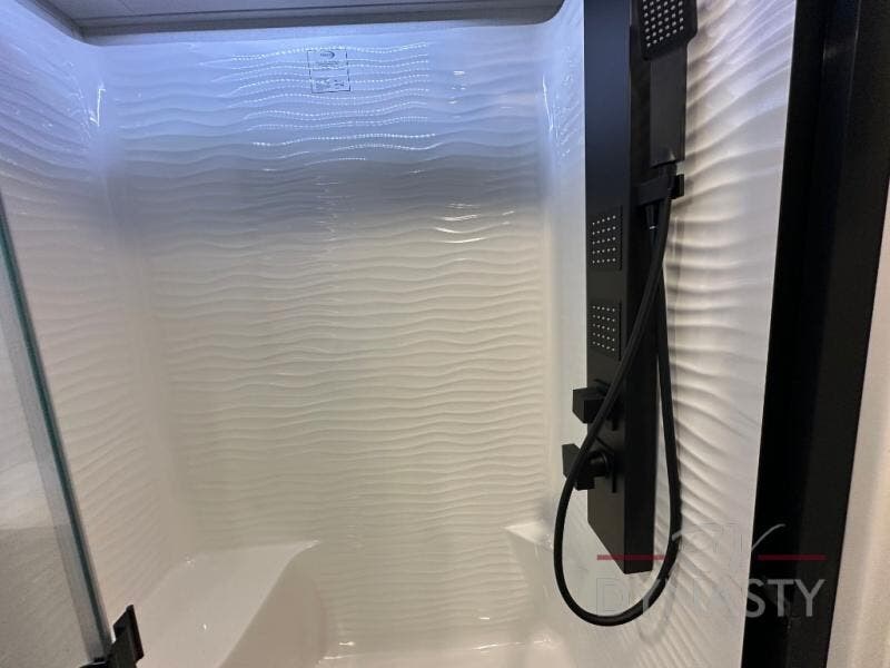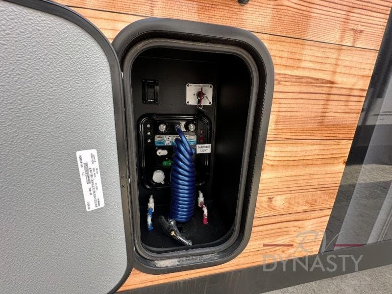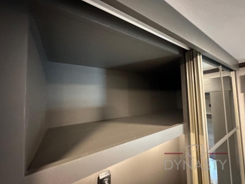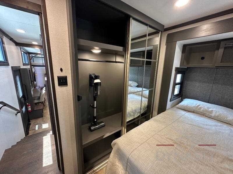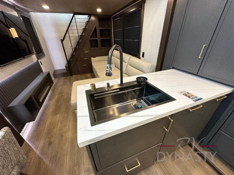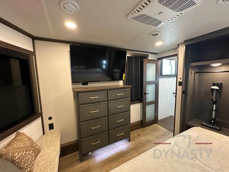 It will be so easy to enjoy extended stays in this destination fifth wheel! There is a large slide out in the main living area, a counter peninsula for more counter space, and a flip-down bar top to dine at. You'll find a comfy place to relax on the sectional sofa with a trundle bed underneath for added sleeping space. There is a loft area above the living room that includes two bunk mats and loft windows so this space seems larger, and the second loft is found above the spacious full bath. Speaking of the bath, you'll find a spacious shower and sink plus washer and dryer prep if you want the option to make laundry day easier. The front private bedroom features a king bed slide out, a front bench seat, a large wardrobe, and a dresser with a TV above to watch movies in bed.