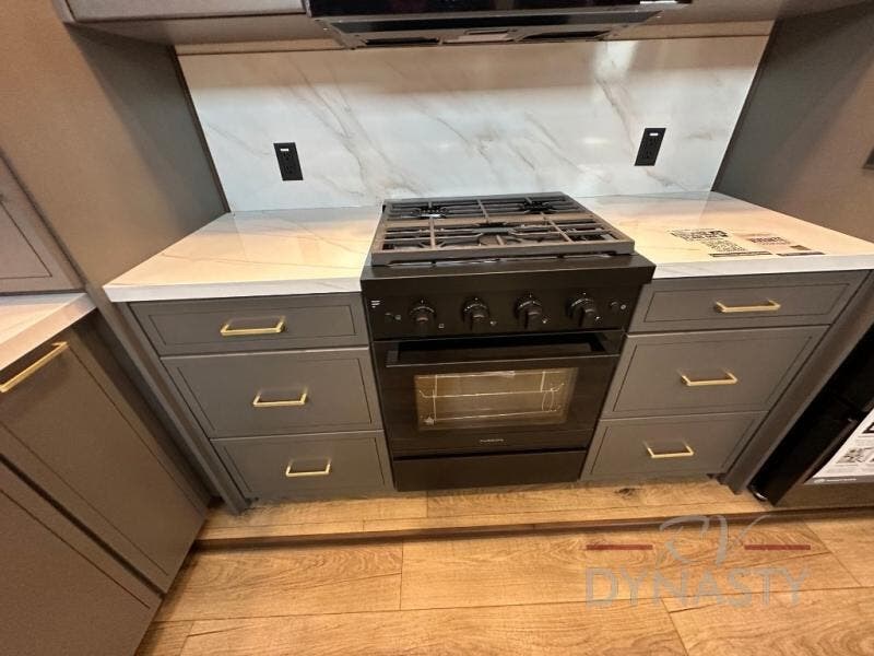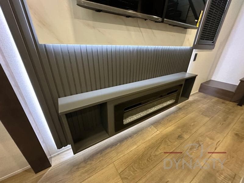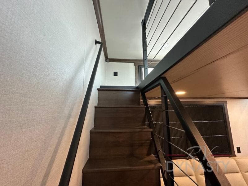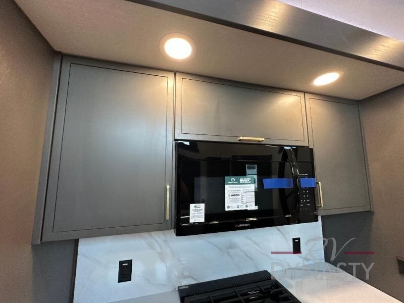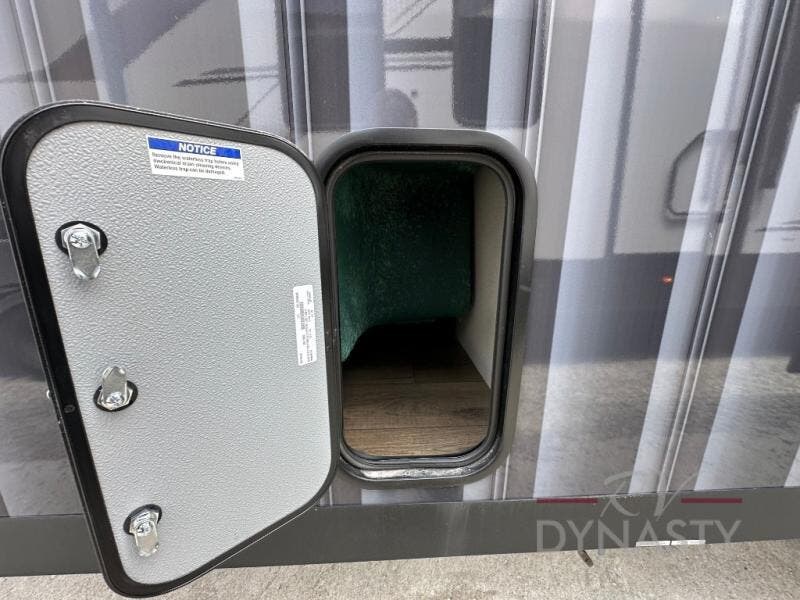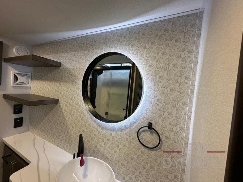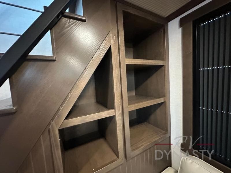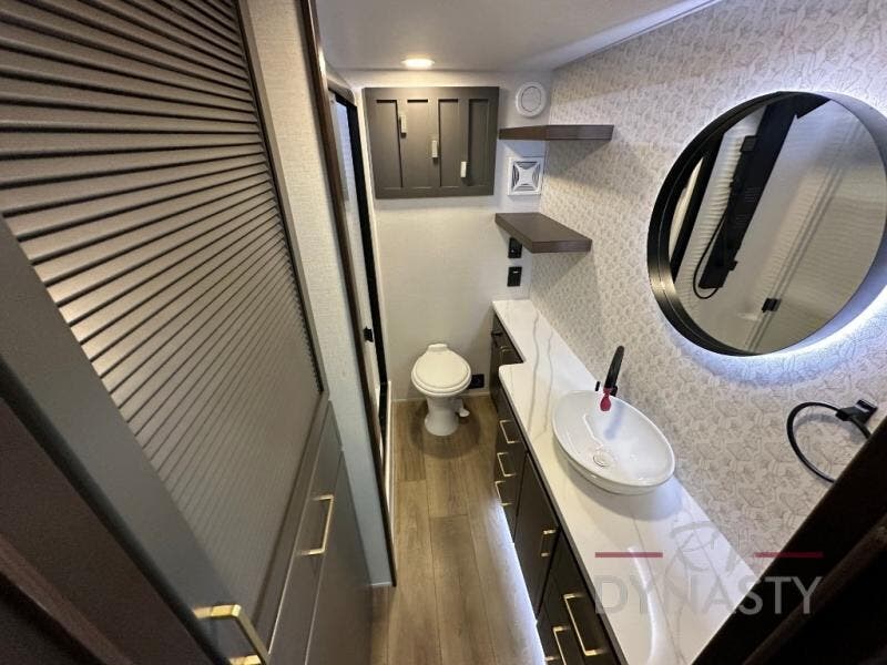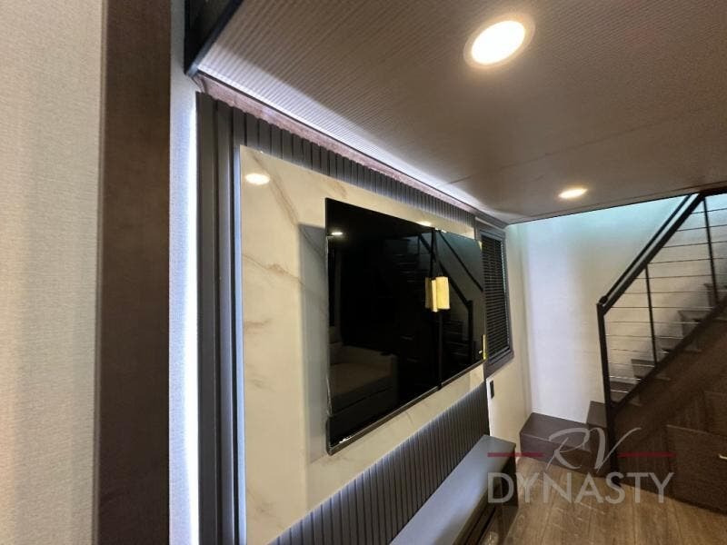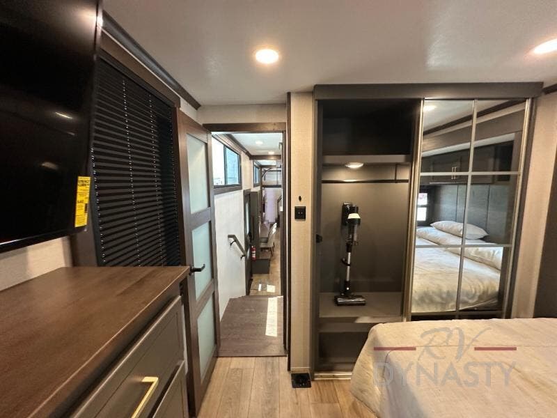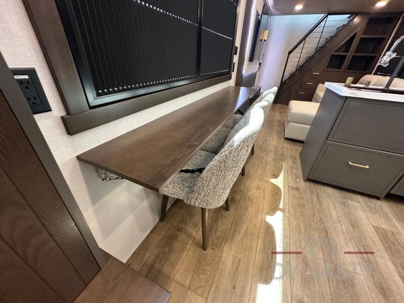It will be so easy to enjoy extended stays in this destination fifth wheel! There is a large slide out in the main living area, a counter peninsula for more counter space, and a flip-down bar top to dine at. You'll find a comfy place to relax on the sectional sofa with a trundle bed underneath for added sleeping space. There is a loft area above the living room that includes two bunk mats and loft windows so this space seems larger, and the second loft is found above the spacious full bath. Speaking of the bath, you'll find a spacious shower and sink plus washer and dryer prep if you want the option to make laundry day easier. The front private bedroom features a king bed slide out, a front bench seat, a large wardrobe, and a dresser with a TV above to watch movies in bed.