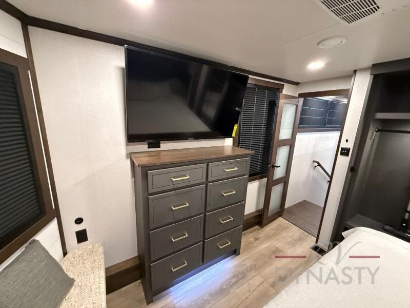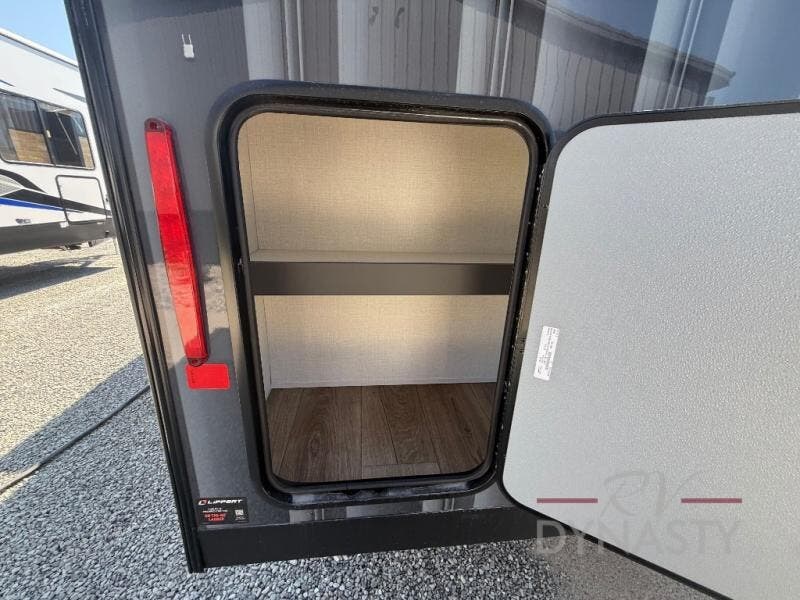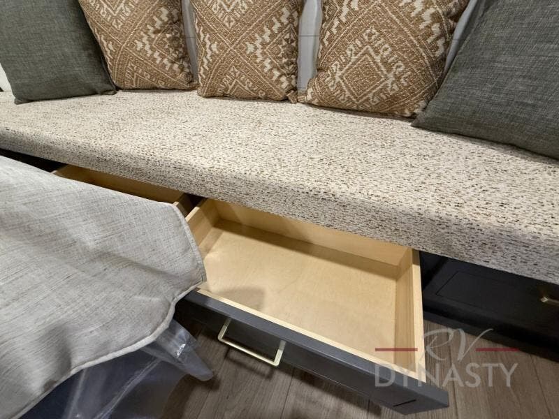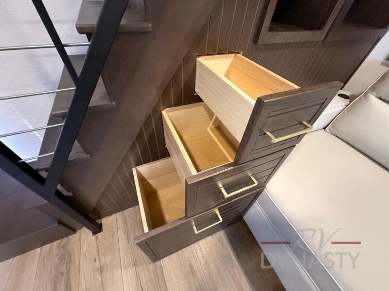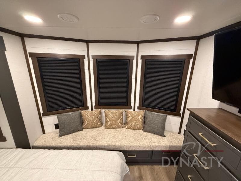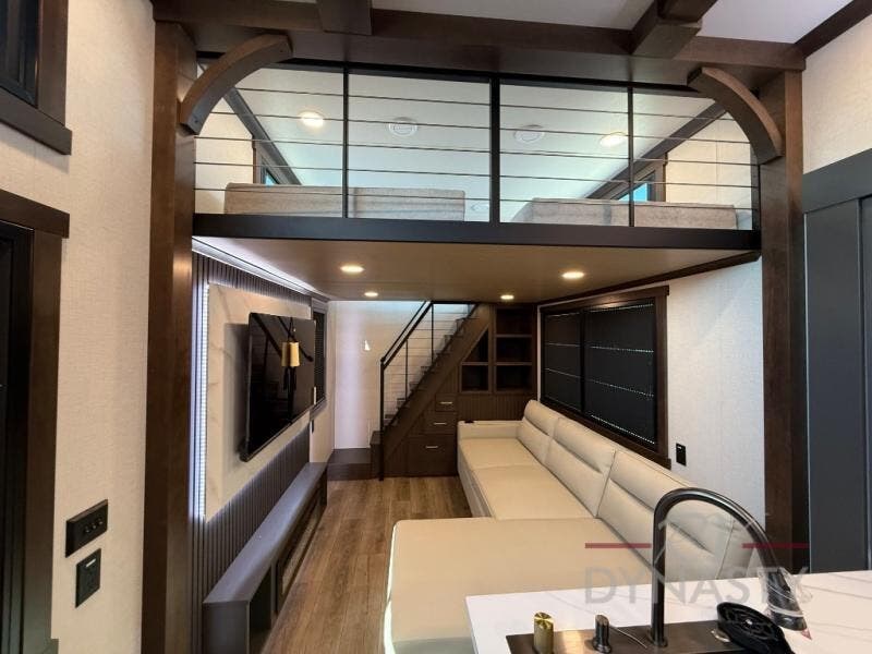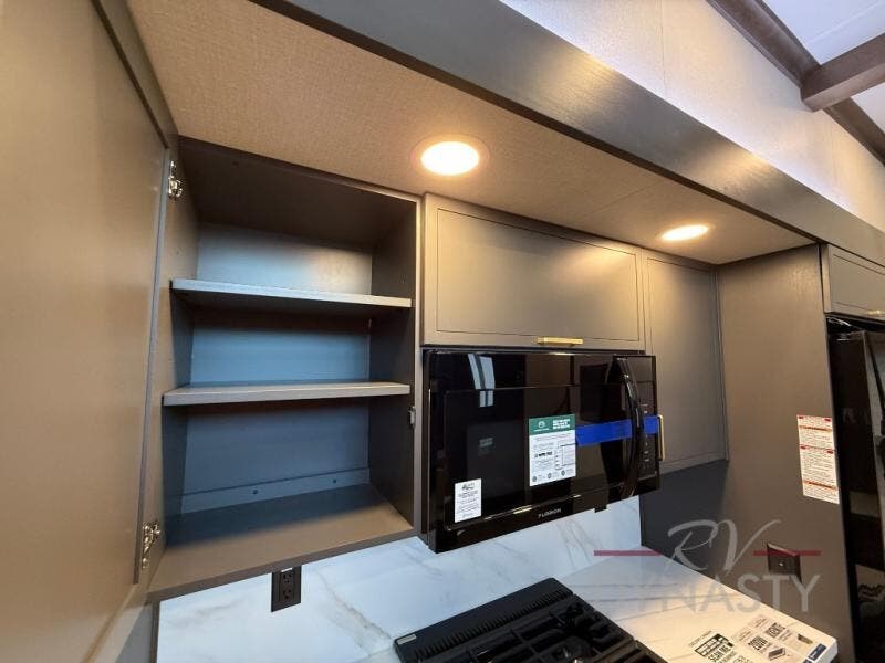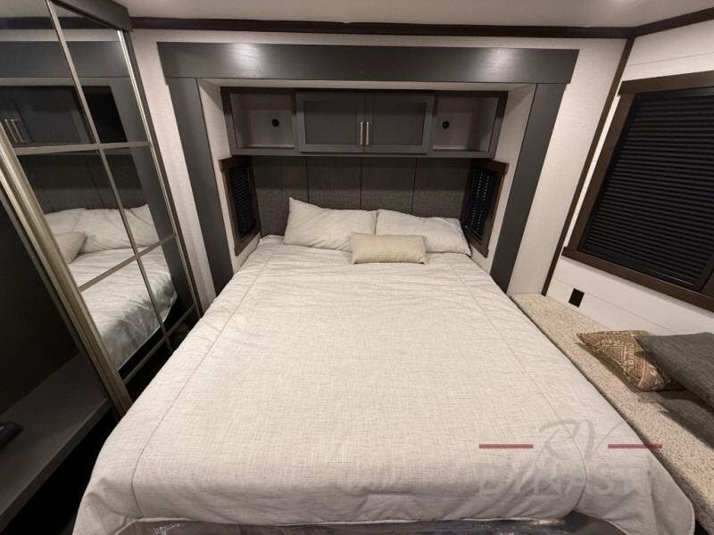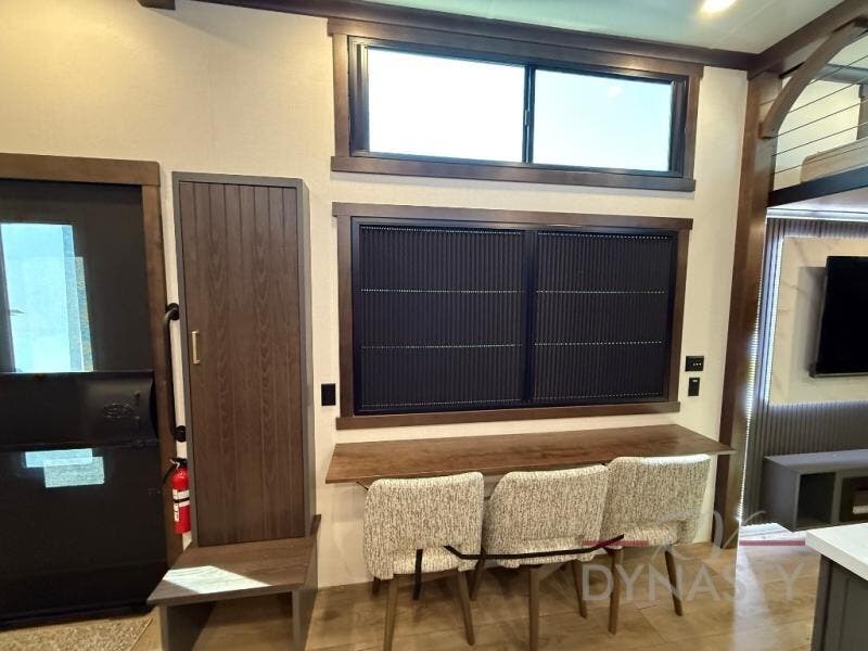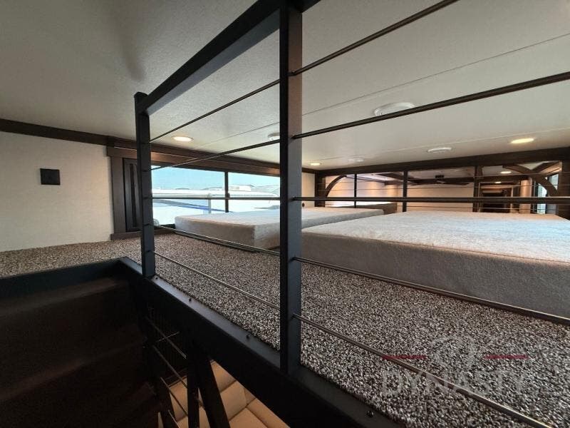 It will be so easy to enjoy extended stays in this destination fifth wheel! There is a large slide out in the main living area, a counter peninsula for more counter space, and a flip-down bar top to dine at. You'll find a comfy place to relax on the sectional sofa with a trundle bed underneath for added sleeping space. There is a loft area above the living room that includes two bunk mats and loft windows so this space seems larger, and the second loft is found above the spacious full bath. Speaking of the bath, you'll find a spacious shower and sink plus washer and dryer prep if you want the option to make laundry day easier. The front private bedroom features a king bed slide out, a front bench seat, a large wardrobe, and a dresser with a TV above to watch movies in bed.