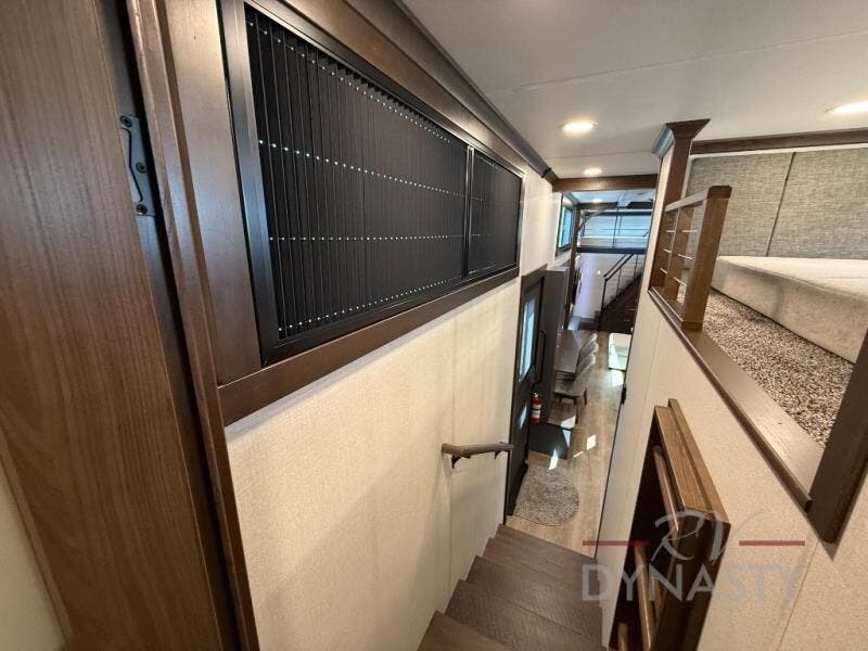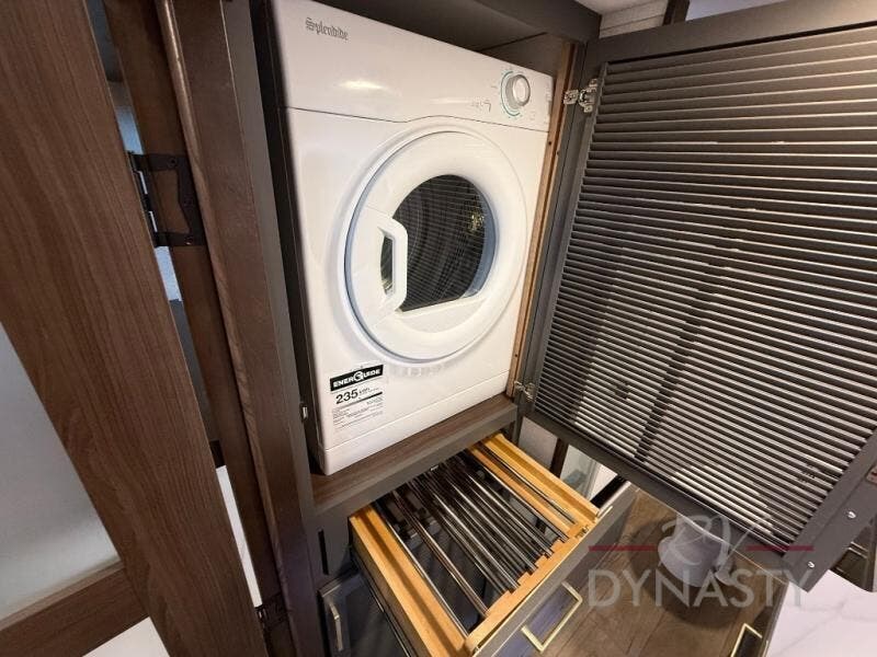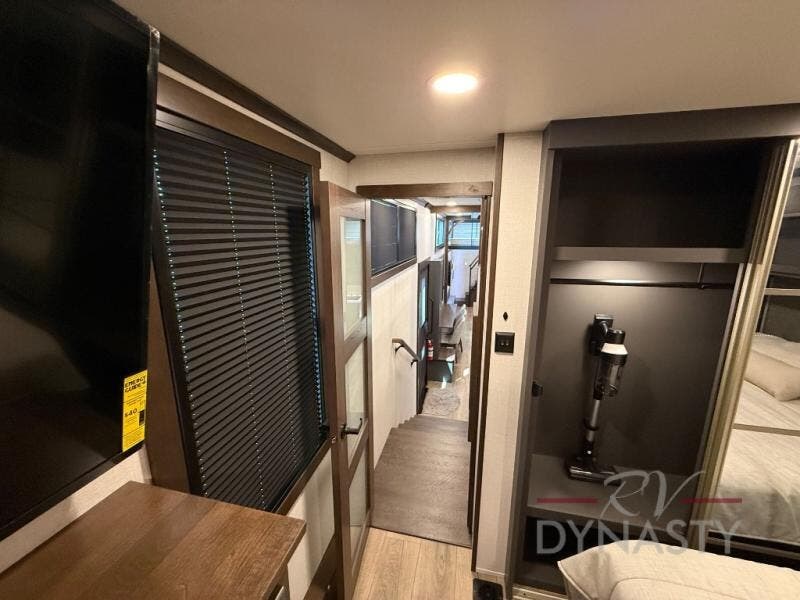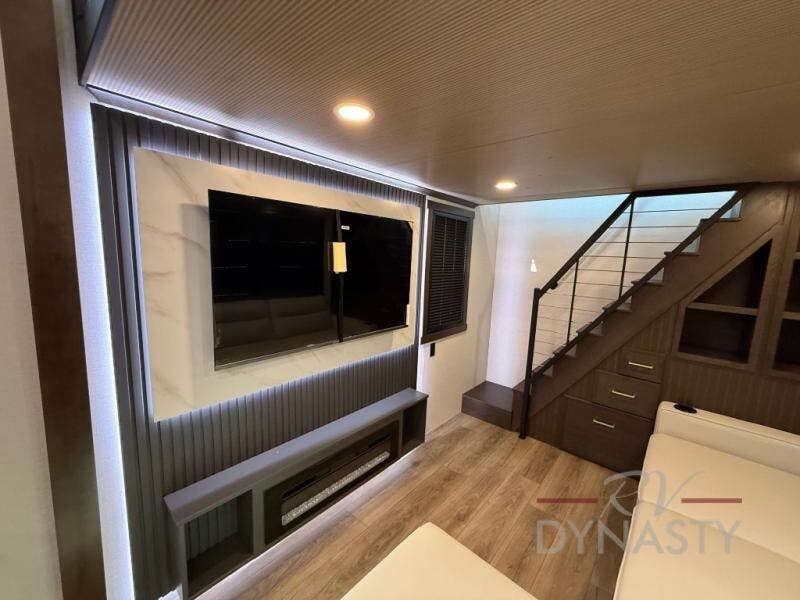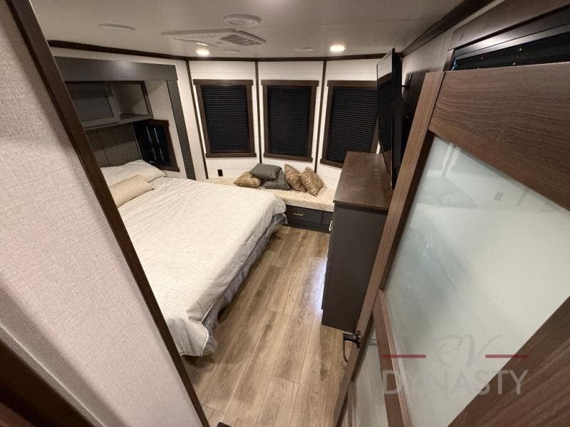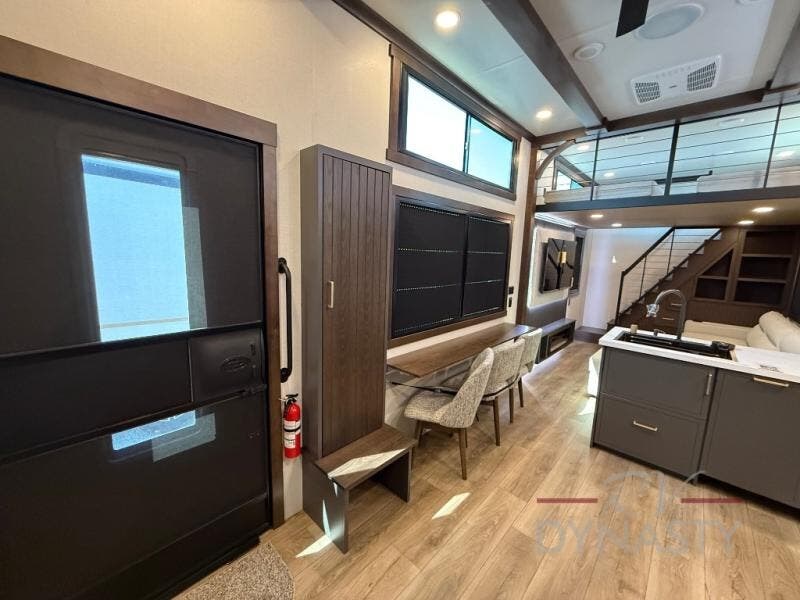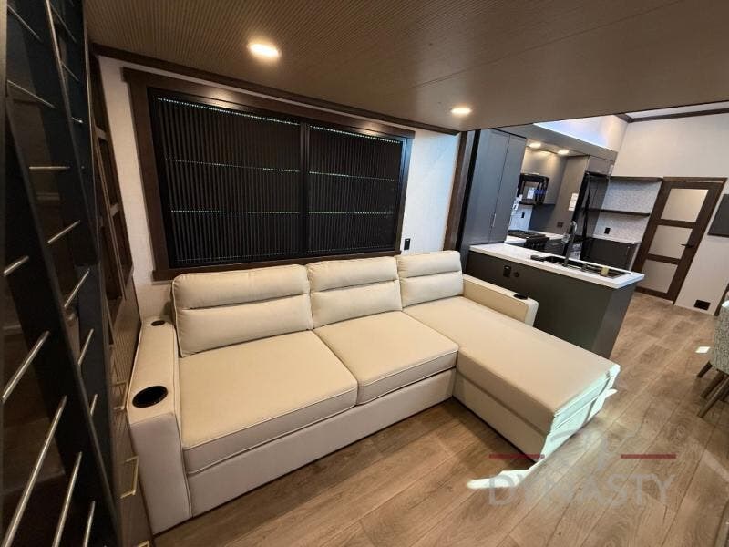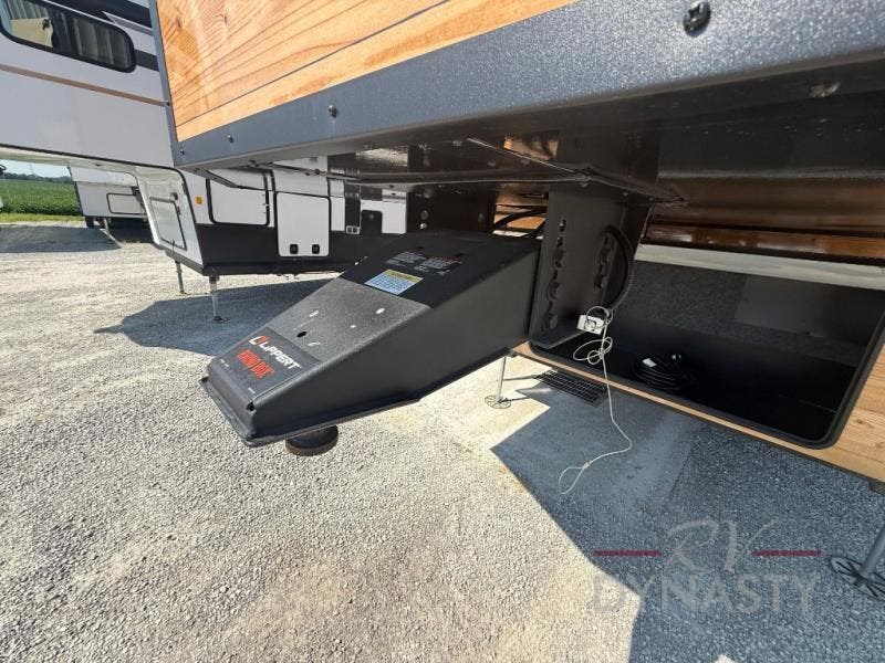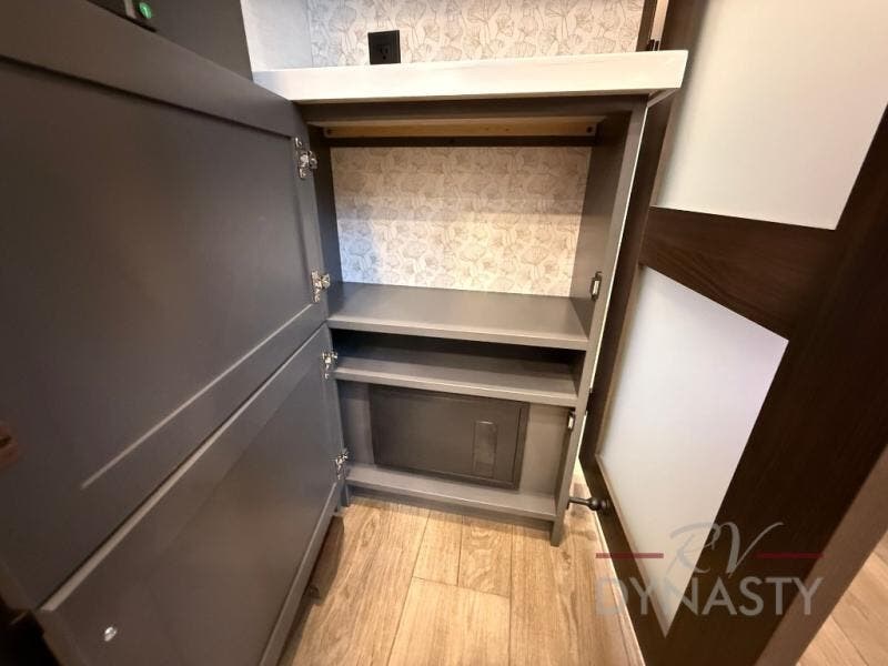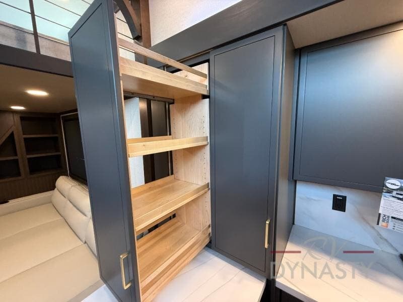 It will be so easy to enjoy extended stays in this destination fifth wheel! There is a large slide out in the main living area, a counter peninsula for more counter space, and a flip-down bar top to dine at. You'll find a comfy place to relax on the sectional sofa with a trundle bed underneath for added sleeping space. There is a loft area above the living room that includes two bunk mats and loft windows so this space seems larger, and the second loft is found above the spacious full bath. Speaking of the bath, you'll find a spacious shower and sink plus washer and dryer prep if you want the option to make laundry day easier. The front private bedroom features a king bed slide out, a front bench seat, a large wardrobe, and a dresser with a TV above to watch movies in bed.
