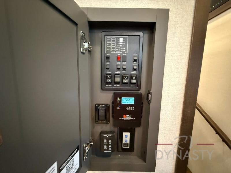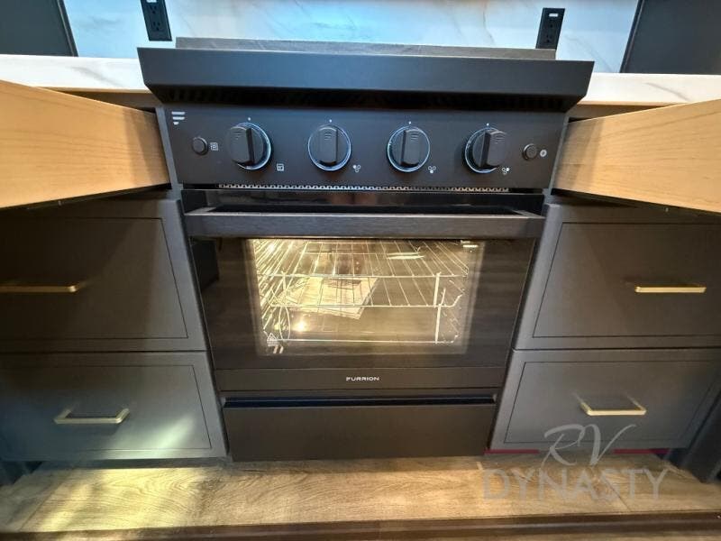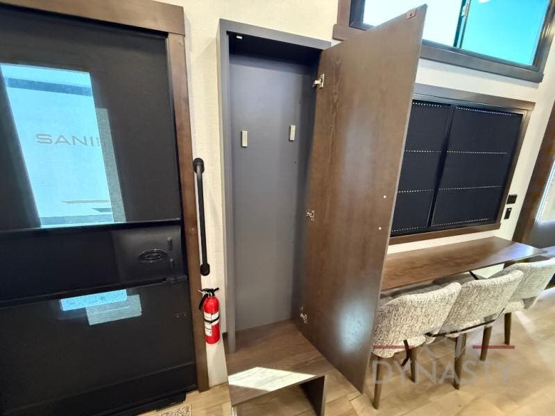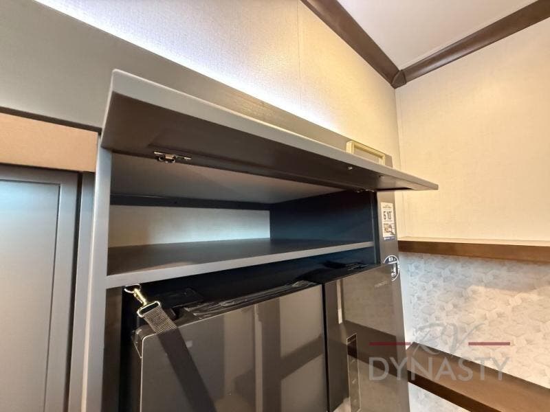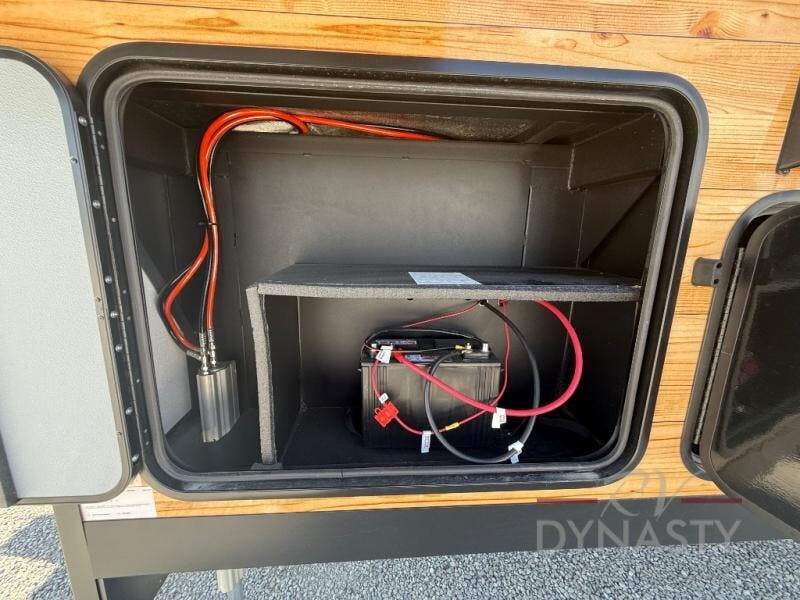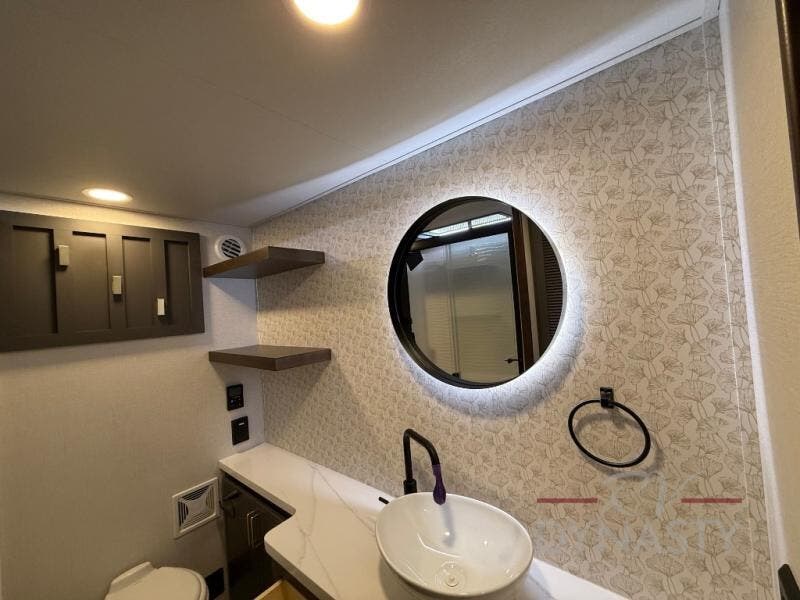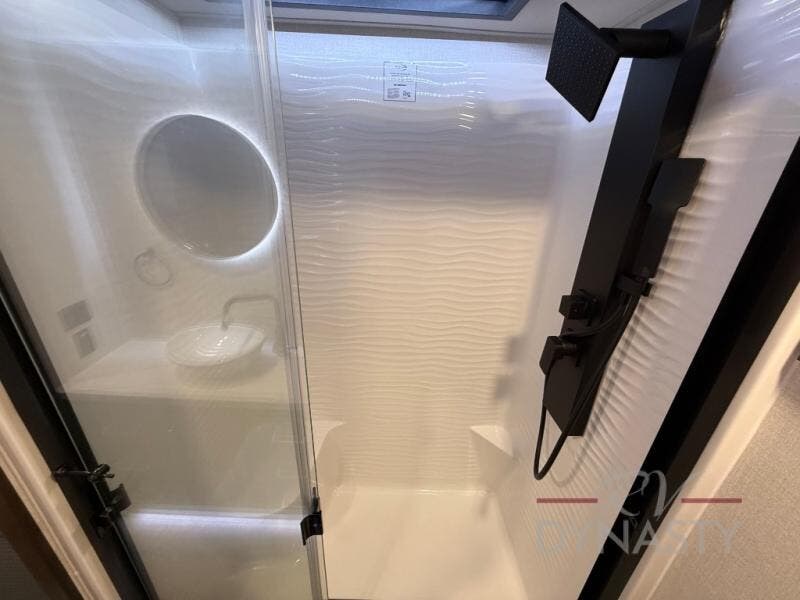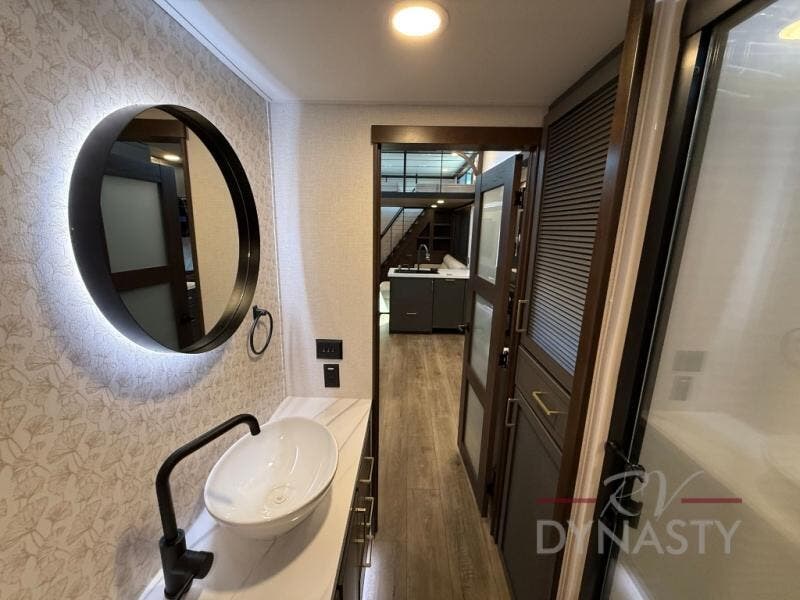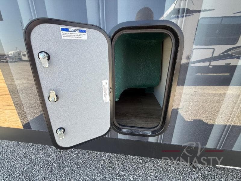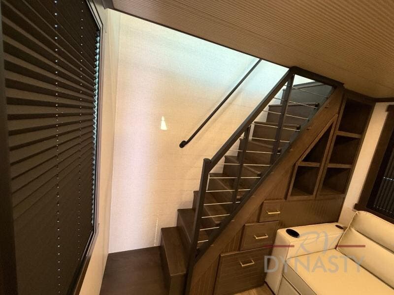 It will be so easy to enjoy extended stays in this destination fifth wheel! There is a large slide out in the main living area, a counter peninsula for more counter space, and a flip-down bar top to dine at. You'll find a comfy place to relax on the sectional sofa with a trundle bed underneath for added sleeping space. There is a loft area above the living room that includes two bunk mats and loft windows so this space seems larger, and the second loft is found above the spacious full bath. Speaking of the bath, you'll find a spacious shower and sink plus washer and dryer prep if you want the option to make laundry day easier. The front private bedroom features a king bed slide out, a front bench seat, a large wardrobe, and a dresser with a TV above to watch movies in bed.