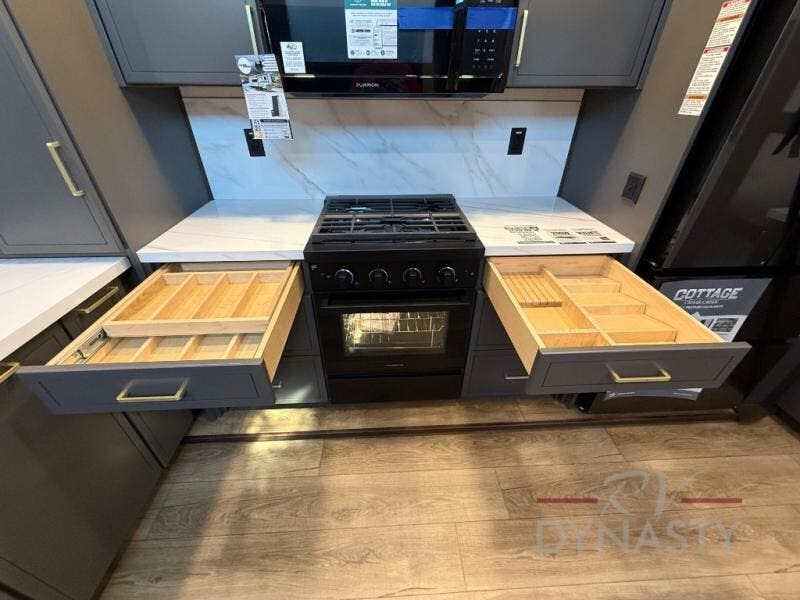 With any Cedar Creek Cottage destination trailer by Forest River, you can enjoy extended stays with residential features at the location of your choice! Each model is built with 3M bonded sidewalls that grow stronger with age and are resistant to UV, heat, oil, moisture, and more. There is also an AlphaPly TPO roof membrane, detachable entry steps, and new waterproof and bug proof Vixenite slide room floor panels for added durability. Head inside where you'll find residential dovetail, self-closing drawers, flush floor slides in the kitchen and living area, a residential style headboard and luxurious bedding decor, and extra storage for linens in the bedroom and bath. Each model is also pre-wired for satellite to the roof, and you can stay connected with the new Cradle Point WiFi/5G antenna and Day 1 connectivity.