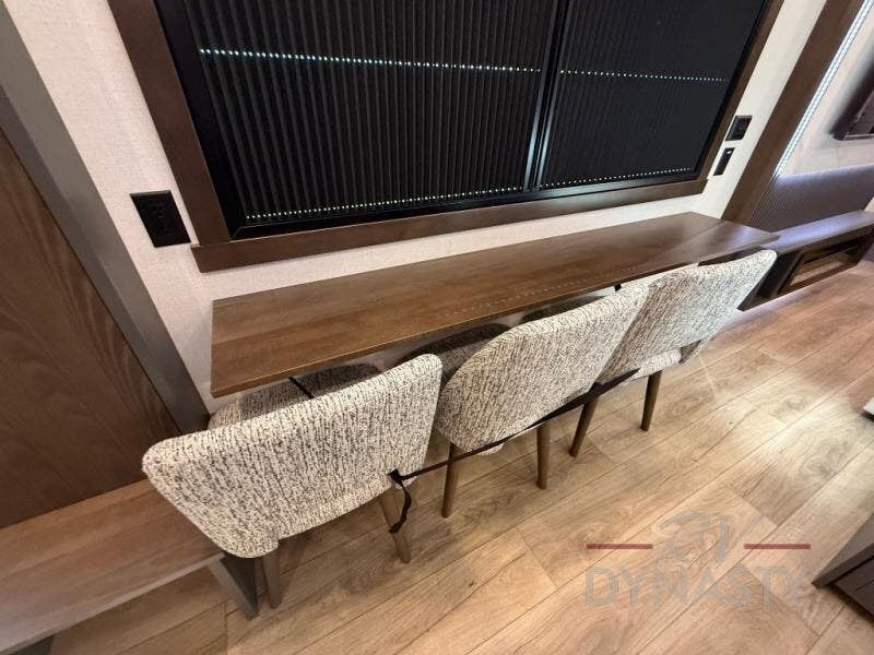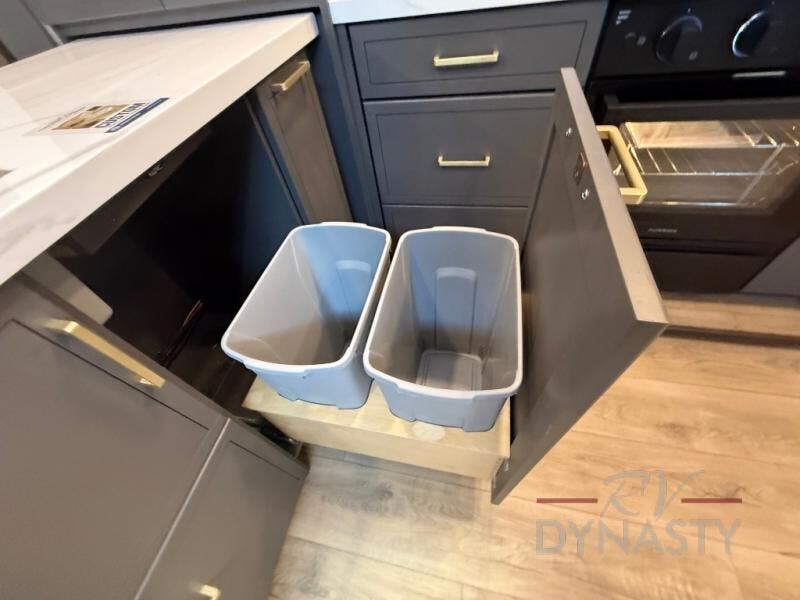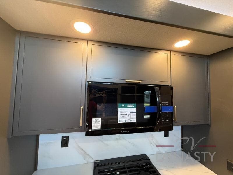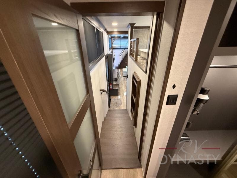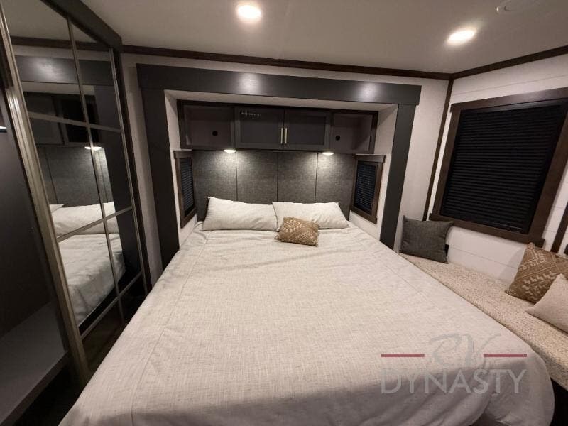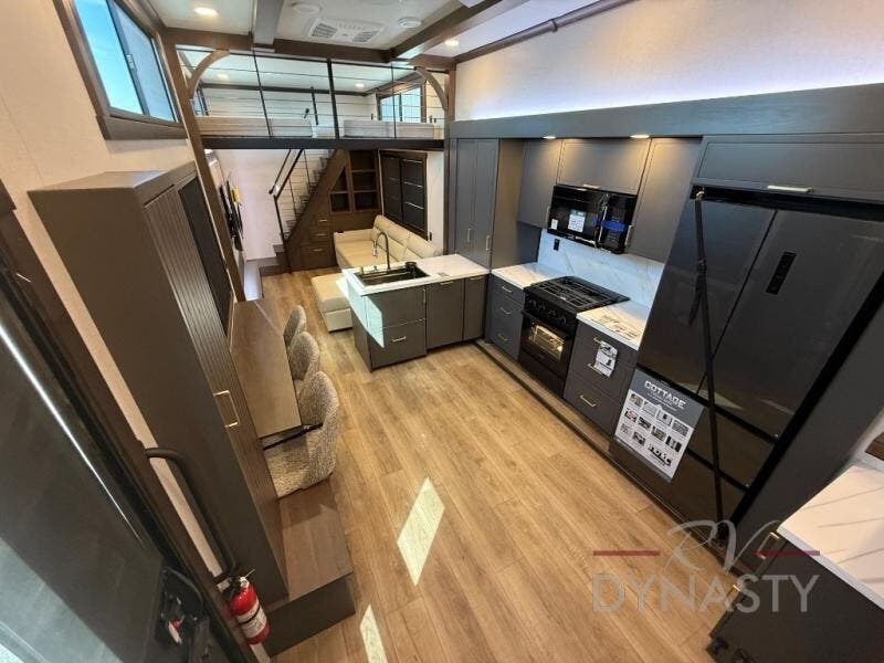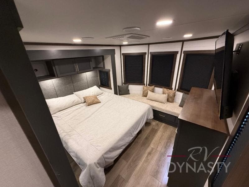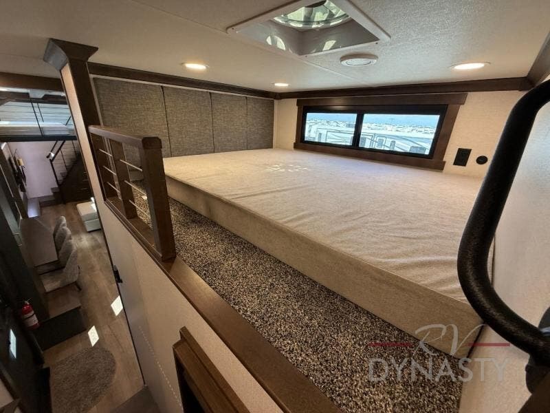 It will be so easy to enjoy extended stays in this destination fifth wheel! There is a large slide out in the main living area, a counter peninsula for more counter space, and a flip-down bar top to dine at. You'll find a comfy place to relax on the sectional sofa with a trundle bed underneath for added sleeping space. There is a loft area above the living room that includes two bunk mats and loft windows so this space seems larger, and the second loft is found above the spacious full bath. Speaking of the bath, you'll find a spacious shower and sink plus washer and dryer prep if you want the option to make laundry day easier. The front private bedroom features a king bed slide out, a front bench seat, a large wardrobe, and a dresser with a TV above to watch movies in bed.