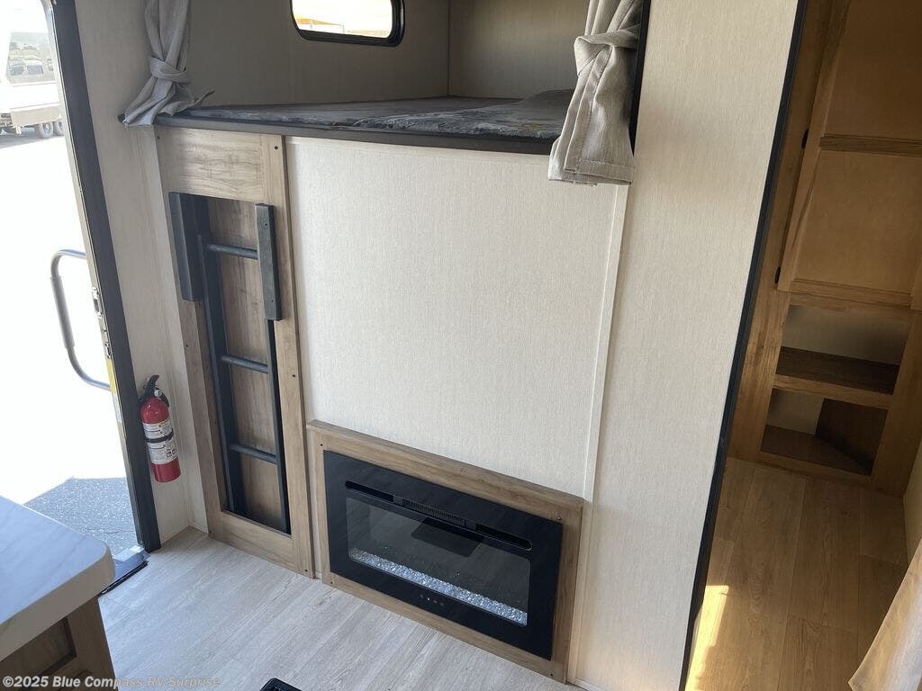 Escape your ordinary life with this innovative travel trailer! It features 64" top bunk bed above a 36" bottom bunk with wardrobes on either side of them, plus there is a wall at the foot of the beds with a fireplace on the other side. You will have your own privacy with the front private bedroom that has a walk-around queen bed with wardrobes on either side and an entrance into the dual entry bathroom which has a neo-angled shower to freshen up in each morning. The sofa and U-shaped dinette can also transform into extra sleeping spaces when you aren't using them to enjoy a meal or relax in front of the TV mount. The outdoor bar and grill comes with a 5.6 cu. ft. outdoor refrigerator and everything you need to prepare delicious meals outdoors. You even have a rear storage rack and outside storage areas to store your outdoor gear!