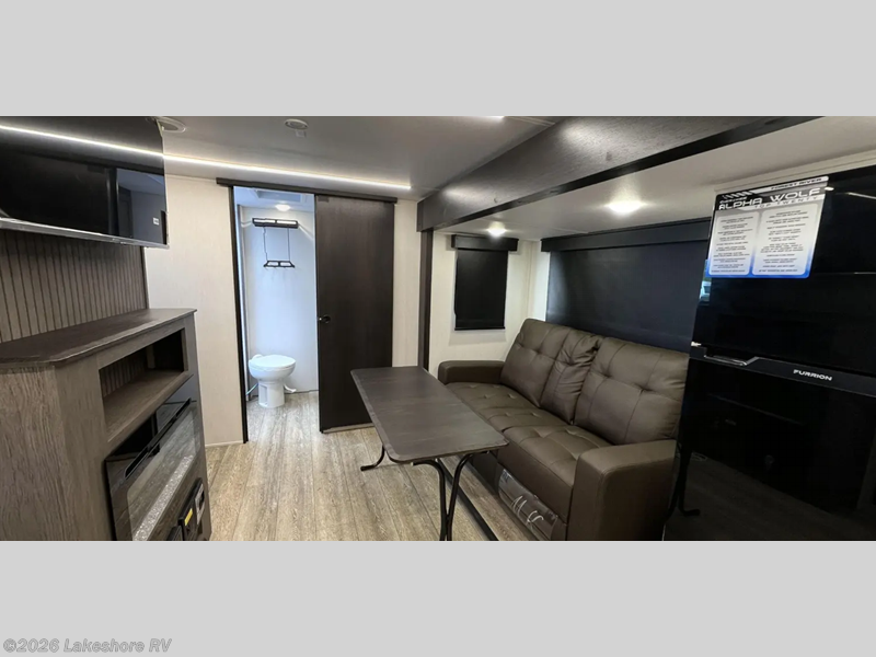 Looking for the perfect trailer for two with a spacious bathroom and bedroom? This Alpha Wolf provides a rear oversized bathroom complete with linen storage and a sliding door that saves space and looks great. The front bedroom includes a walk-around queen bed, dual wardrobes, a sliding door plus windows for natural lighting and great views. The main living and kitchen area is spacious as well with a large slide out that includes theater seating with a removable table across from the entertainment center with a fireplace, a 12V residential style refrigerator for lots of cold storage, and a pantry for your snacks and dry goods. You can decide to cook indoors on the three burner cooktop, or head outdoors to cook on the outside kitchen!