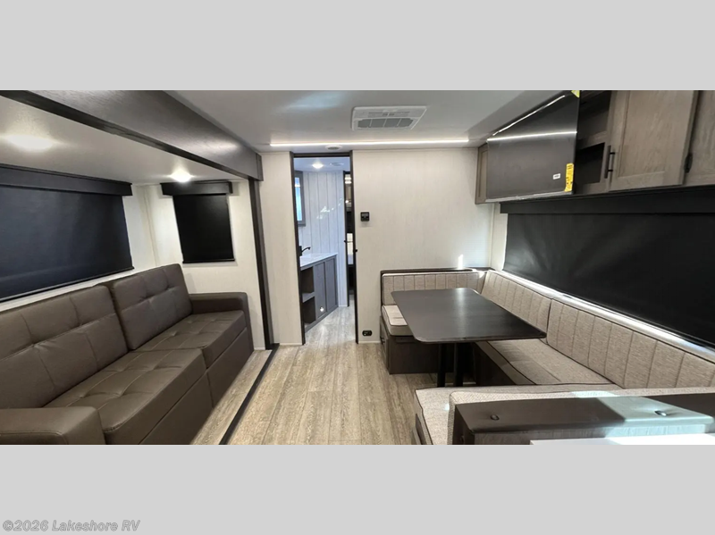 You and your spouse will have a comfortable time camping in this travel trailer! The front private bedroom has a queen bed with wardrobes on either side of it, plus one of the dual entry doors to the unit. As you leave the bedroom, you will enter the walk-through bathroom which has a shower with a skylight above for more head space and natural lighting. The chef can prepare their best home cooked meals in the rear kitchen, and you can enjoy them around the U-shaped dinette before storing any leftovers in the 12V refrigerator. And the tri-fold sofa within the large slide out will provide additional seating and sleeping space!