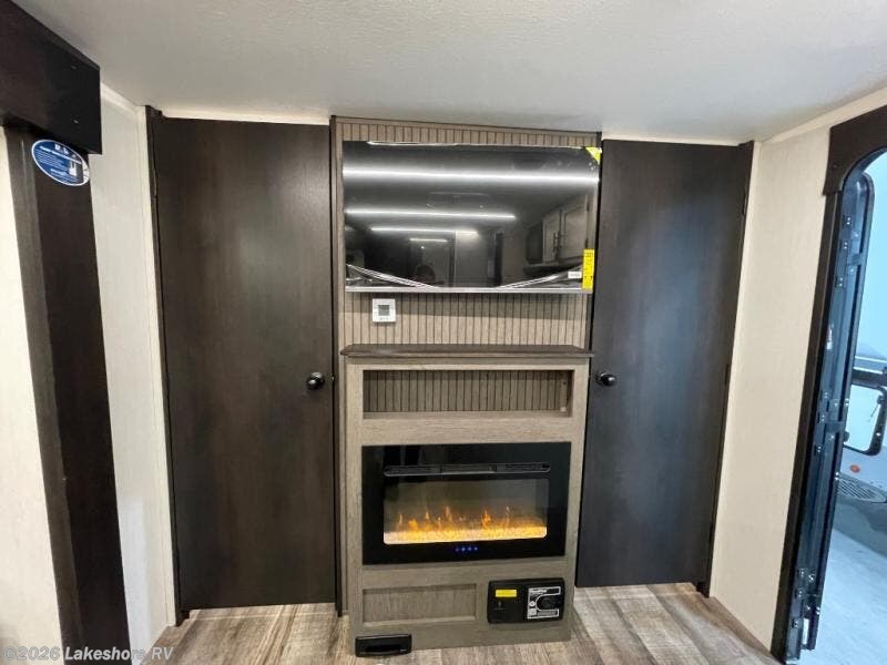 Looking for a spacious travel trailer to sleep nine or ten happy campers? You've found it in this Cherokee Alpha Wolf model with a handy outside kitchen, a bunkhouse with a dinette, a front private bedroom, and a large slide out! The main living and kitchen area has a U-shaped dinette to utilize as a dining table, game table, work station, and/or an extra sleeping space. There is also a jackknife sofa for seating, TV watching, or sleeping. From any seating area you can easily view the entertainment center and fireplace which is centered in the unit with doors on either side to the front private bedroom. You will also find a nice pantry and full kitchen amenities including a large sink, and residential-style refrigerator allowing you to easily create meals for your hungry crew. The exterior provides an 18' awning for an outdoor living area over the outside kitchen, and there is ample exterior storage for all of your camping gear like camp chairs, outside games, rugs, and more.