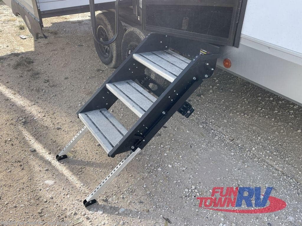 It will be so easy to find comfort in this travel trailer! The dual opposing slides in the combined kitchen and living room will create an open floorplan you are sure to love. There is a rear tri-fold sofa, theater seating across from an entertainment center, plus a table with chairs and a storage ottoman seat to keep games organized. The chef of your group will love having extra counter space provided by the kitchen island, and there is a hutch to keep nice dishes stored away. Up front, the private bedroom includes a king bed slide out, dual wardrobes and a dresser, plus a front sun bench where you can sit to pull your hiking boots on. There is even a wardrobe with washer and dryer prep if you choose to add those appliances!
