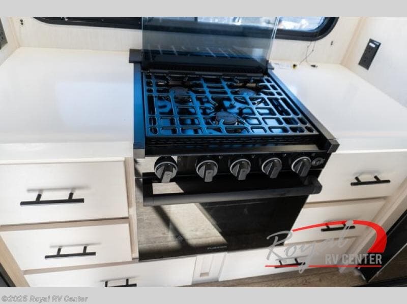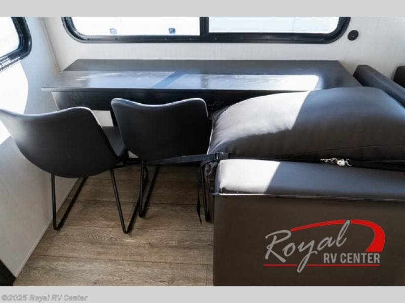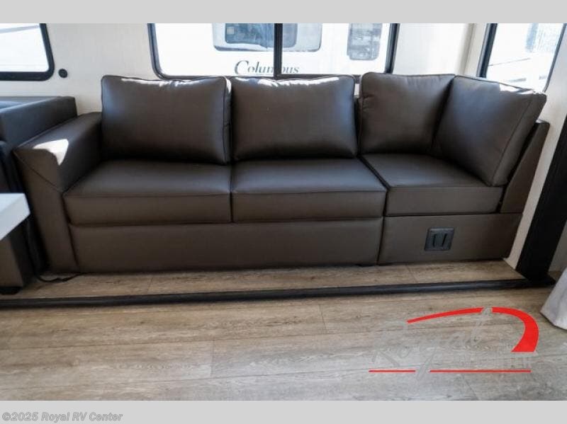 You're going to love camping in this triple slide out fifth wheel that is packed with amenities! The rear deck with a covered patio will provide a place to visit with campground neighbors, and inside, there is an L-shaped tri-fold sofa where guests can sleep. You'll find a king bed slide in the front master bedroom for you, along with a front bench seat, a bedroom fireplace, plus washer and dryer prep if you choose to add these appliances. The kitchen is any chef's dream with its large island with two chairs, pull-out countertop extension, spacious 16 cu. ft. refrigerator, plus a hidden pantry behind the TV for all the dry goods.