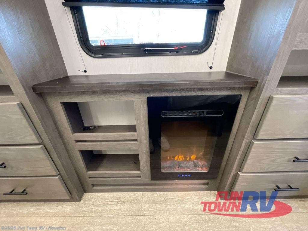 Five slides, a bath and a half, plus sleeping space for six make this fifth wheel the perfect choice! Once you arrive at your destination, prepare lunch on the exterior kitchen. Inside, you'll find a kitchen island, plenty of storage space, plus a free-standing table with chairs and a storage ottoman seat. The front living area will be a favorite place to hang out and this room can double as a bedroom with the two tri-fold sofas. There is also theater seating across from the entertainment center and fireplace, plus storage cabinets for movies or board games. When you're ready to call it a night, head to the master bedroom for a great night's rest on the king bed slide out. You will also love the full rear bath with dual sinks, a spacious shower, plus a closet with stackable washer and dryer prep!