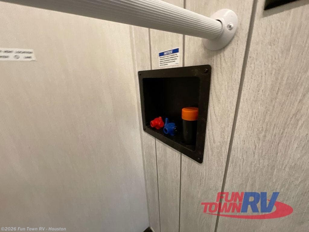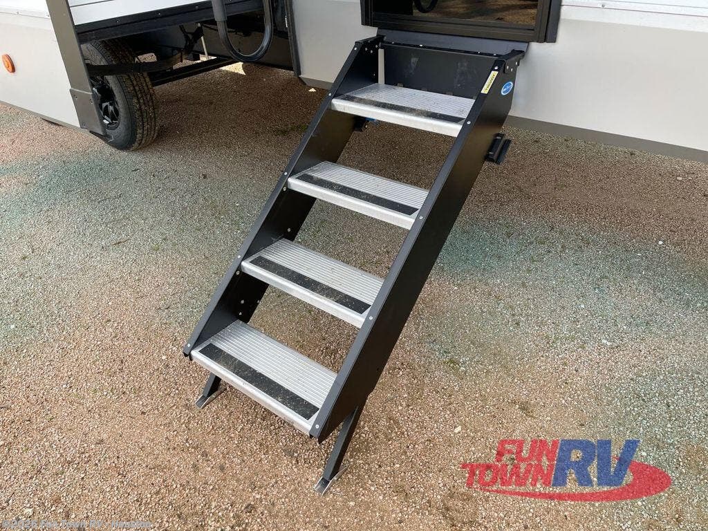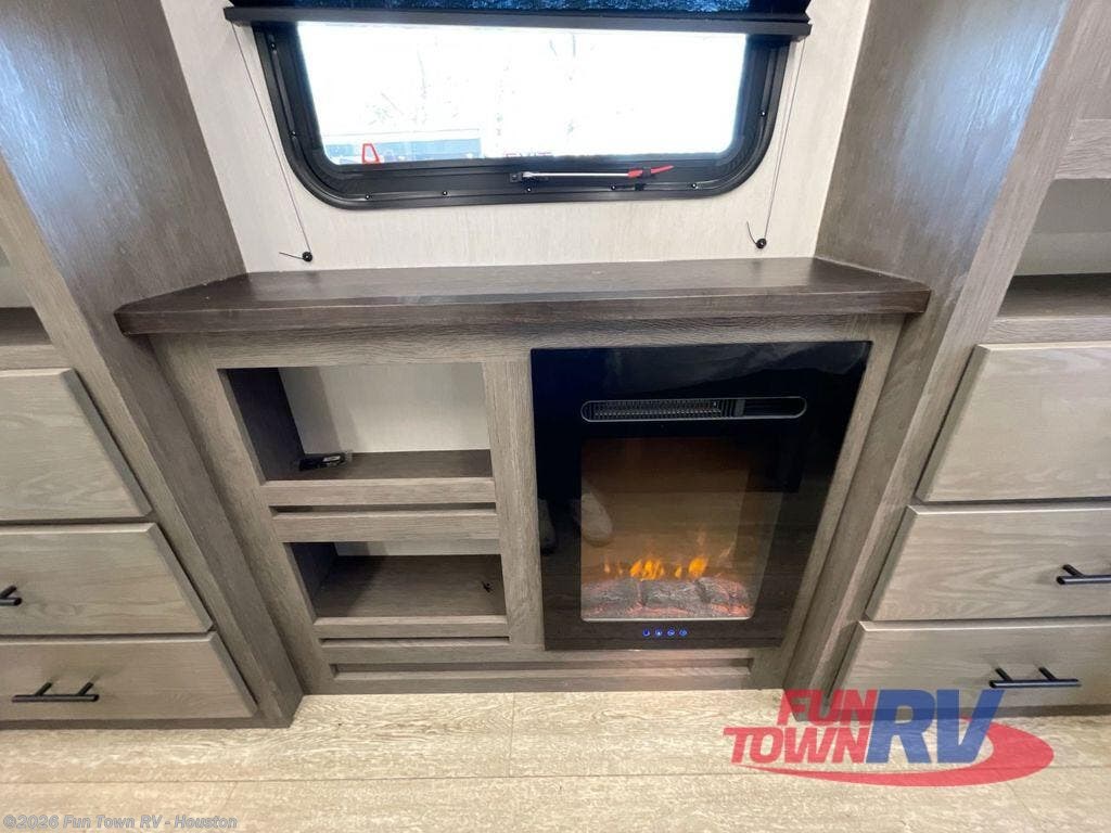 Five slides, a bath and a half, plus sleeping space for six make this fifth wheel the perfect choice! Once you arrive at your destination, prepare lunch on the exterior kitchen. Inside, you'll find a kitchen island, plenty of storage space, plus a free-standing table with chairs and a storage ottoman seat. The front living area will be a favorite place to hang out and this room can double as a bedroom with the two tri-fold sofas. There is also theater seating across from the entertainment center and fireplace, plus storage cabinets for movies or board games. When you're ready to call it a night, head to the master bedroom for a great night's rest on the king bed slide out. You will also love the full rear bath with dual sinks, a spacious shower, plus a closet with stackable washer and dryer prep!