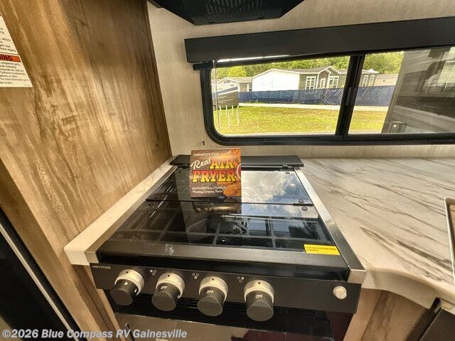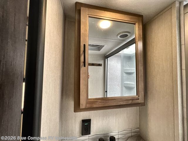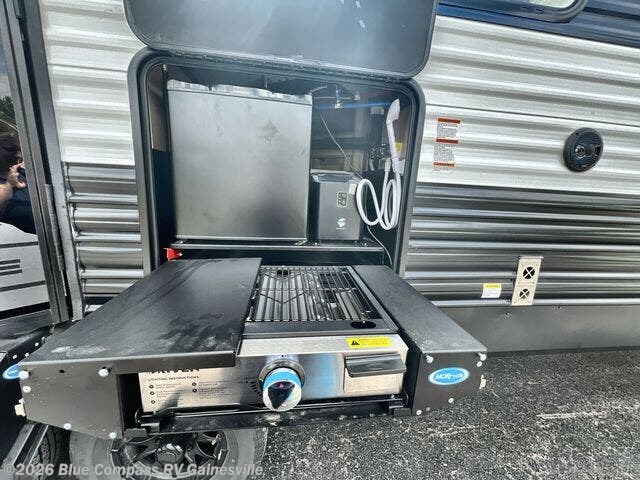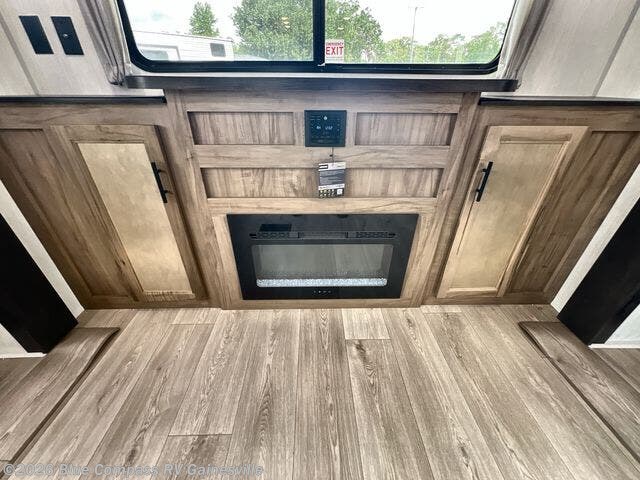 If you enjoy a little privacy, affordable luxury and a livable trailer, look no further! This separate living area includes a rear wall entertainment center, a fireplace and a panoramic window, plus dual opposing sofa slides and two chairs. The kitchen is separate as well and is located in the middle of the trailer giving everyone easy access to the food in the residential refrigerator and large full door pantry. The cook can choose to make meals outside as well on the outdoor kitchen and there is storage along the outside. You will surely enjoy the full bathroom that includes a shower with a seat after a long trail walk. And the master bedroom offers dual wardrobes, a walk-around queen bed, and a closet prepped for a washer/dryer option.