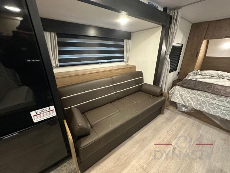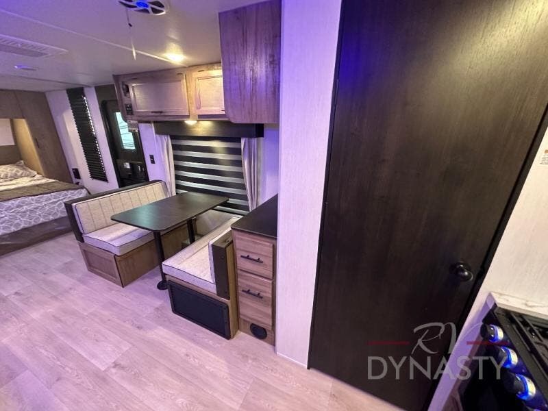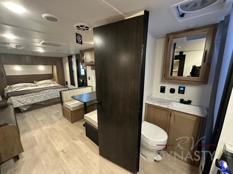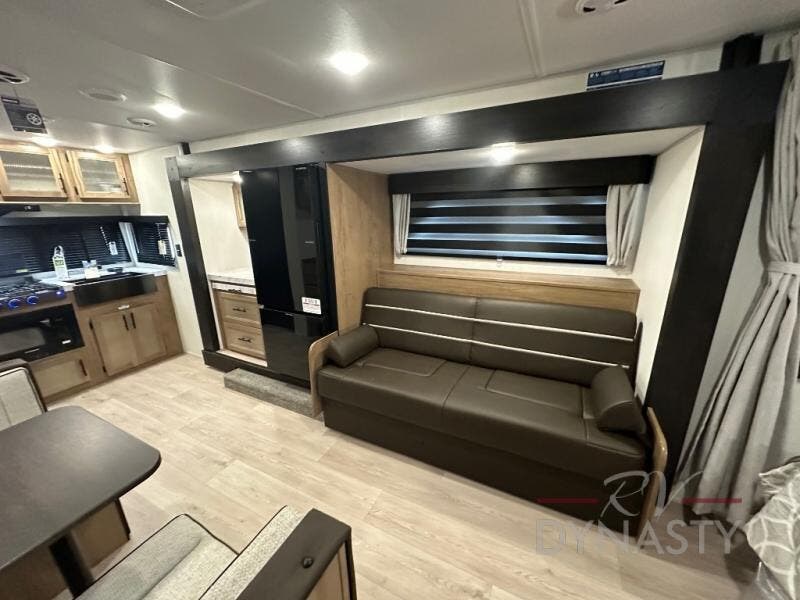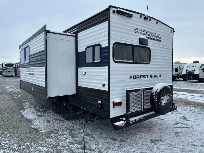You will love traveling with this Cherokee Grey Wolf in tow. This is a great unit for a couple or family as the booth dinette and sofa can both be used for added sleeping for children or quests if needed. There is a comfortable RV king bed up front that you will love for a great night's rest with storage space in nightstands and wardrobes for your clothing and things on either side of the bed. A cooktop and air fryer is available for cooking inside, and the rear corner bath includes a tub/shower, toilet and sink. A nice 15' awning creates more outdoor living space to enjoy protected from the elements both day and night with an LED light strip for after dark. You can also add a TV on the exterior as it has an outside TV mount.