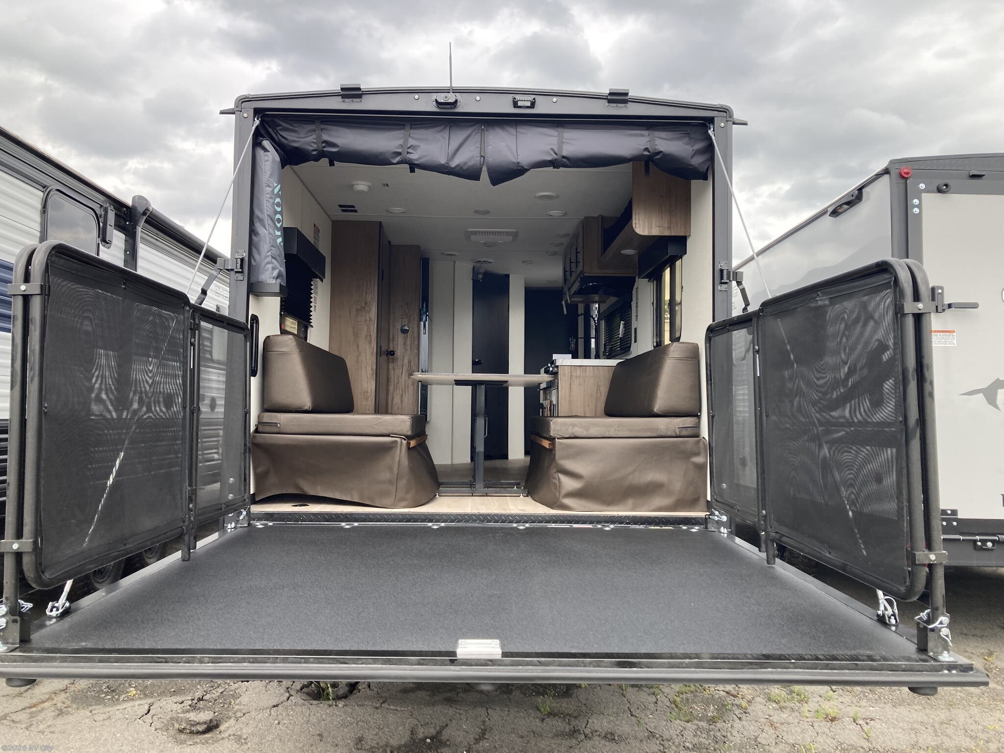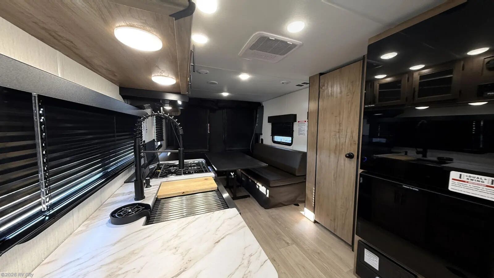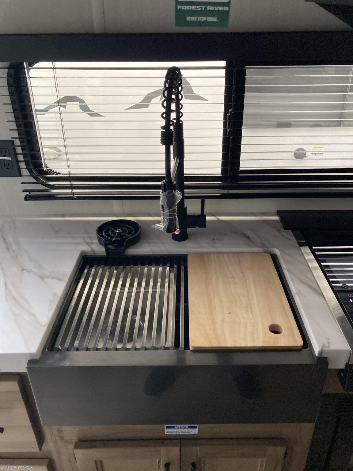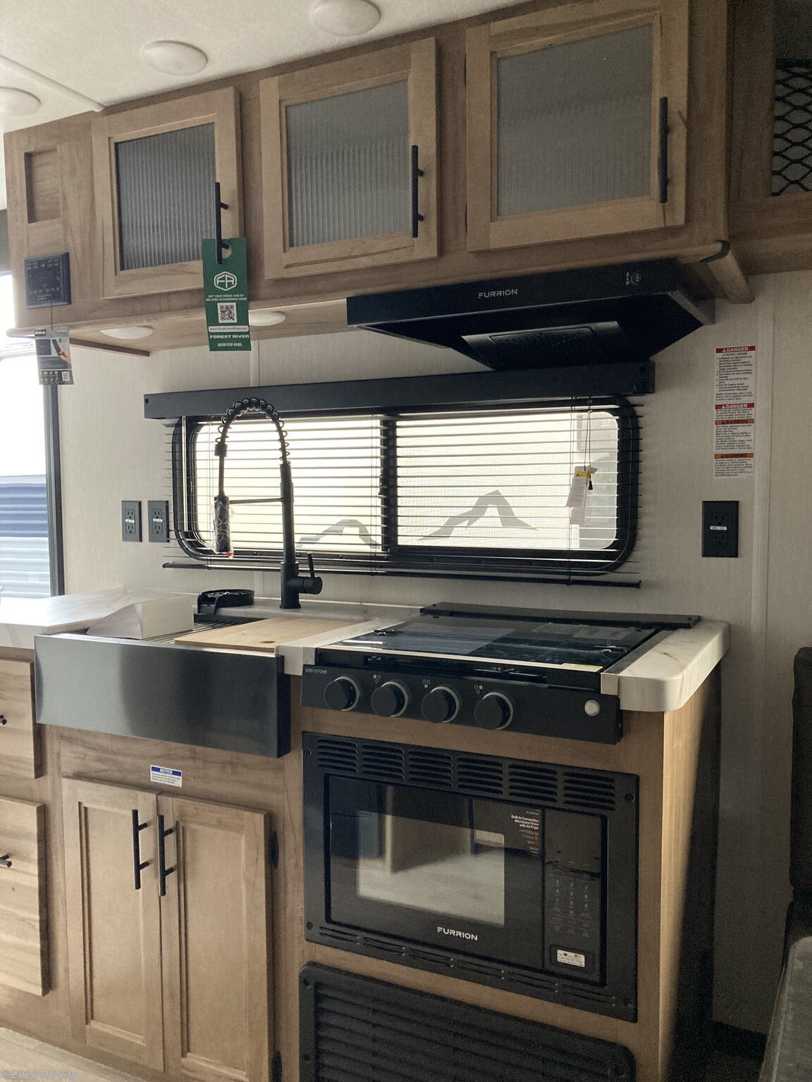 The Cherokee Grey Wolf 22RR by Forest River is the ultimate RV for outdoor enthusiasts. The spacious toy hauler garage, with a convertible rear ramp, provides ample space for toys and gear. The outdoor kitchen, shower, and patio area offer a luxurious outdoor living experience. Inside, you'll find a comfortable bedroom with a walk-around queen bed and a well-appointed bathroom. The modern kitchen, with its black stainless steel farm sink and sink cover, is perfect for cooking and entertaining.