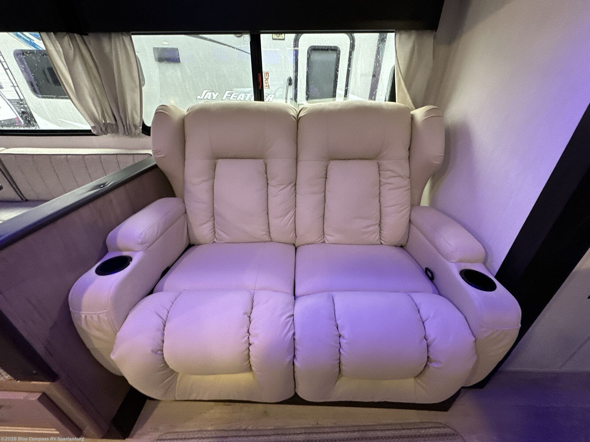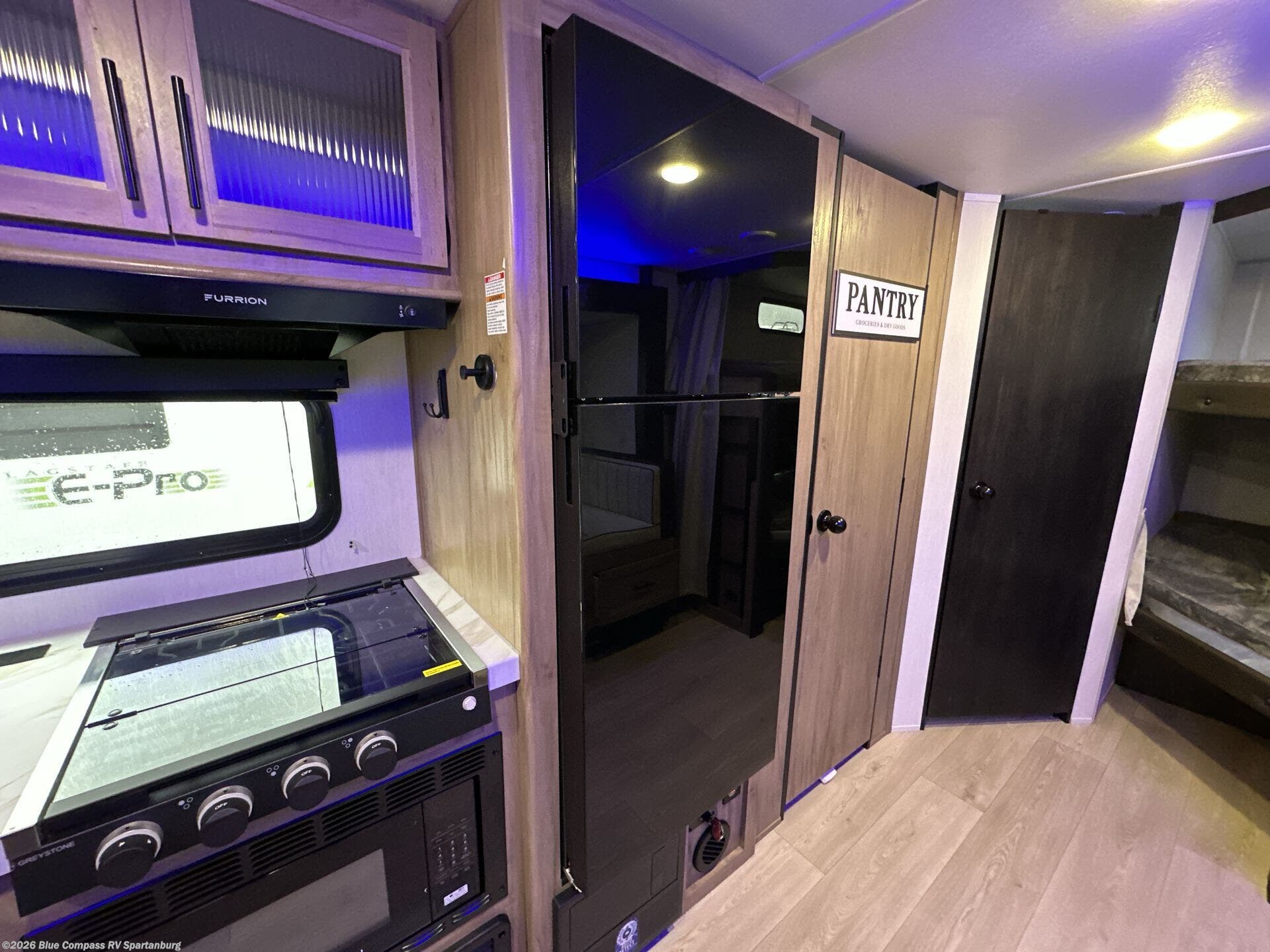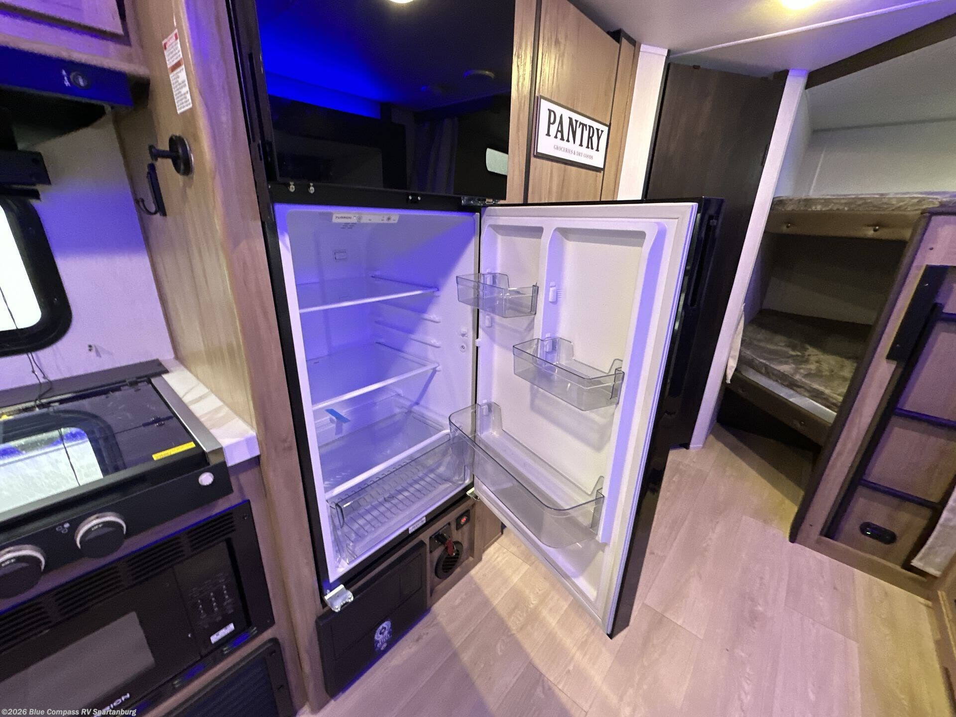 Come on inside this Cherokee Grey Wolf travel trailer and experience the convenience of a smooth flow of traffic in and out with two entry doors. The rear door leads into a full bath which is great for accessibility. Once inside, you will notice the large U-shaped dinette and the sofa which sit on the slide and create a spacious footprint for moving about, as well as great places to play games and socialize with your friends and family. A walk-in pantry provides plenty of storage allowing you to stock up on your favorite snacks and dry goods for your family adventure. At night, there is sleeping space for everyone between the double-size bunks and the RV king bed, plus the furniture.