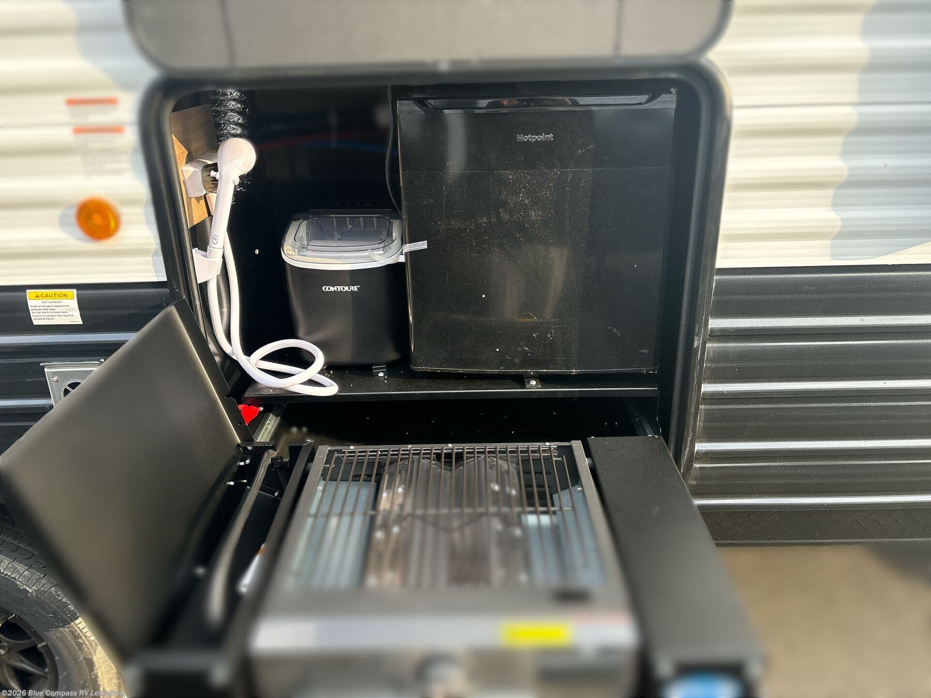 You and your spouse will have a fun time camping in this travel trailer! You will find all of the comforts you need with plenty of livable space including a U-shaped dinette slide. There is also a sofa for more seating when company arrives with a shelf above for your books. The spacious full rear bathroom has a shower with a skylight for more head room and natural lighting. You will find ample storage for clothing in the wardrobes that are above handy nightstands for your personal things on either side of the RV king bed in the front private bedroom. There is even an outside kitchen protected by the 15' awning!