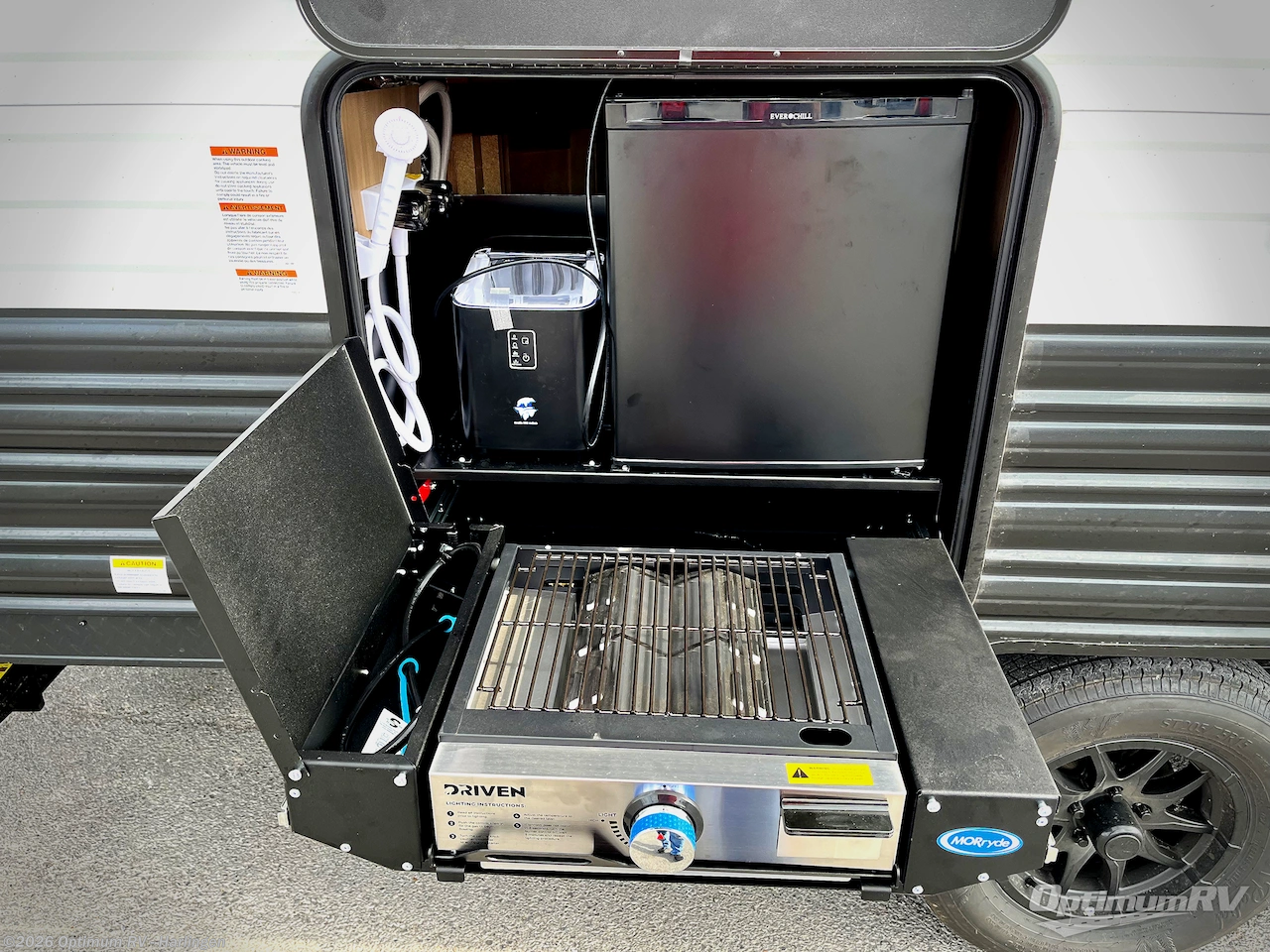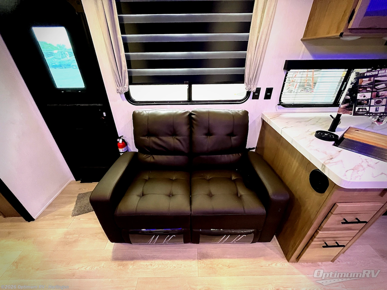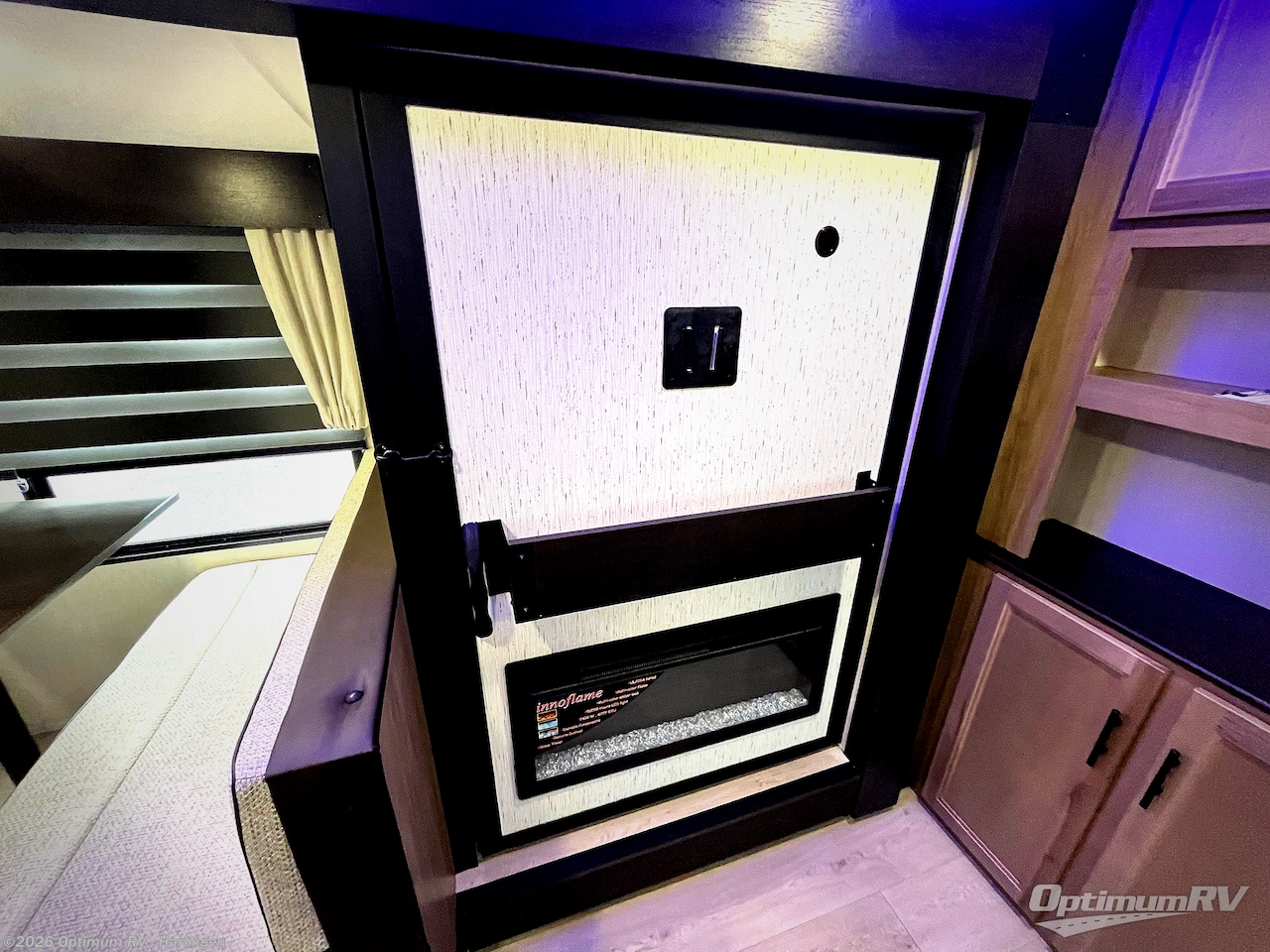 You'll love every minute spent in this single slide out travel trailer, whether you're cooking dinner on the outside kitchen or in the rear kitchen, relaxing on the sofa across from the fireplace, or sleeping on the RV king bed in the front master bedroom! There are hidden shelves behind the fireplace for convenient storage, and the booth dinette within the slide provides a place to dine together. The walk-thru bath is spacious, and includes a tub/shower, toilet, and sink with counter space.